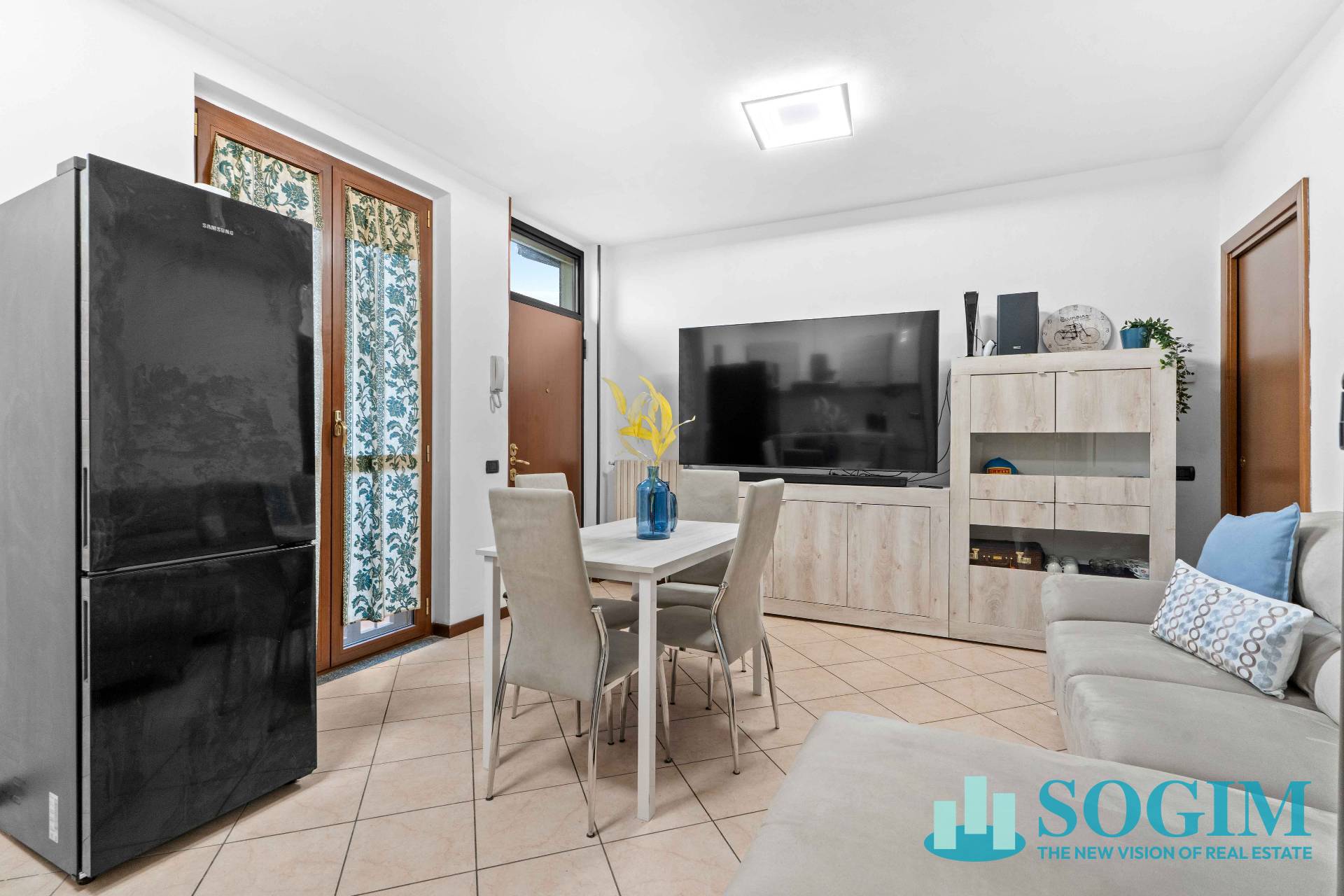 Entrando nell'abitazione veniamo accolti nel soggiorno con cucina a vista.