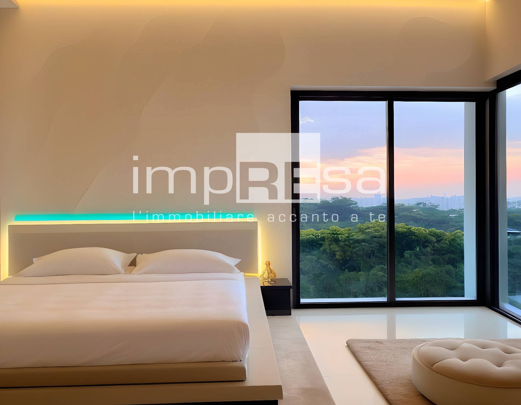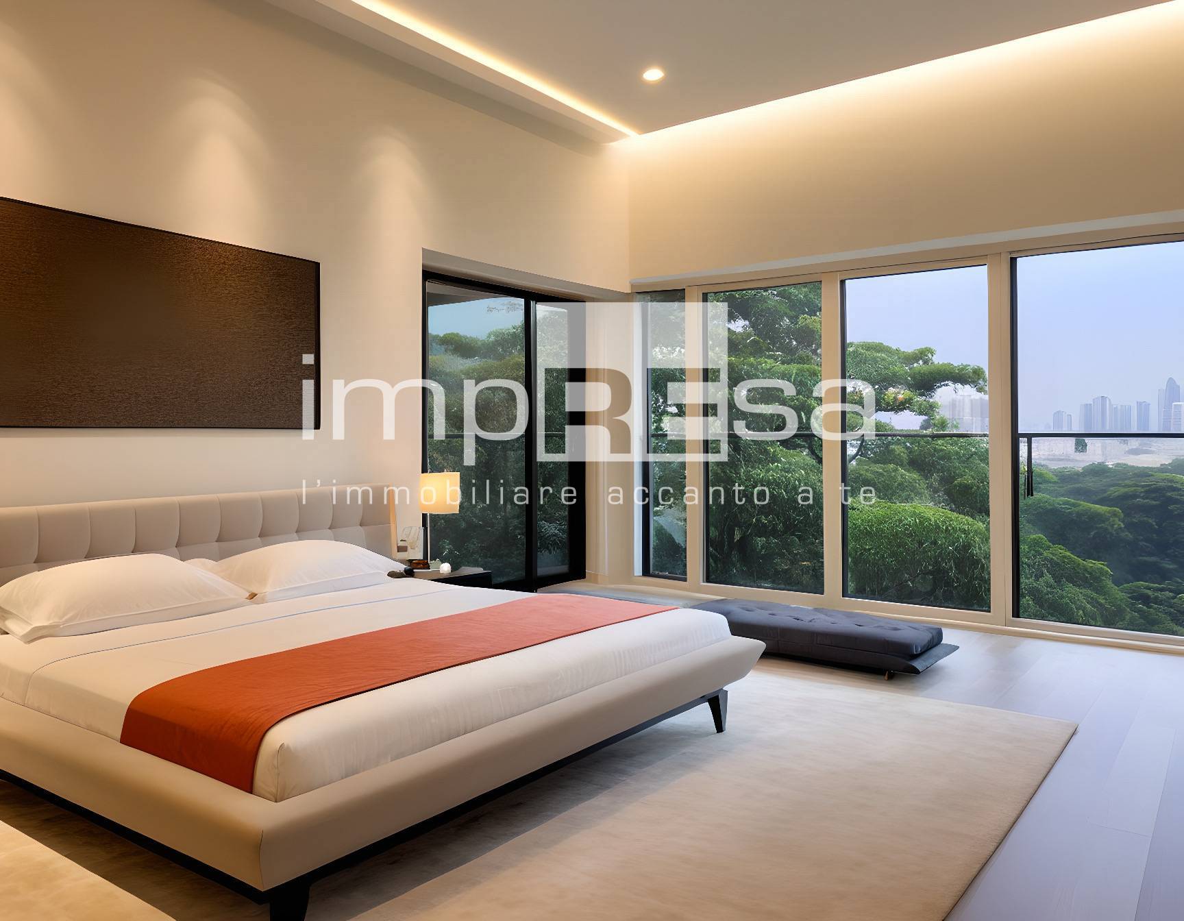 Proseguendo verso la zona notte, troviamo un disimpegno che porta alla camera matrimoniale di 14,20 metri quadri con un bagno finestrato privato di 4,12 metri quadri, unulteriore camera da letto di 9 metri quadri e uno studio di 6 metri quadri.