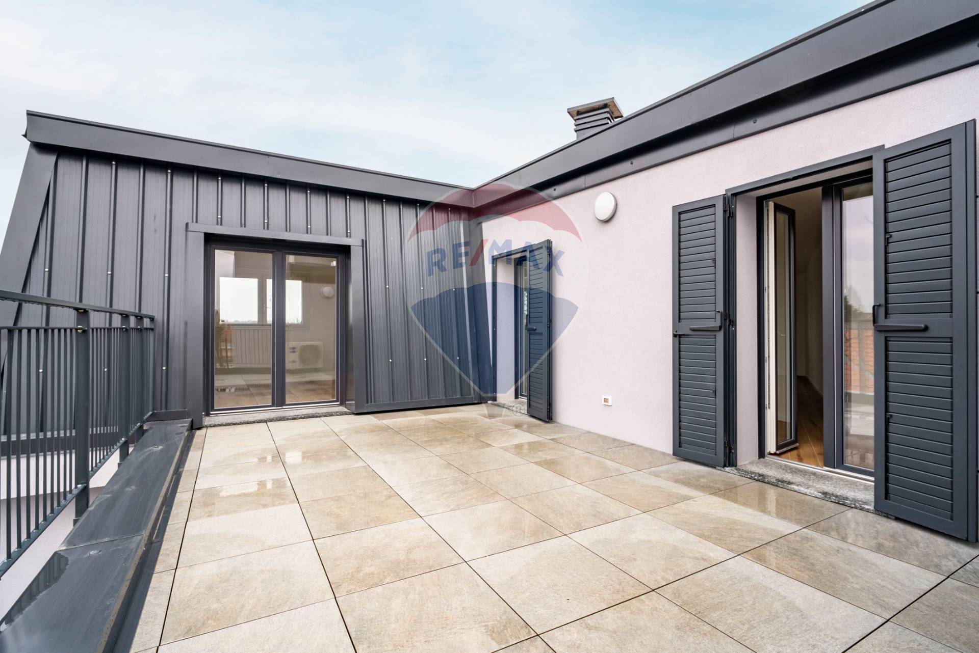 Terrazzo di generose metrature con triplo accesso (soggiorno, cucina, camera matrimoniale). L'abitazione dotata di impianto di aria condizionata e pompa di calore, predisposizione impianto d'allarme, riscaldamento a pavimento, piano cottura ad induzione.