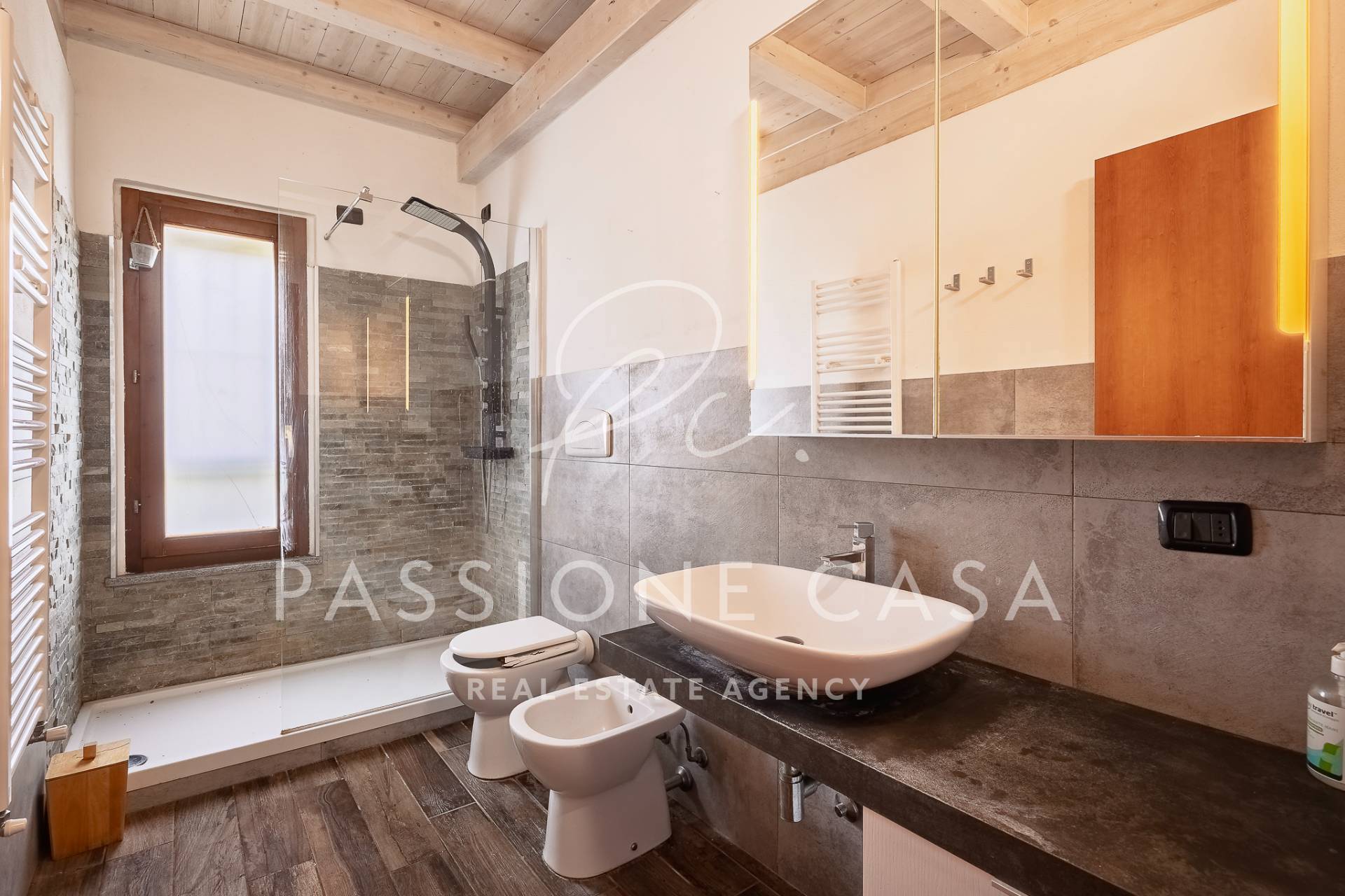 Gli interni sono valorizzati dalle travi a vista, che donano calore e carattere agli spazi.