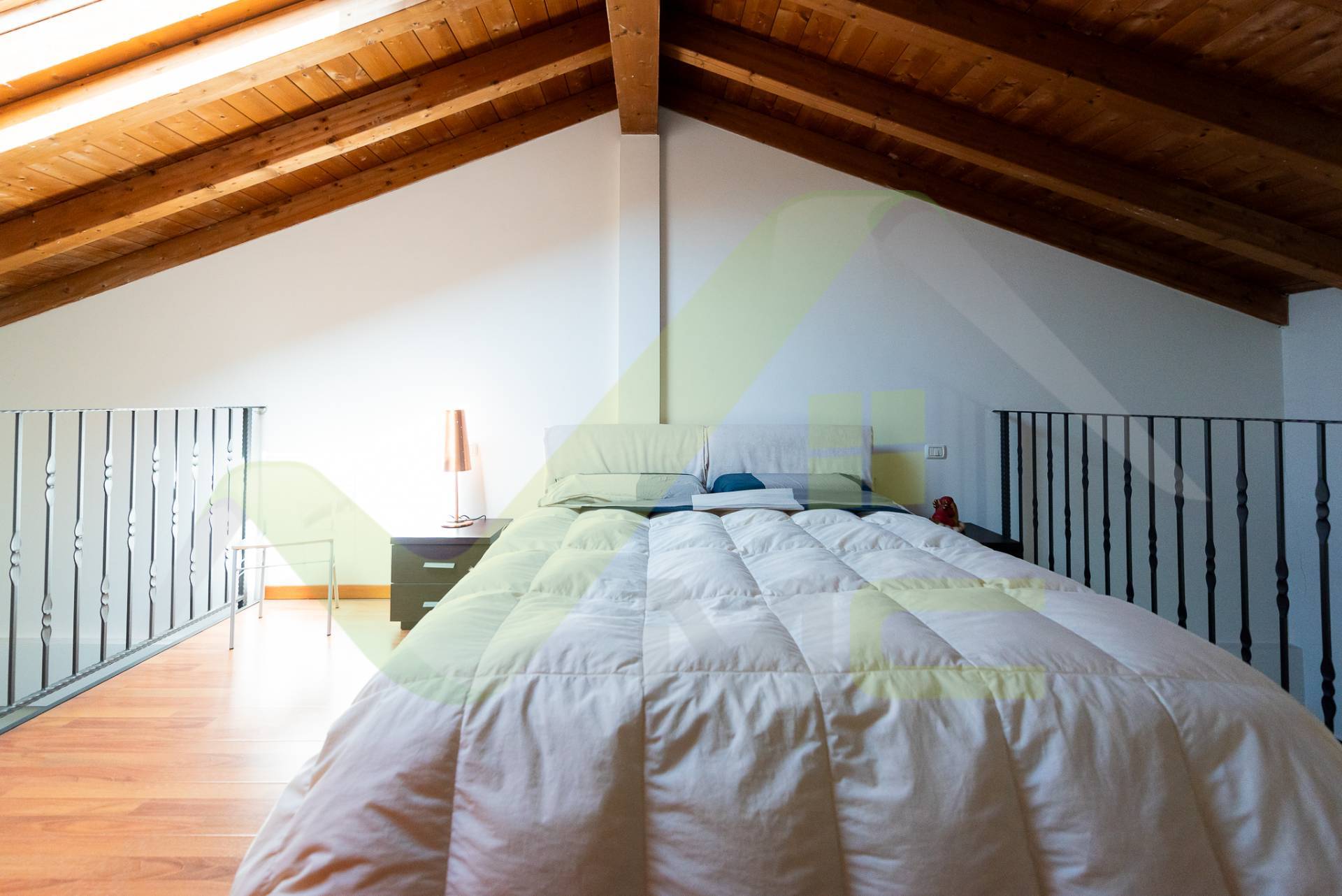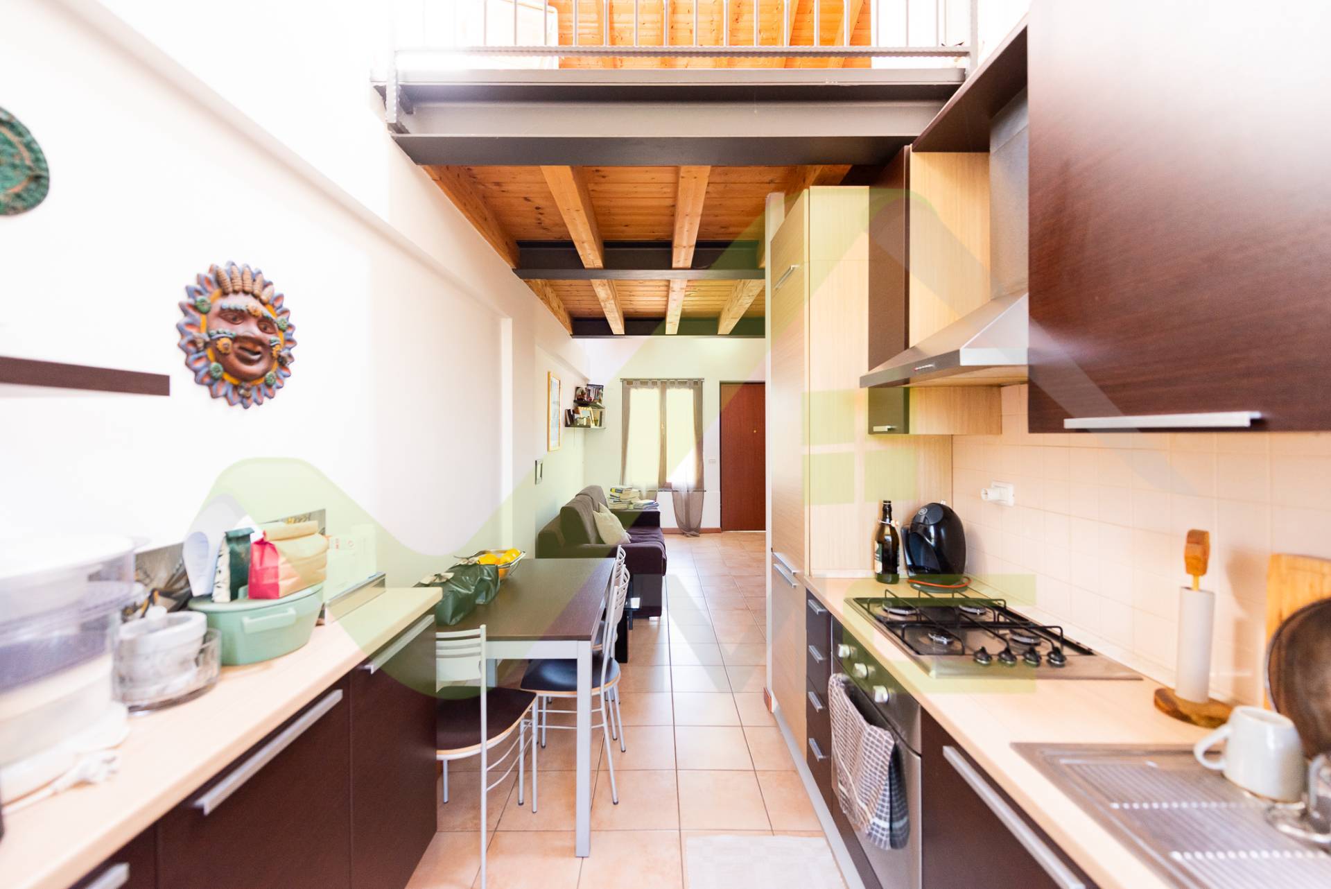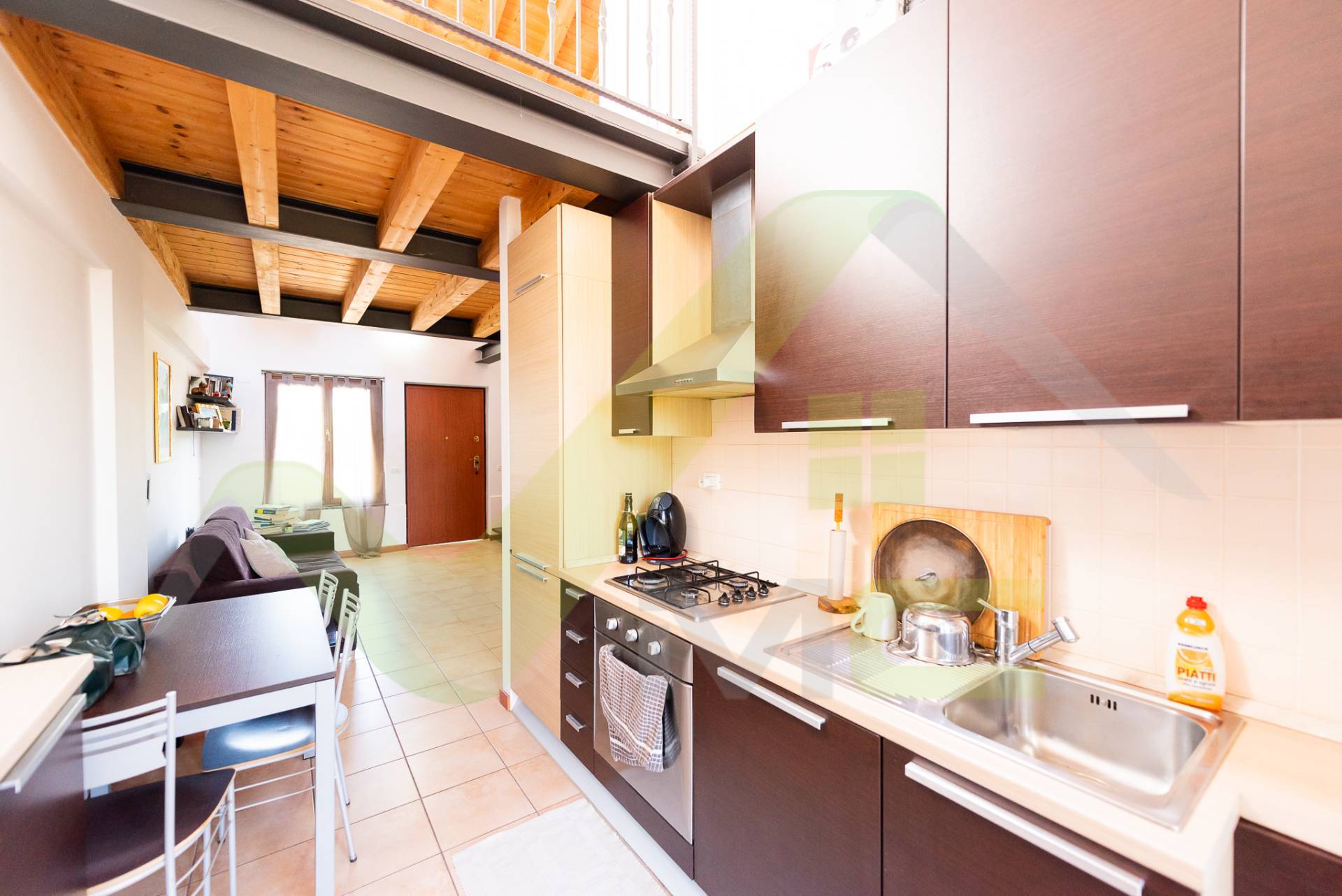 Il cuore della casa il soggiorno con cucina a vista, impreziosito da un suggestivo soppalco in legno dedicato alla zona notte con cabina armadio.