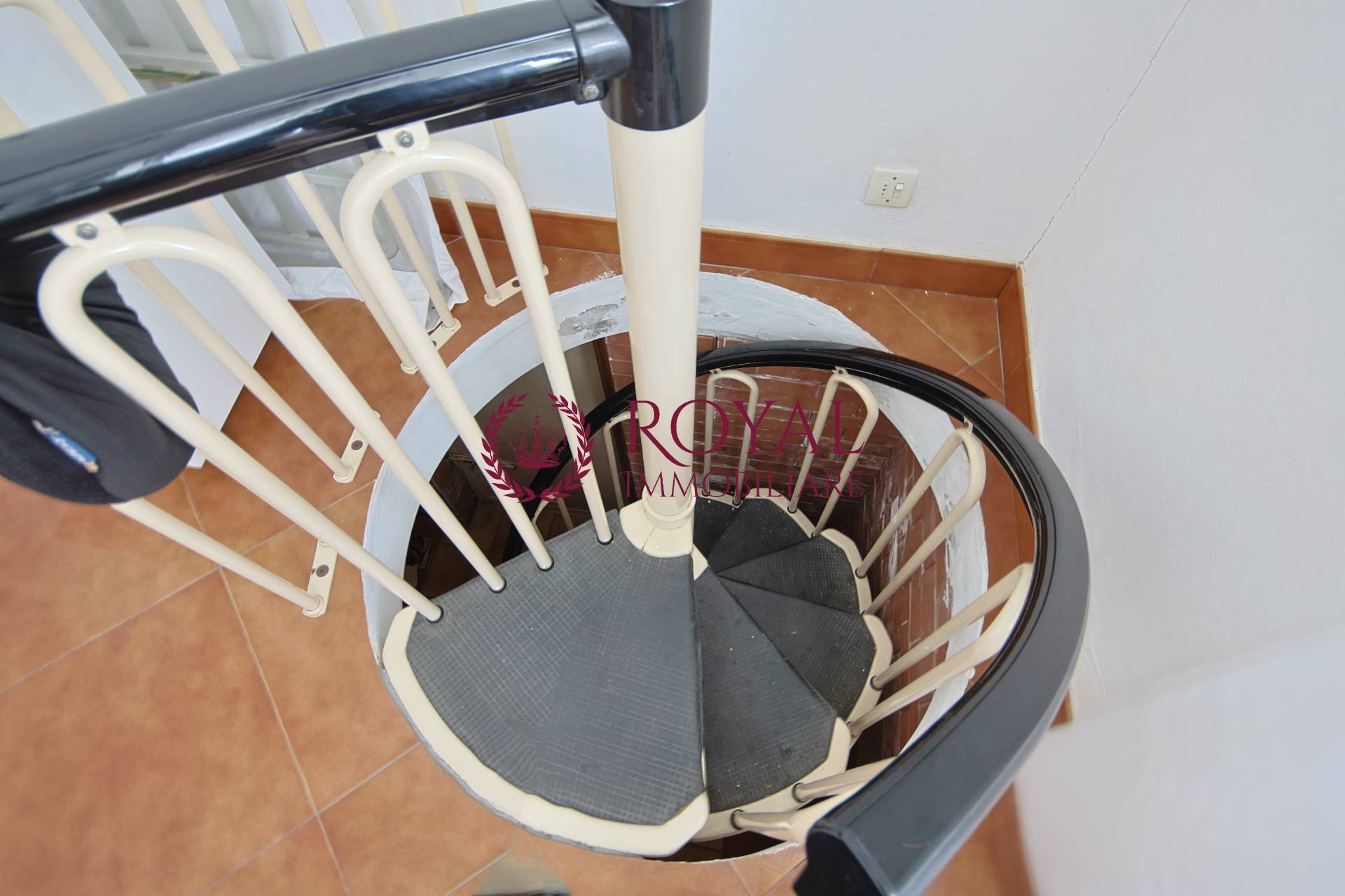 L ' immobile presenta un doppio ingresso, sia indipendente che dal condominio composto da un salone con una scala a chiocciola per accedere alla cantina cucina con balcone verandato, tre camere matrimoniali di cui una con bagno in camera, altro bagno finestrato, ripostiglio.