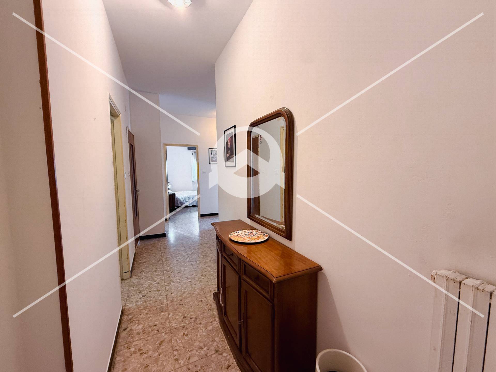 Lingresso, accolto da un comodo corridoio, conduce ad un ampio soggiorno ben distribuito, ad un cucinotto indipendente, a due spaziose camere da letto ed ad un pratico ripostiglio.