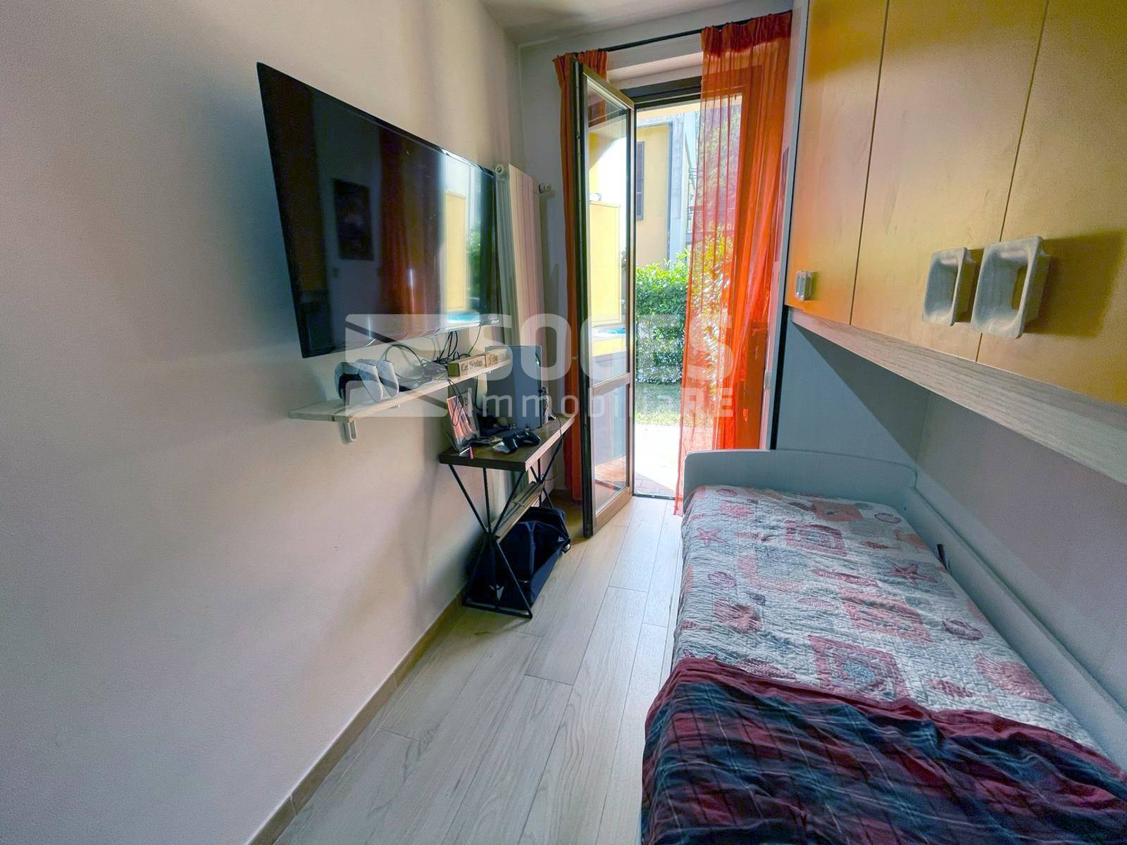 Si compone di soggiorno con angolo cottura, di accesso alla porzione pi grande di giardino, ampio servizio, camera matrimoniale e camera singola; dalle camere si accede al giardino pi piccolo e al secondo cancellino di ingresso alla propriet.