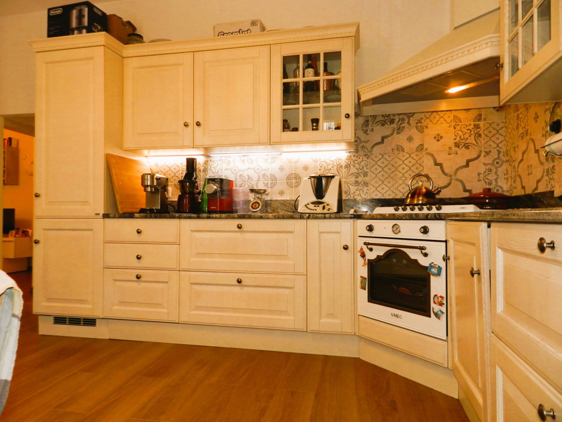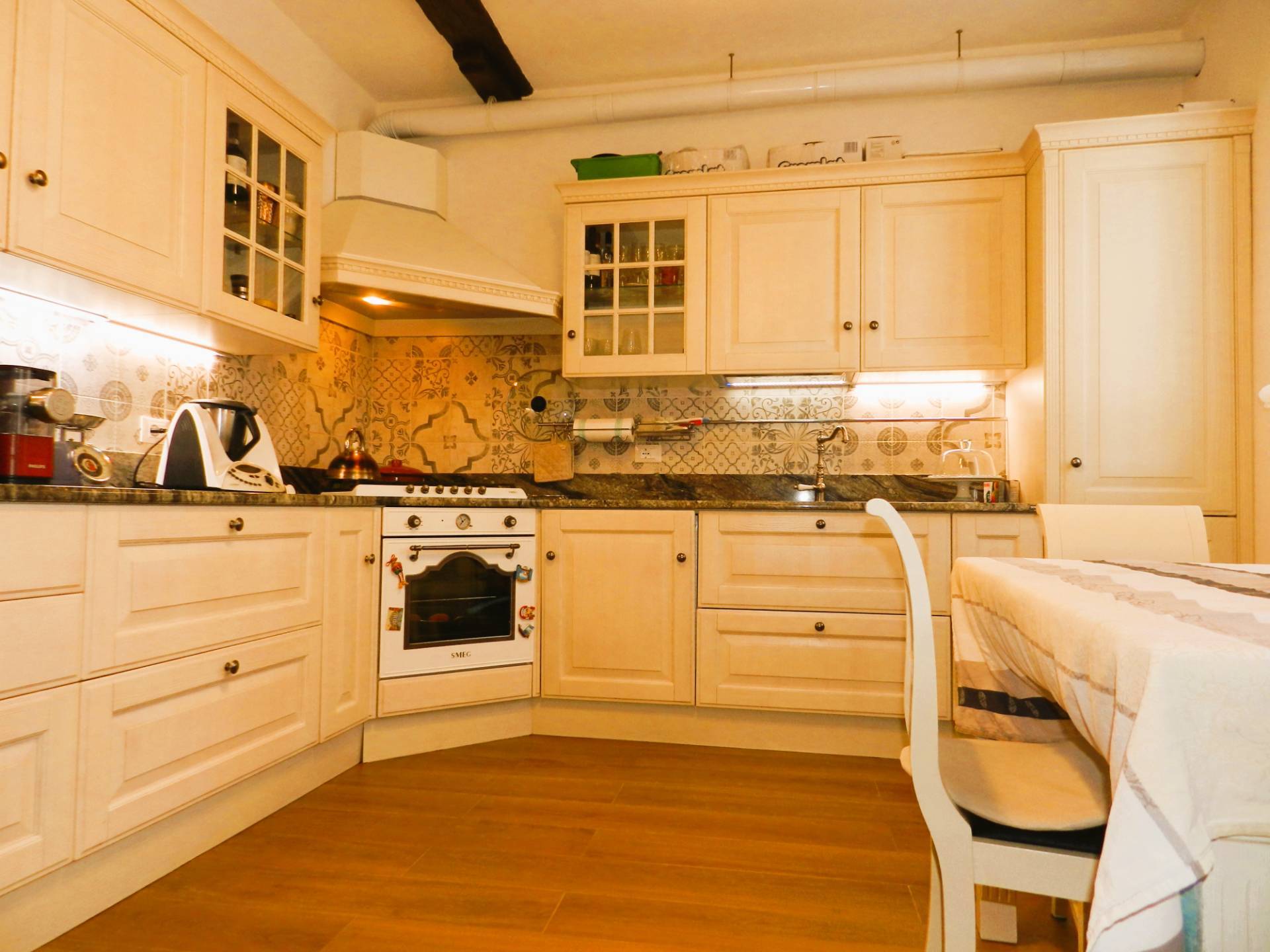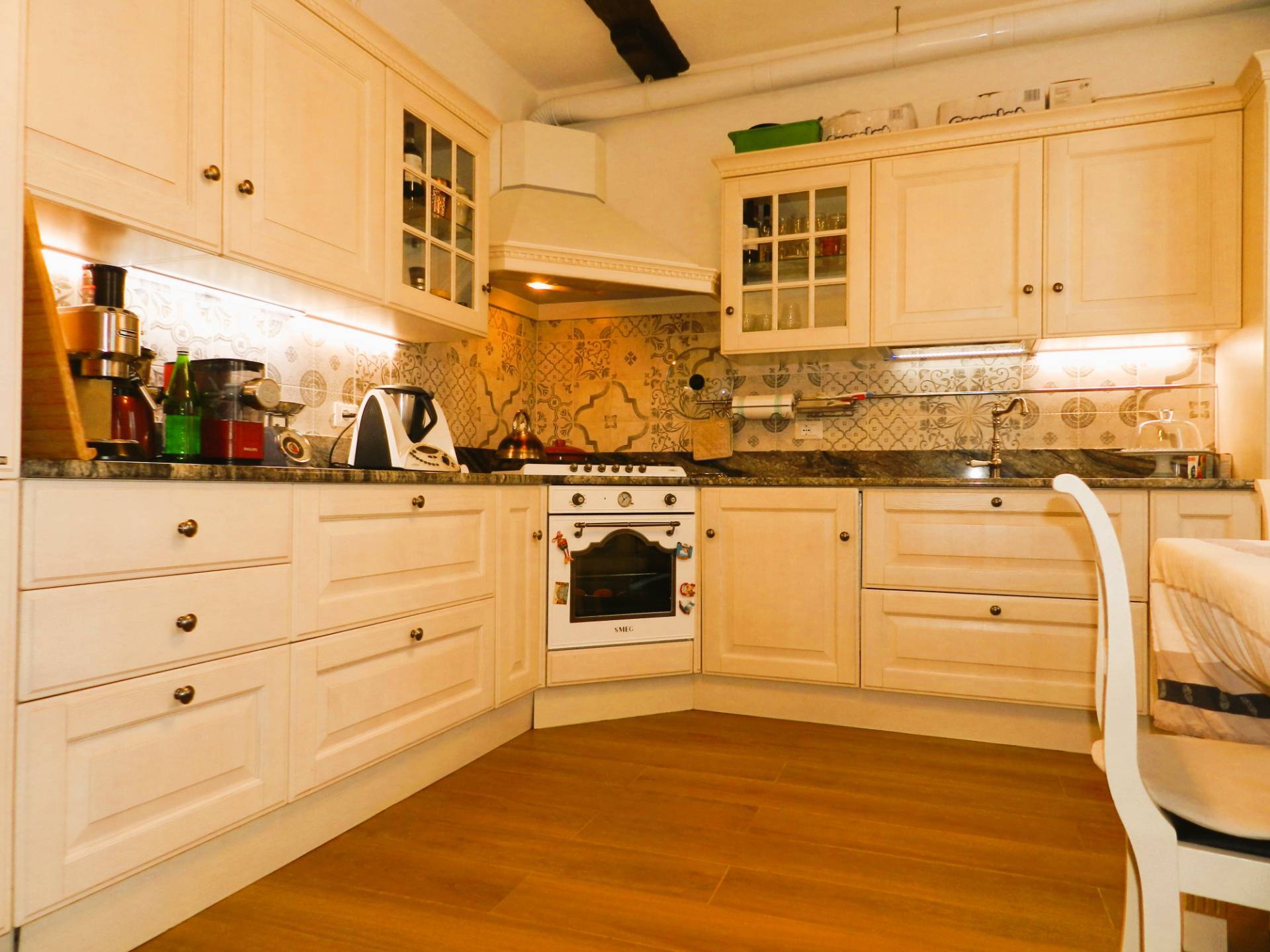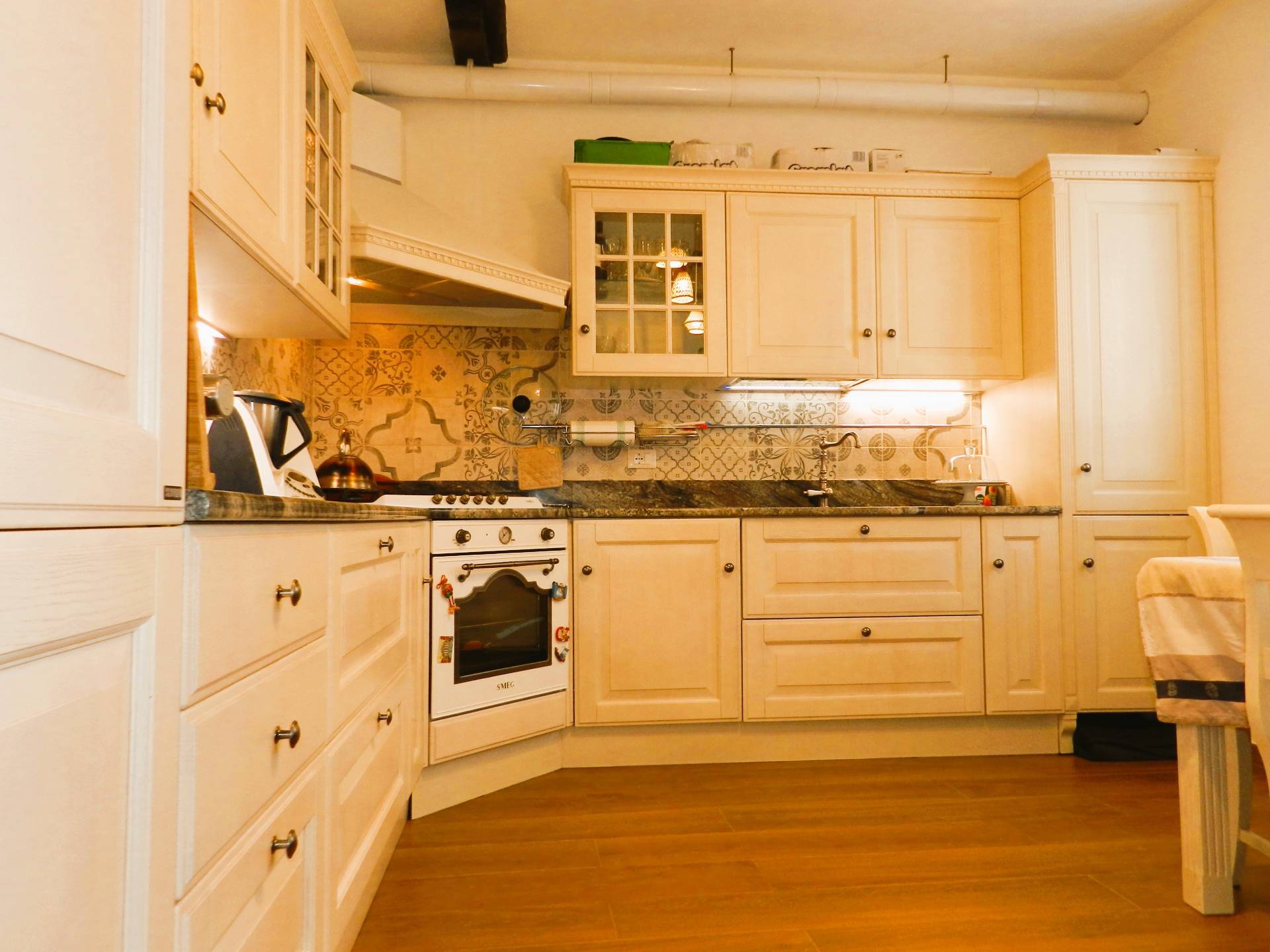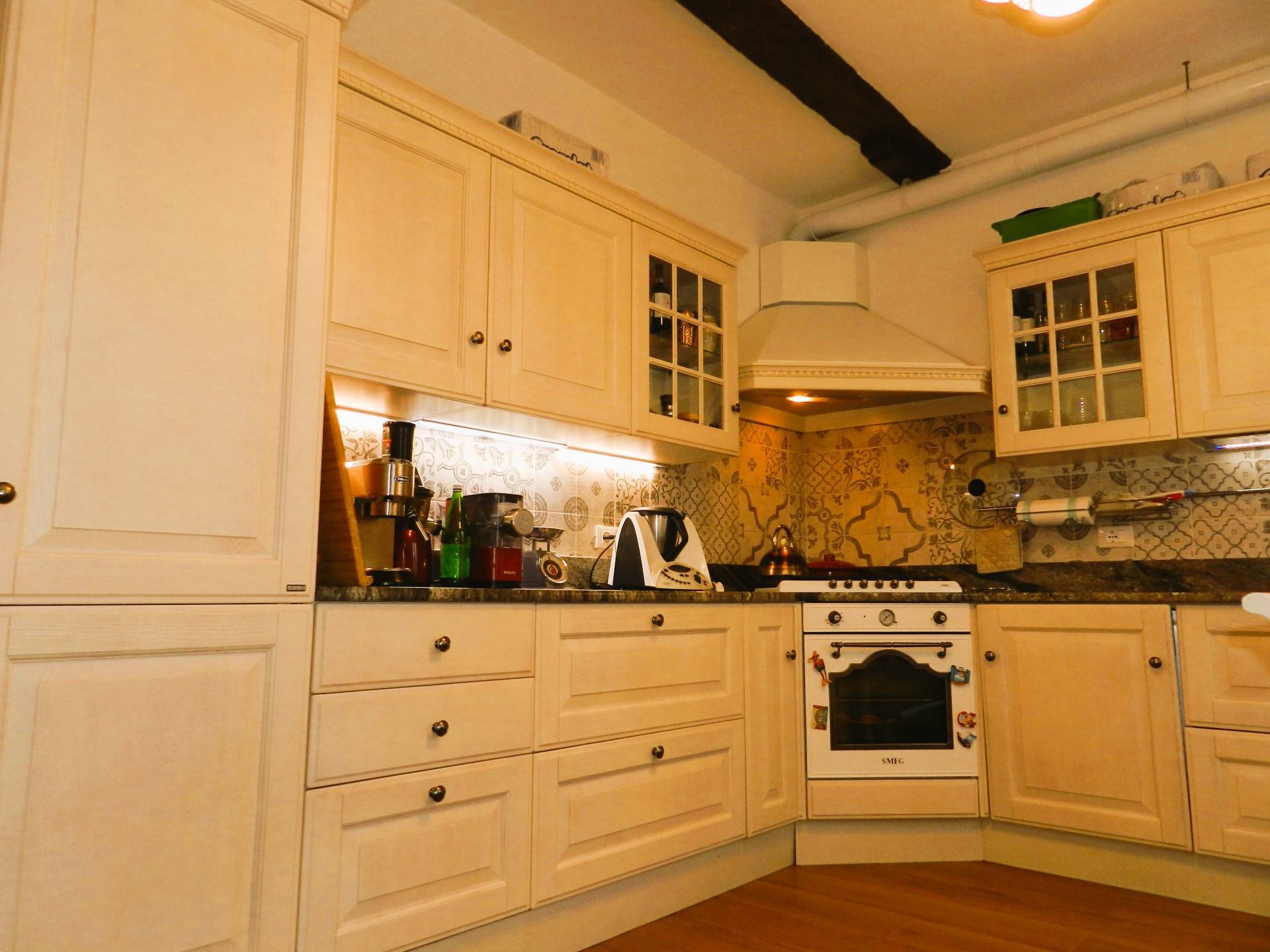 La zona giorno composta da un ampio soggiorno con camino oltre ad un angolo studio, la cucina separata, abitabile arredata con una cucina classica "Scavolini", che ben si integra nell'ambiente in cui stata ricavata.