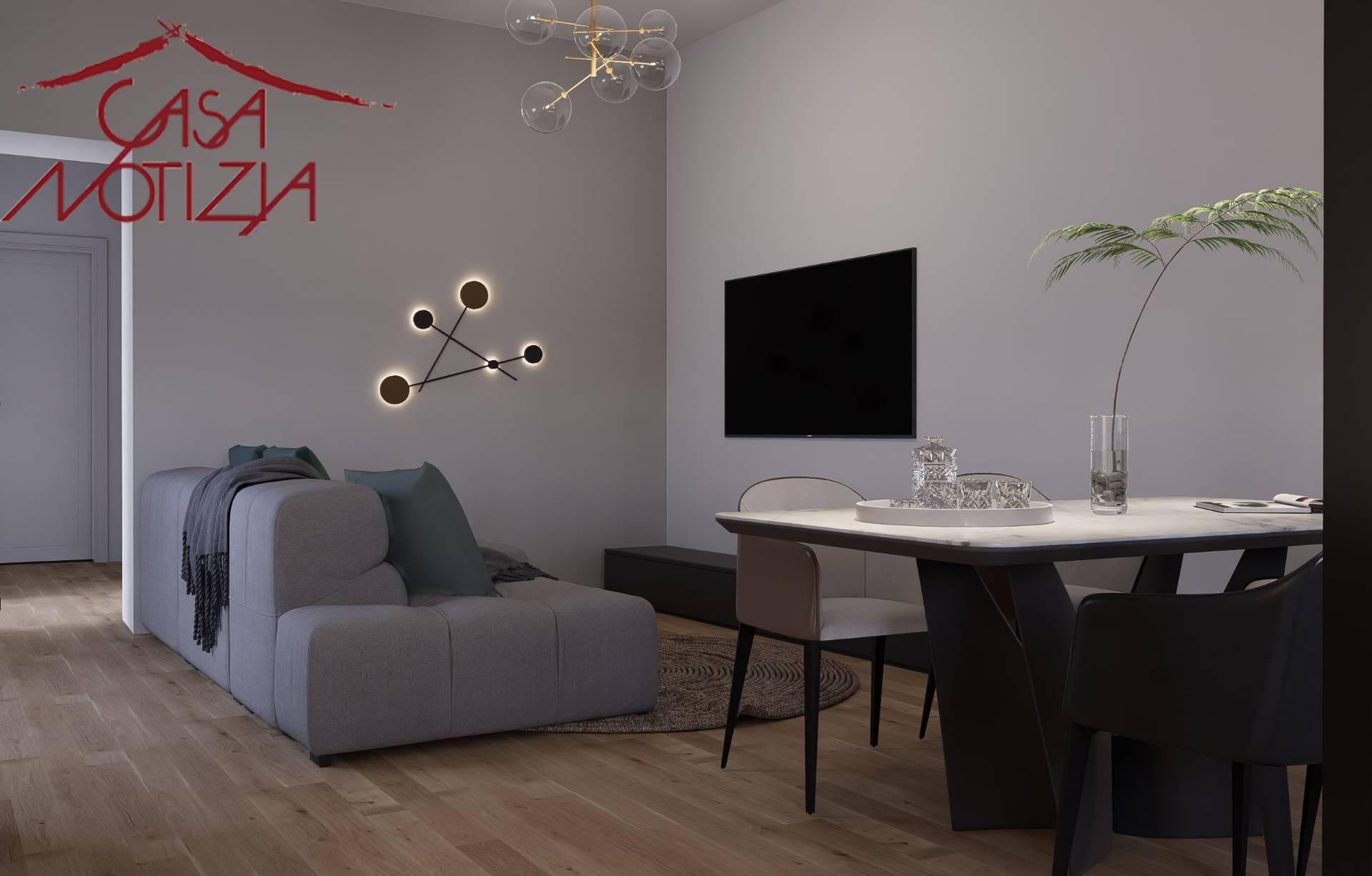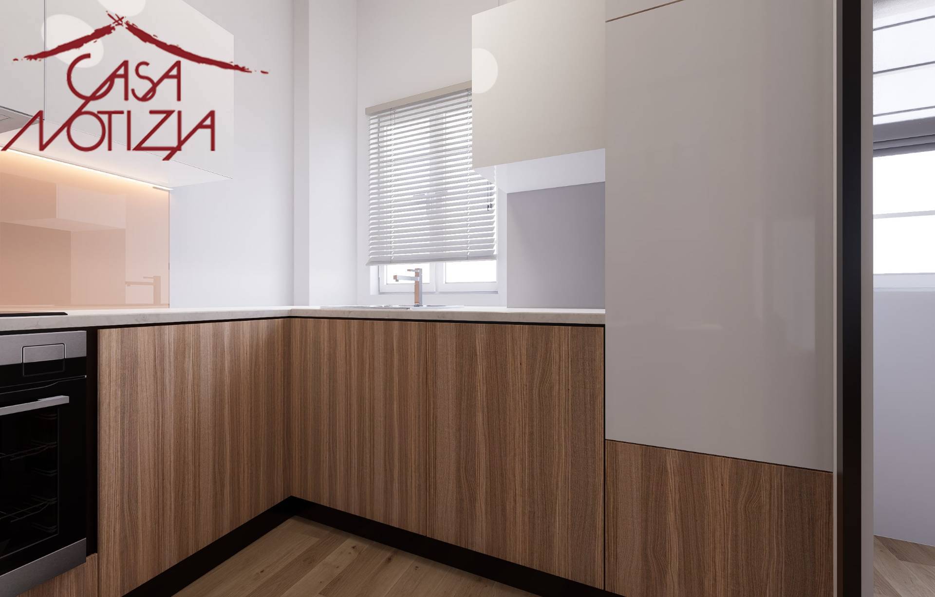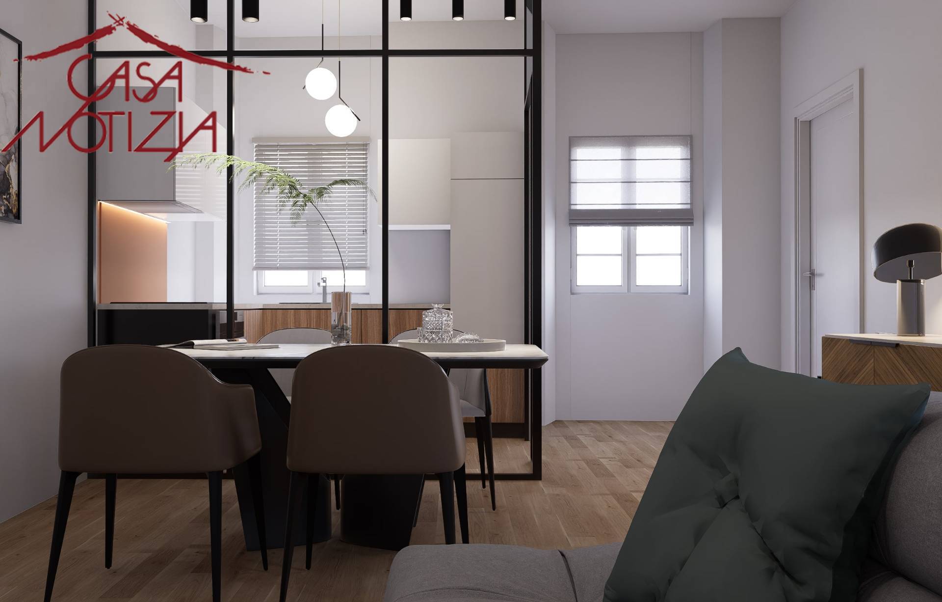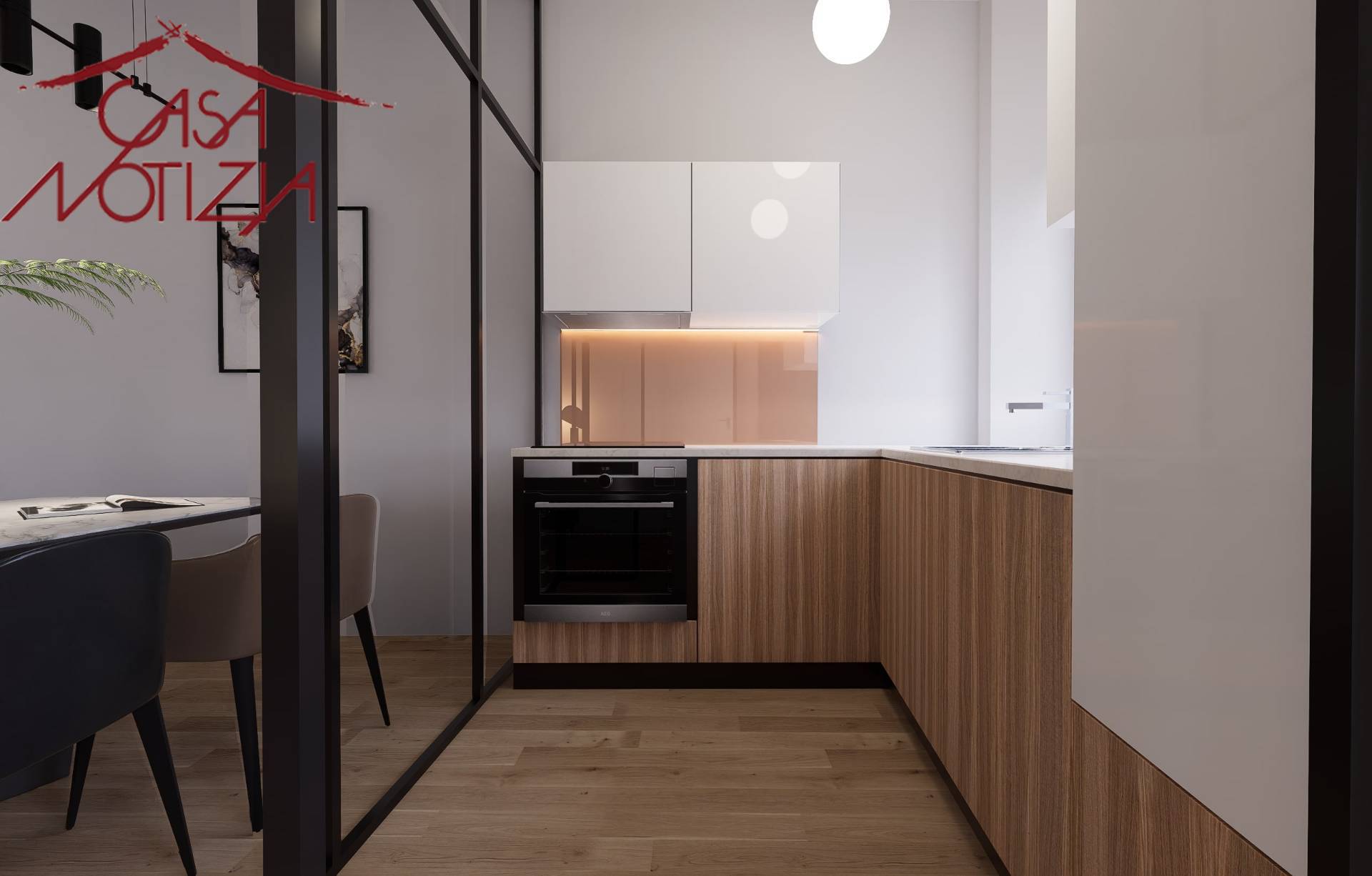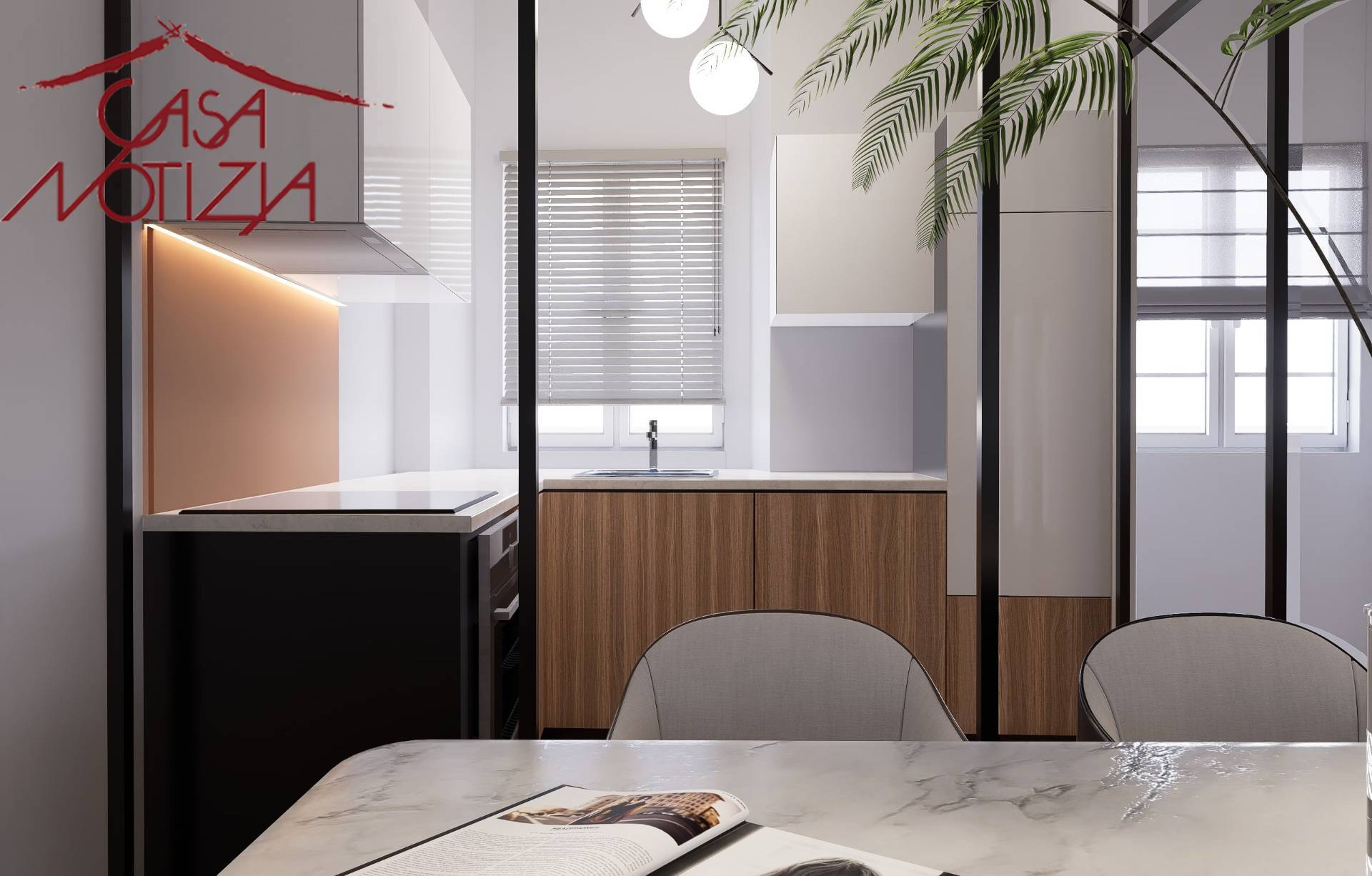 La cucina separata dal soggiorno tramite una raffinata parete vetrata, mantenendo un'atmosfera di convivialit e continuit visiva, pur concedendo un ambiente dedicato ai sapori e ai profumi della cucina.