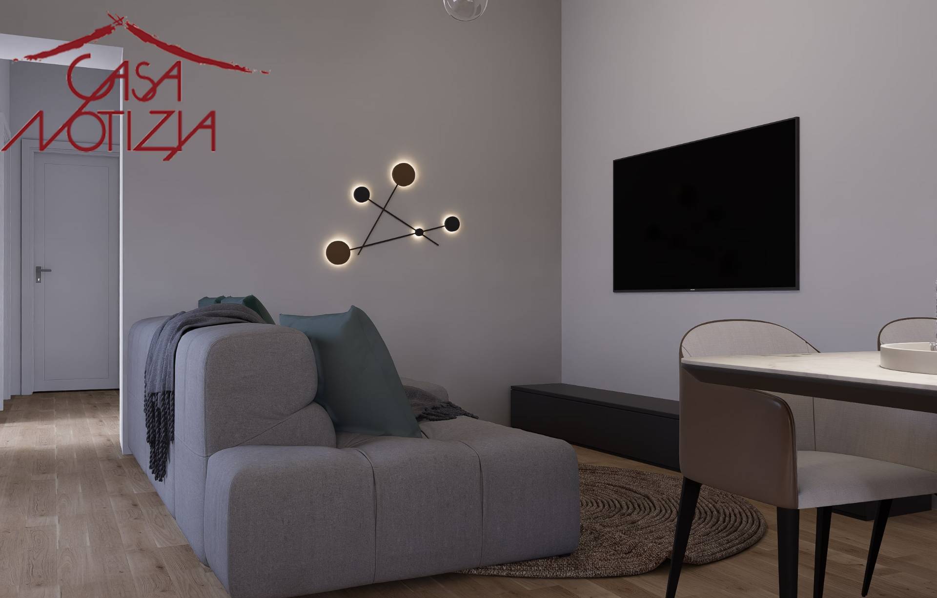 Si compone da ingresso che ci immerge immediatamente in un disimpegno a L, cuore nevralgico dell'appartamento, che si apre sul bagno principale.