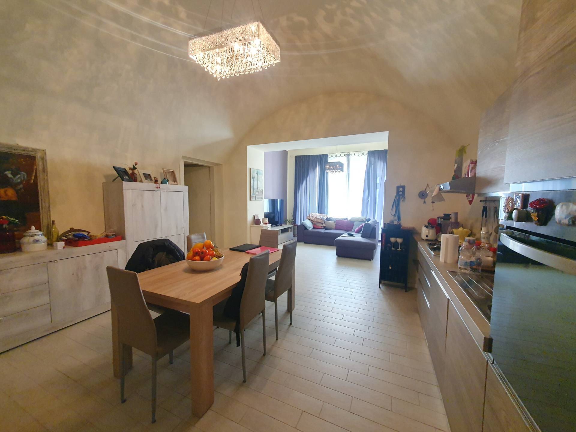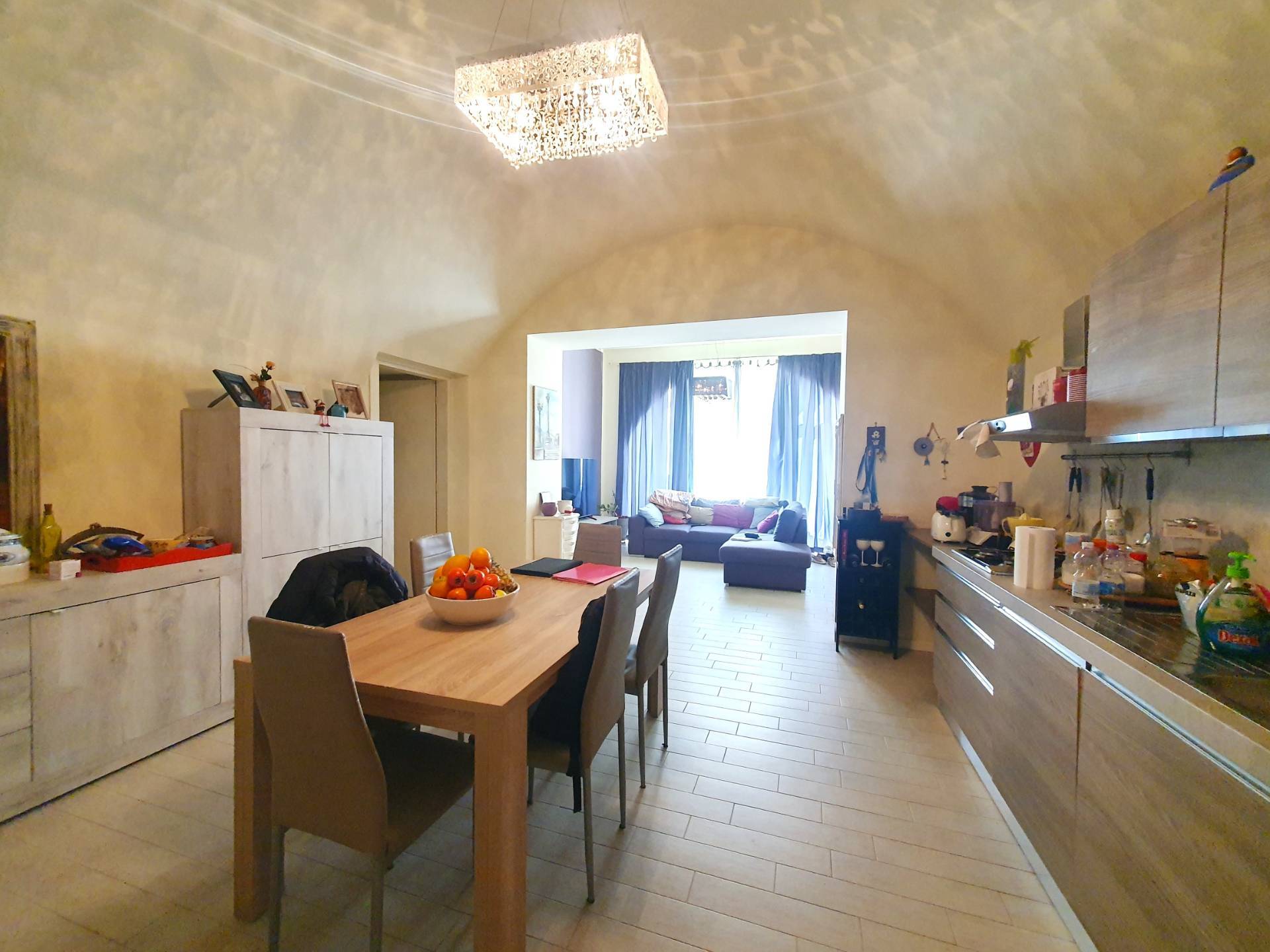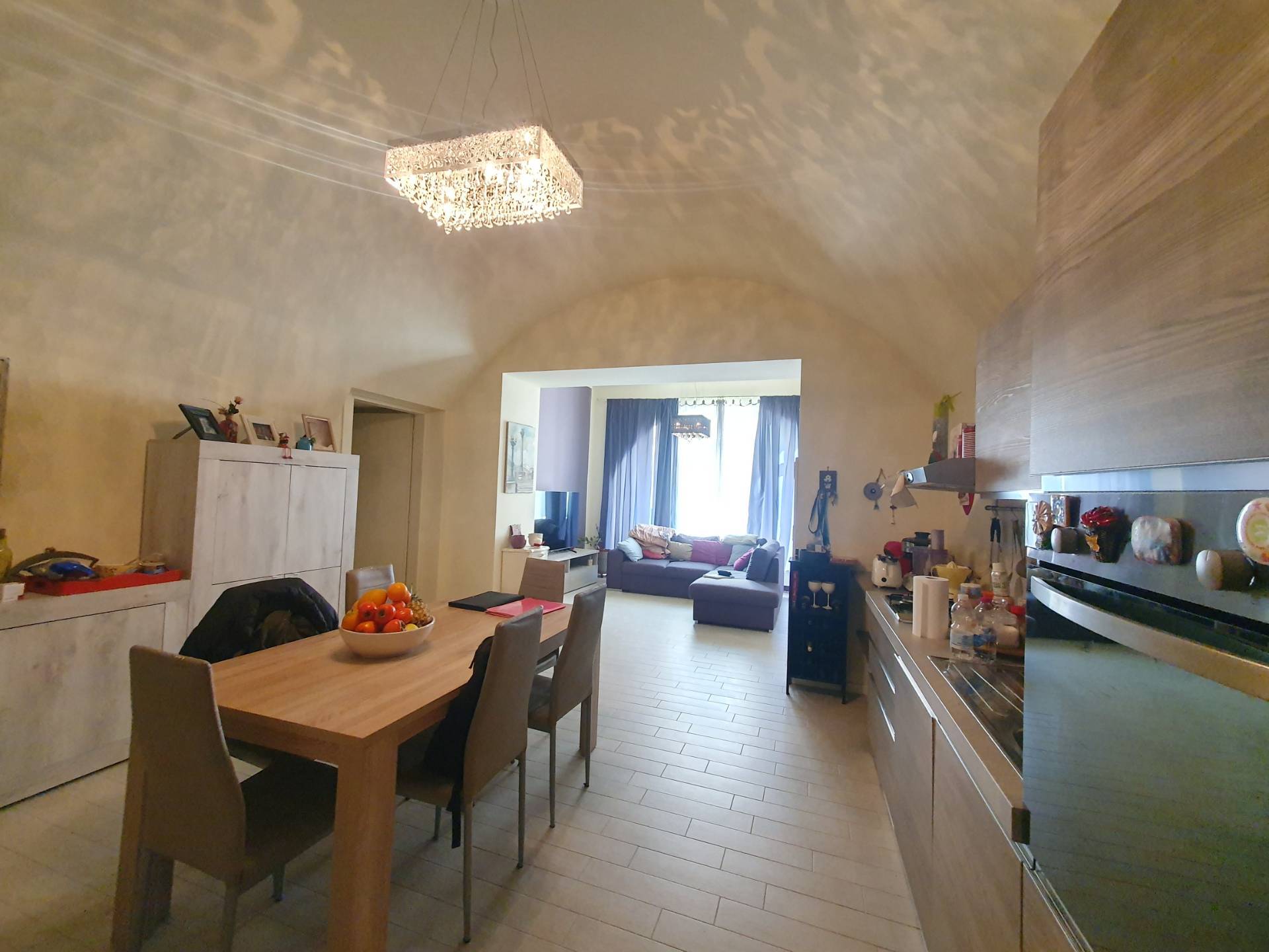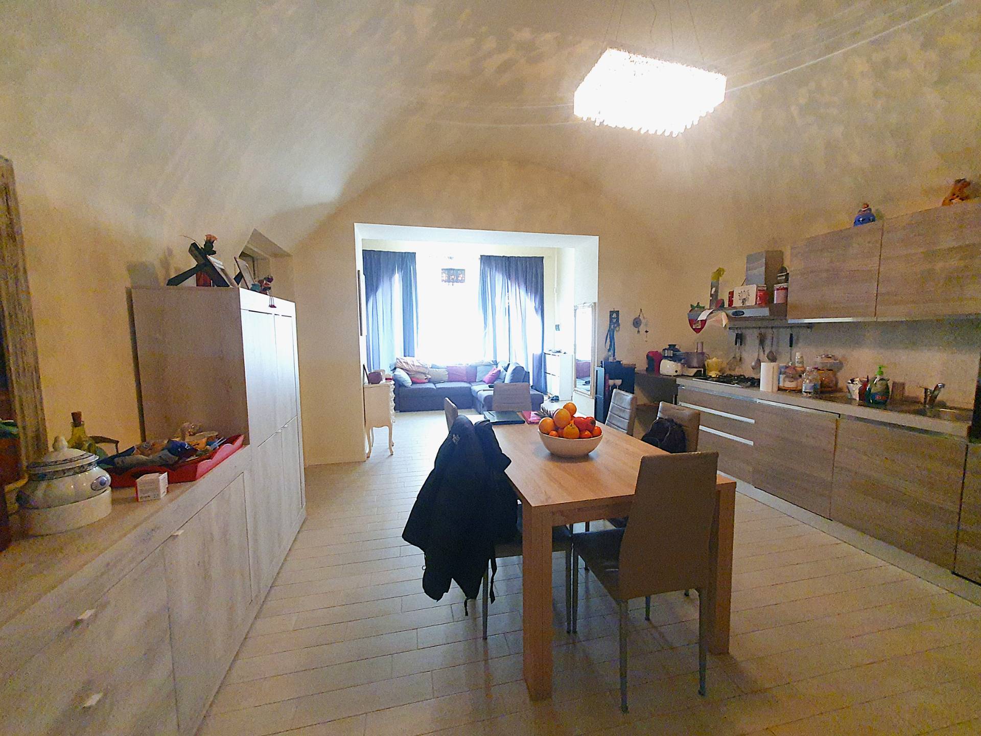La cucina a vista colpisce per il suo arco a botte, un particolare dettaglio che ne arricchisce lestetica e la rende uno spazio conviviale perfetto per ogni occasione.