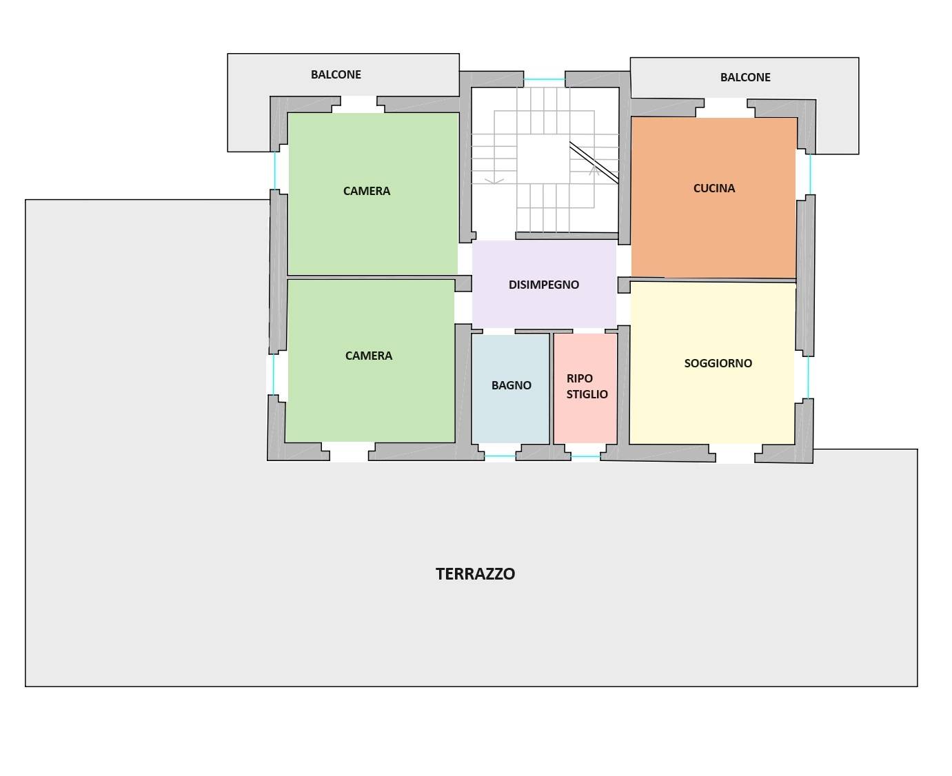 COMPOSIZIONE: -Ingresso -cucina abitabile -salone -due camere matrimoniali -bagno -ripostiglio -terrazzo di circa 190 mq -due balconi -soffitta -cantina FINITURE: -Infissi in legno mono vetro -Riscaldamento autonomo con radiatori e caldaia sostituita recentemente -Impianto elettrico rifatto nel 2019 PUNTI DI FORZA: -L'immobile oltre ad avere due balconi ha un magnifico terrazzo dove poter trascorrere del tempo all'esterno e organizzare cene con amici.