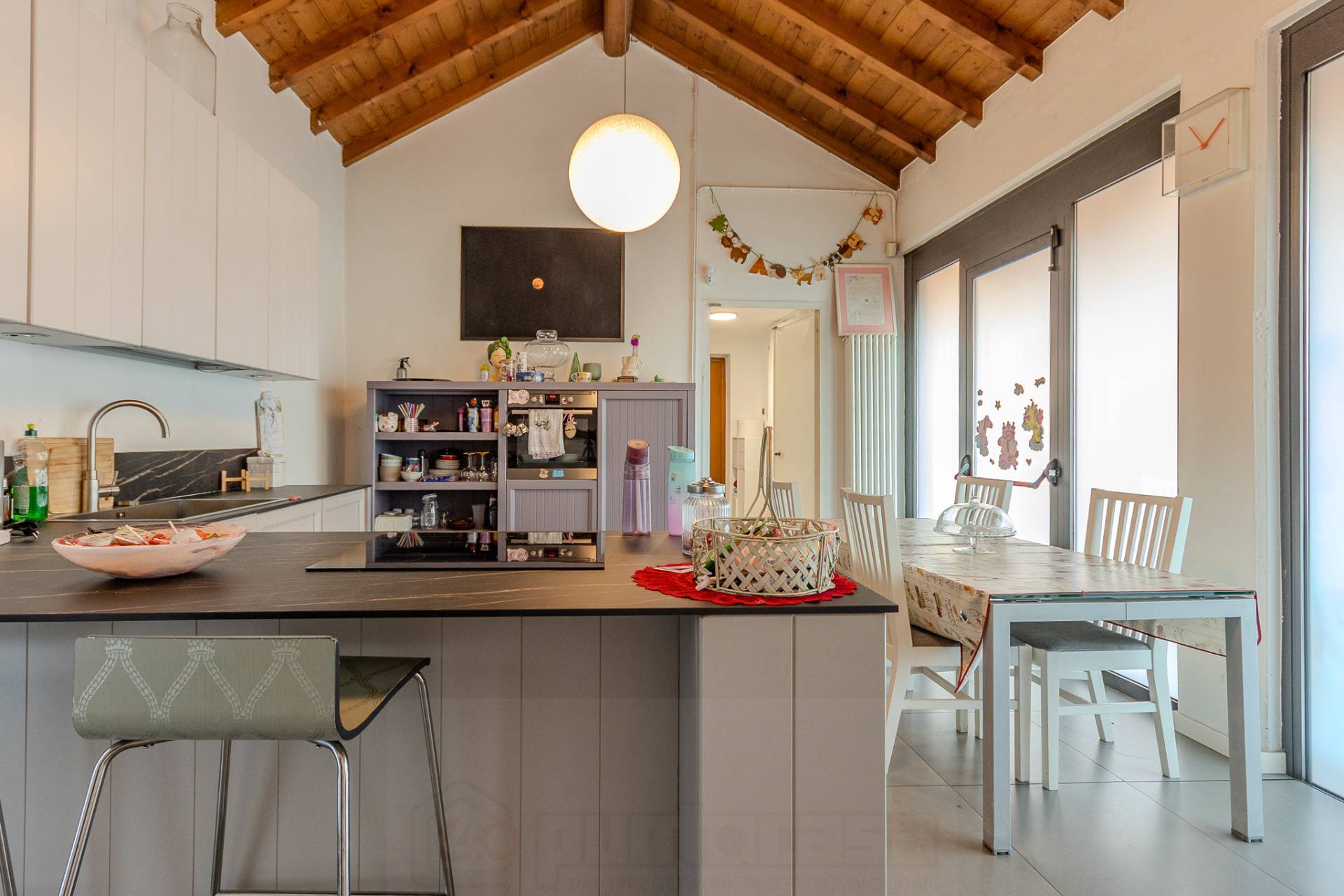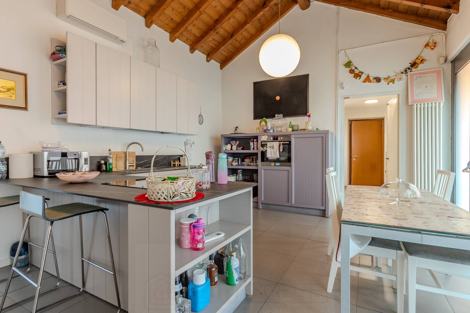 La cucina abitabile un vero punto di forza: un ambiente unico e luminoso, impreziosito dal soffitto con travi in legno a vista, pensato per momenti di convivialit e relax in famiglia.