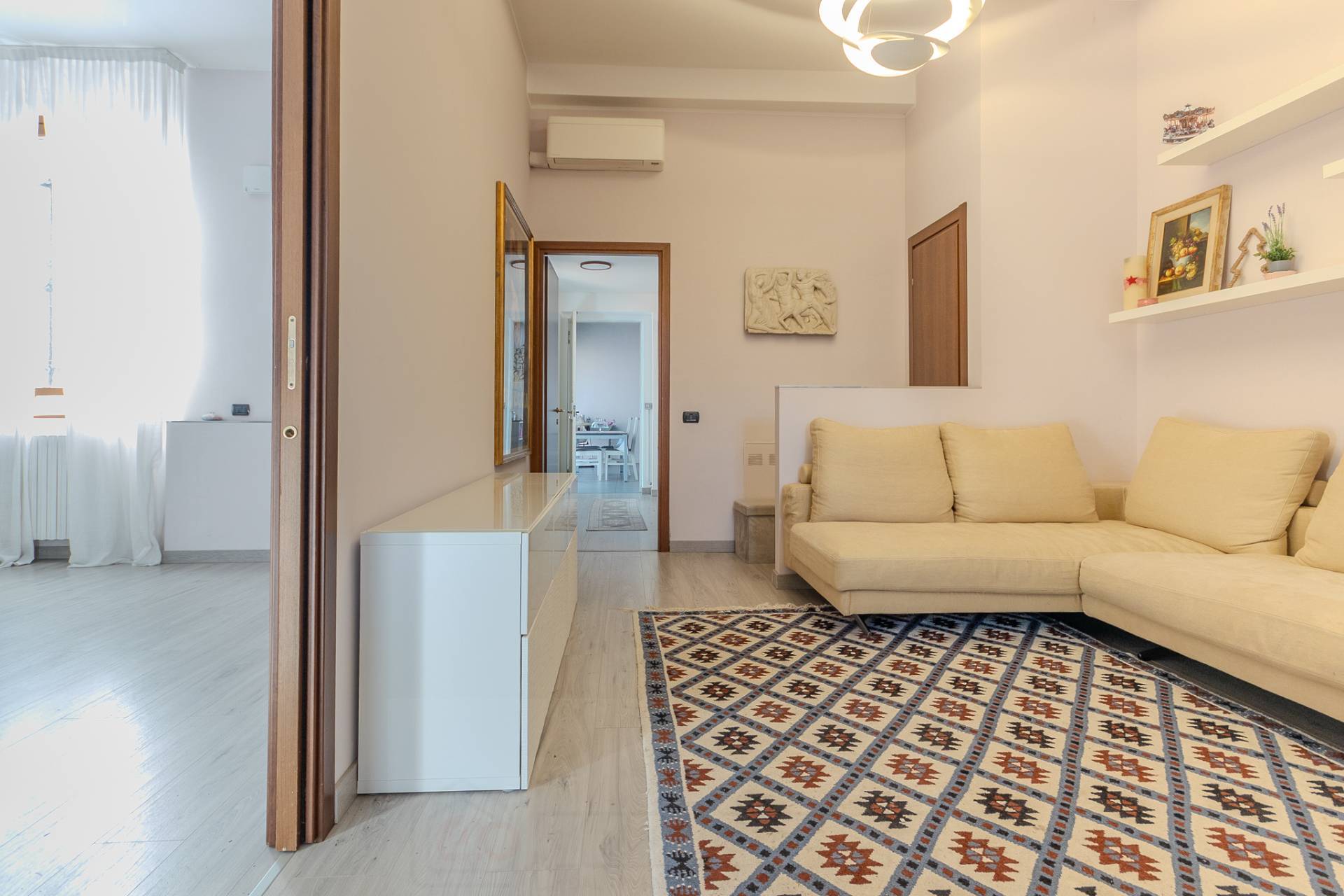 Labitazione si apre su un ampio soggiorno, perfettamente suddiviso tra zona pranzo e area conversazione, uno spazio accogliente e rappresentativo valorizzato dal parquet uniforme che accompagna tutta la casa. La zona notte offre due camere matrimoniali di generose dimensioni, di cui una con cabina armadio, ambienti sempre pi rari per metratura e comfort, ideali per garantire privacy e vivibilit a tutta la famiglia.