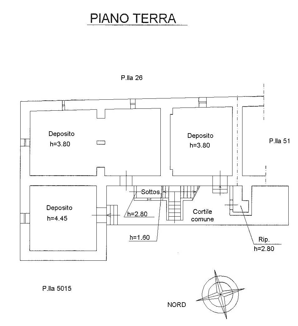 La soluzione si compone di un piano terra di circa 130mq, catastalmente uso deposito, con annesso vano sottoscala e ripostiglio.
