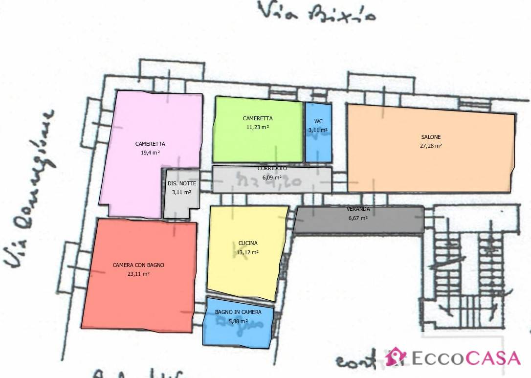 Inoltre quasi tutti gli ambienti sono serviti da singoli balconi, con esposizione ad angolo sia su via Bixio che su Via Concezione.