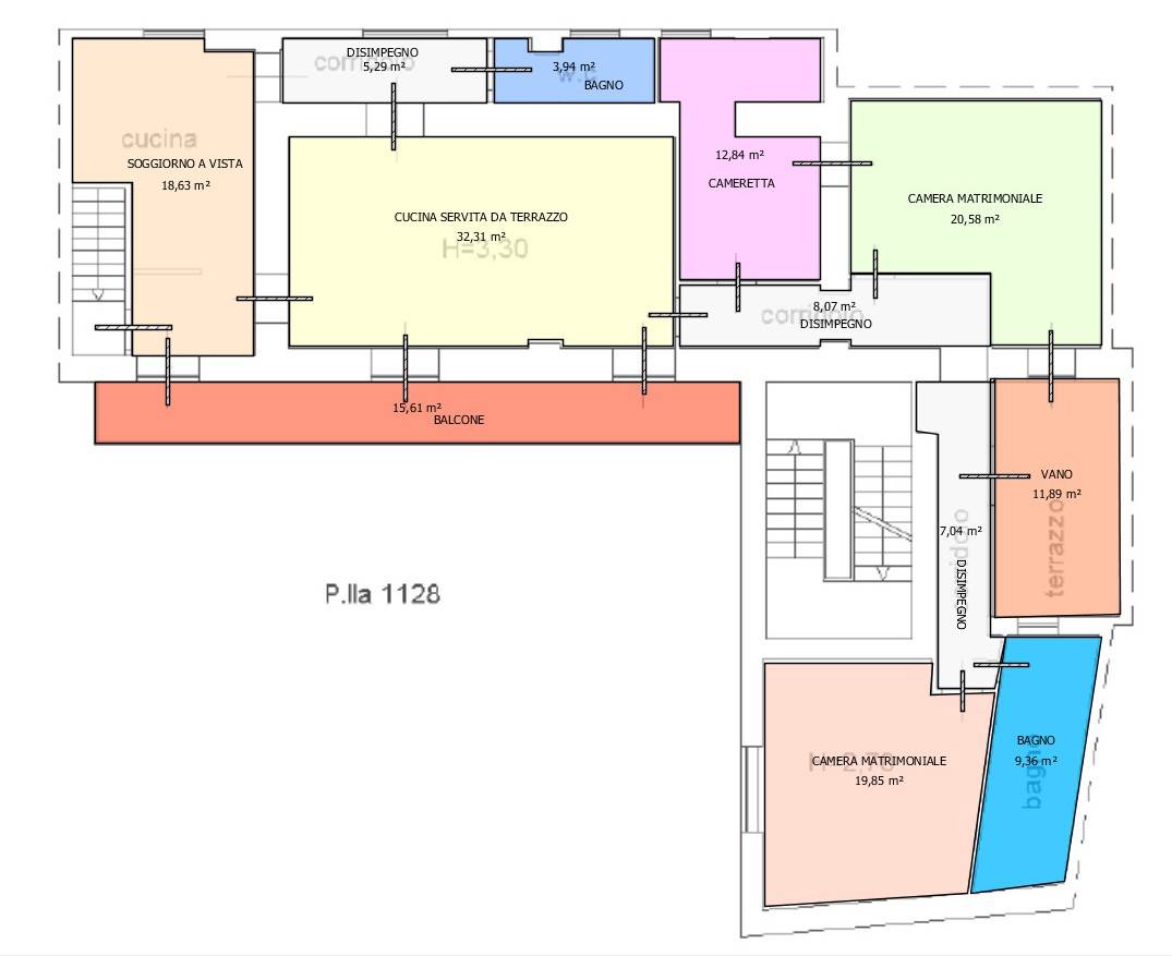 Sia la cucina che il soggiorno sono serviti da un balcone di circa 16 mq, mentre l'ottima tripla esposizione, sud/est/ovest, dona all'immobile luminosit diurna costante.