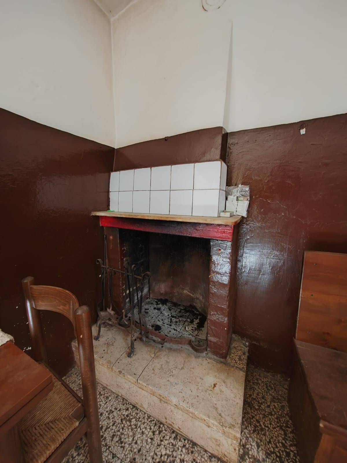 L'immobile composto da: un ingresso, una cucina con camino, un bagno senza doccia e una camera da letto.