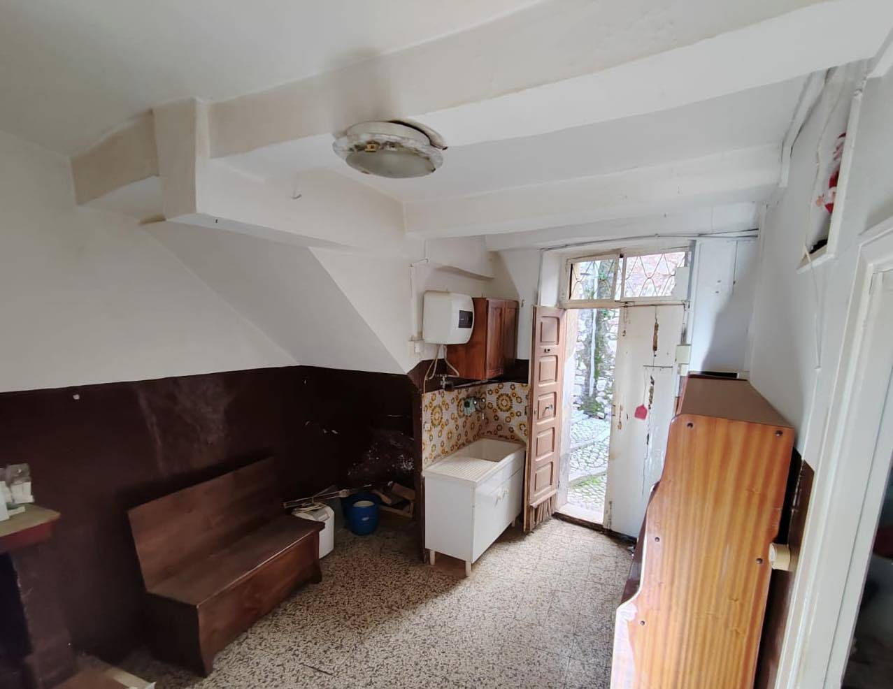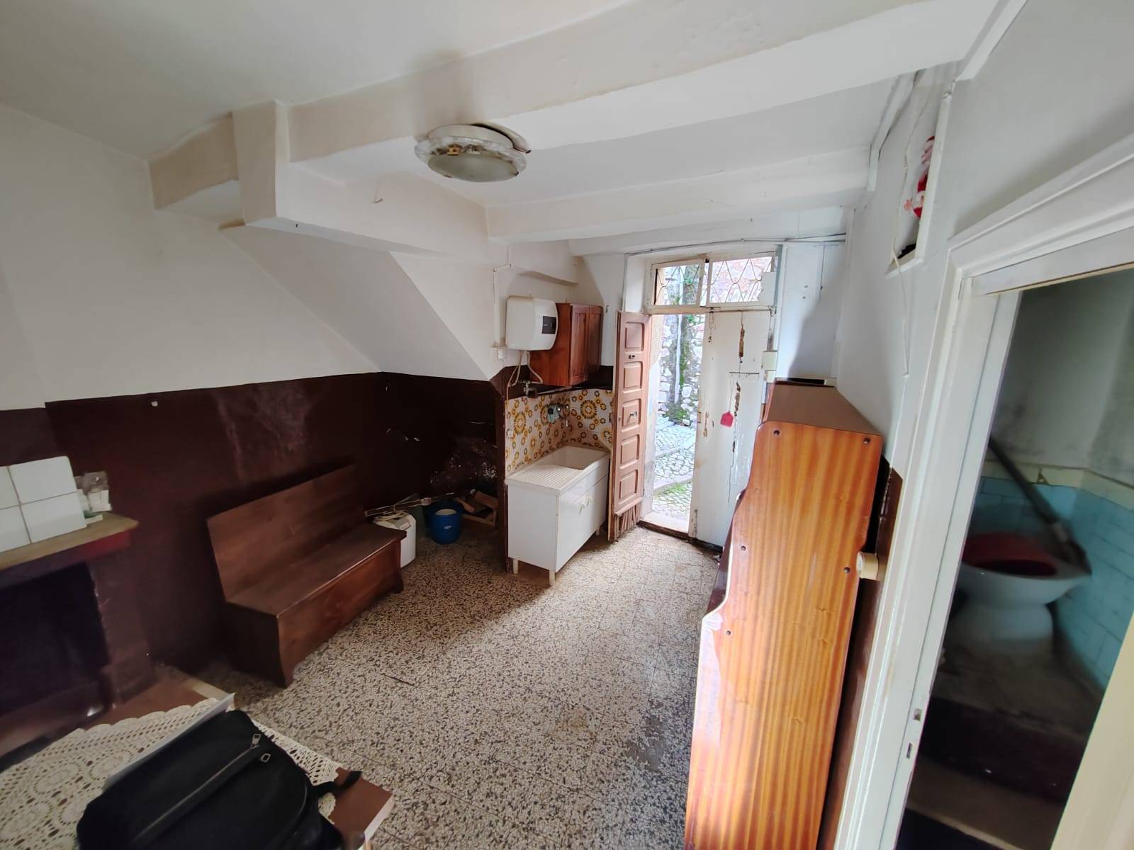 L'immobile composto da: un ingresso, una cucina con camino, un bagno senza doccia e una camera da letto.