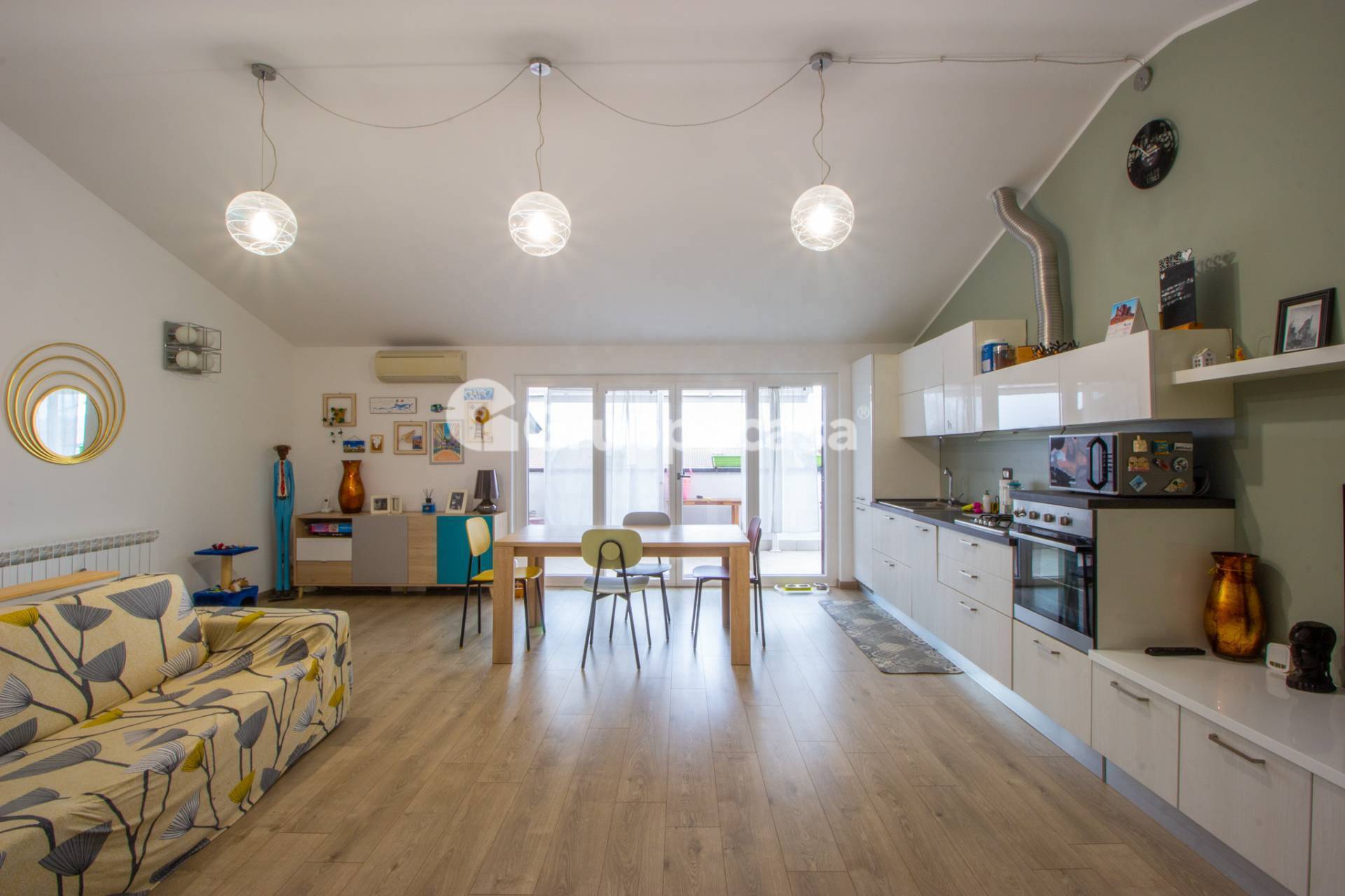 L'appartamento composto da ingresso con scala privata che ci conduce nell'ampio soggiorno con cucina a vista con uscita sul terrazzo di circa 25 mq parzialmente coperto da un pergolato, disimpegno, camera da letto matrimoniale e bagno finestrato con doccia, lavanderia, ripostiglio sottoscala e ampia cantina.