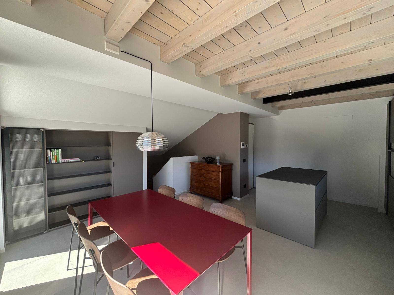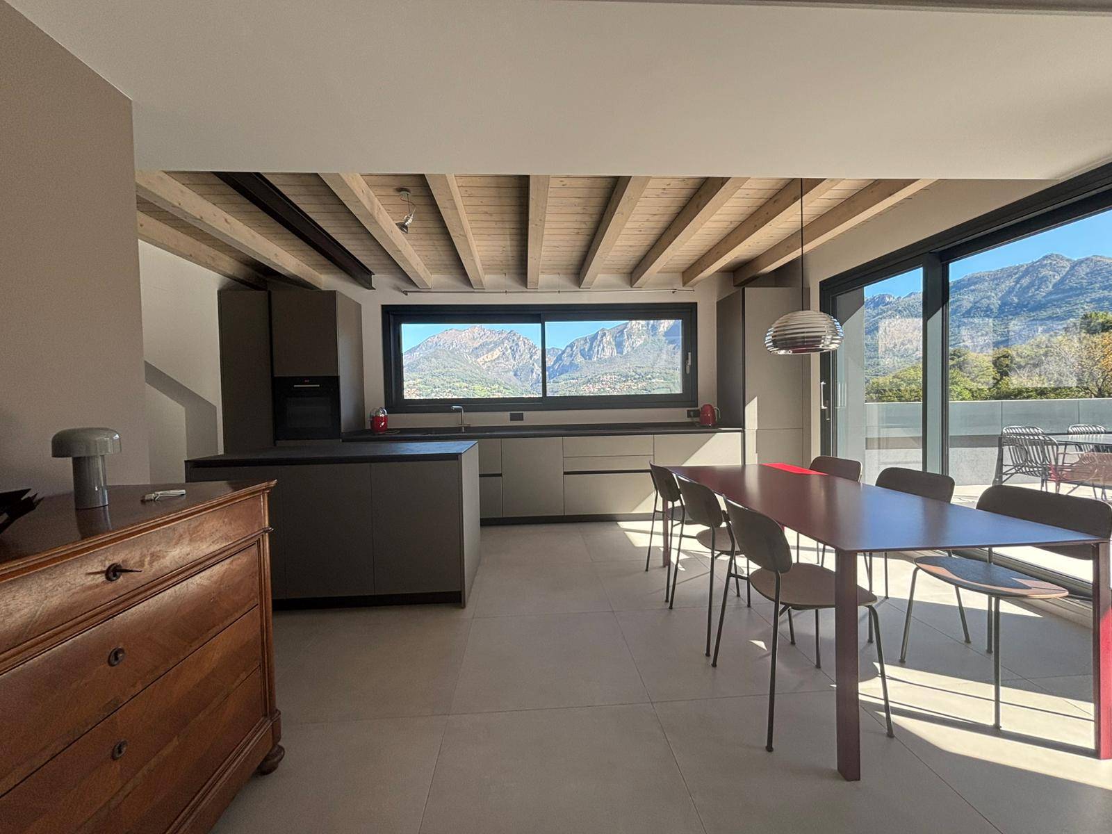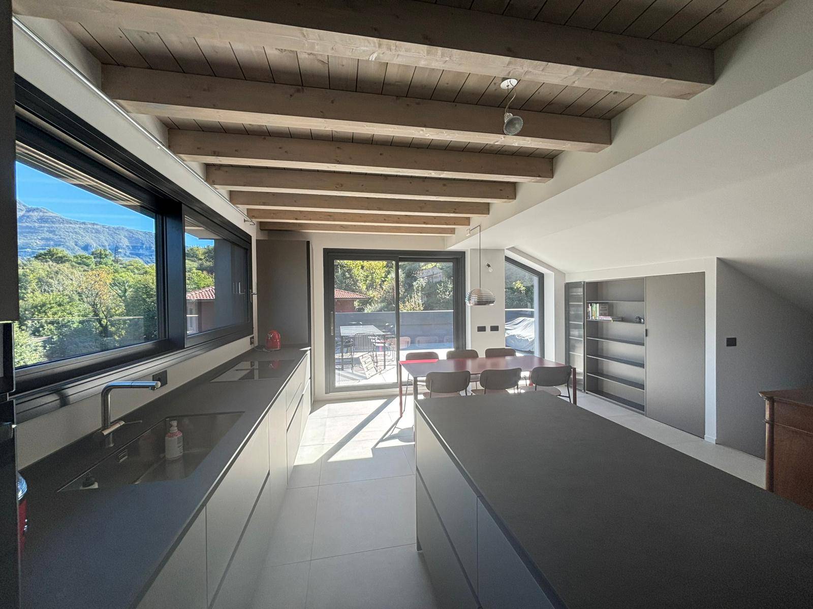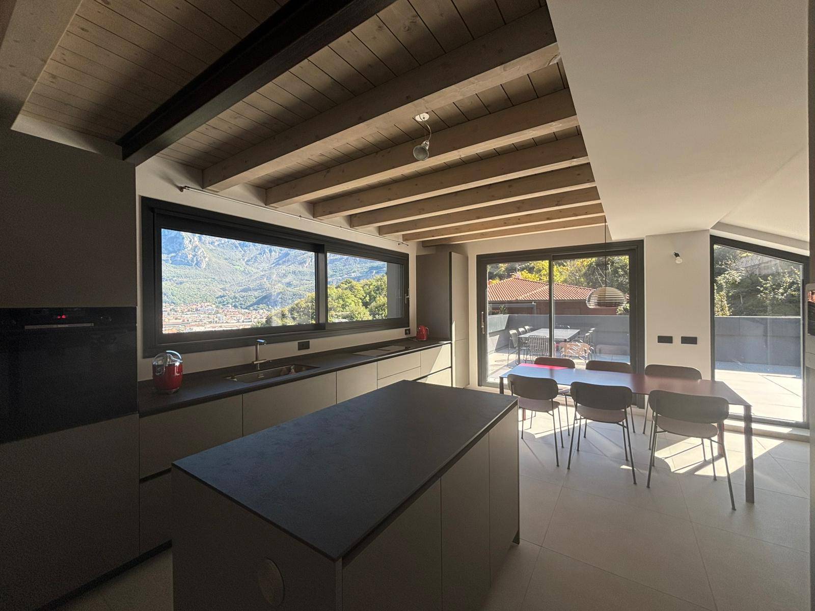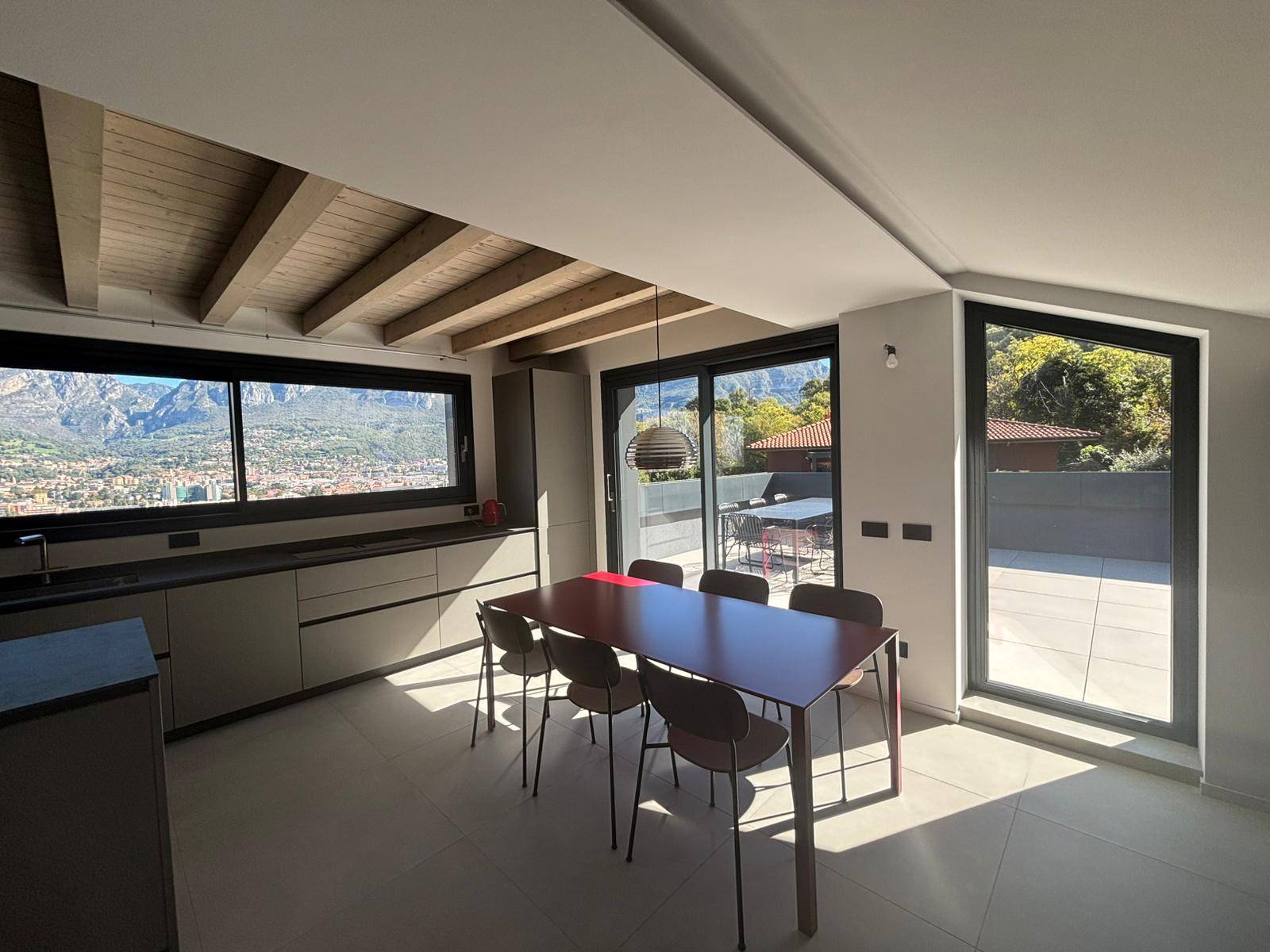 Caratteristiche principali: - Infissi top di gamma Schco in alluminio: - Piano primo: modello AWS 75 Slim con doppio vetro - Piano secondo: scorrevoli ASE 80 HI con triplo vetro e nodo minimal - Cappotto con isolamento interno per uneccellente efficienza termica - Sistema di ventilazione meccanica controllata (VMC) Zehnder, leader del settore - Riscaldamento autonomo con pompa di calore e cisterna da 300 litri - Domotica integrata per la gestione da app del riscaldamento e delle tapparelle elettriche in alluminio, con chiusura/apertura centralizzata e predisposizione per luci domotiche - Riscaldamento e raffrescamento a pavimento e predisposizione per aria condizionata in tutti i locali - Classe energetica A2, sinonimo di consumi ridottissimi e massimo benessere abitativo - Spese condominiali praticamente nulle Distribuzione interna: Lappartamento composto al piano 1 da ampio soggiorno, zona notte comprende 2/3 camere da letto e 2 bagni finemente rifiniti e due terrazzi da circa 9mq. Al piano 2 zona cottura con sala da pranzo che affaccia direttamente sul terrazzo principale di 35 mq, ideale per pranzi allaperto e momenti di relax con vista mozzafiato.