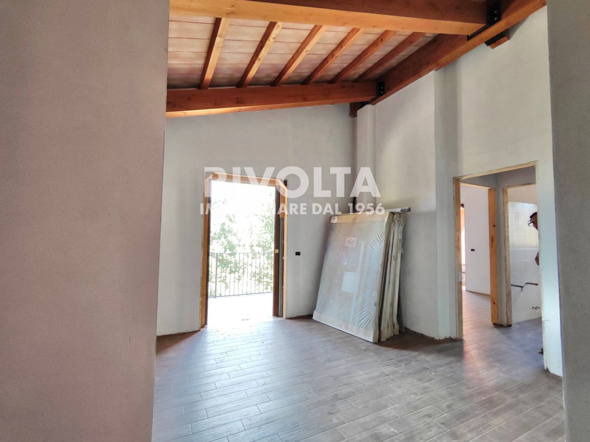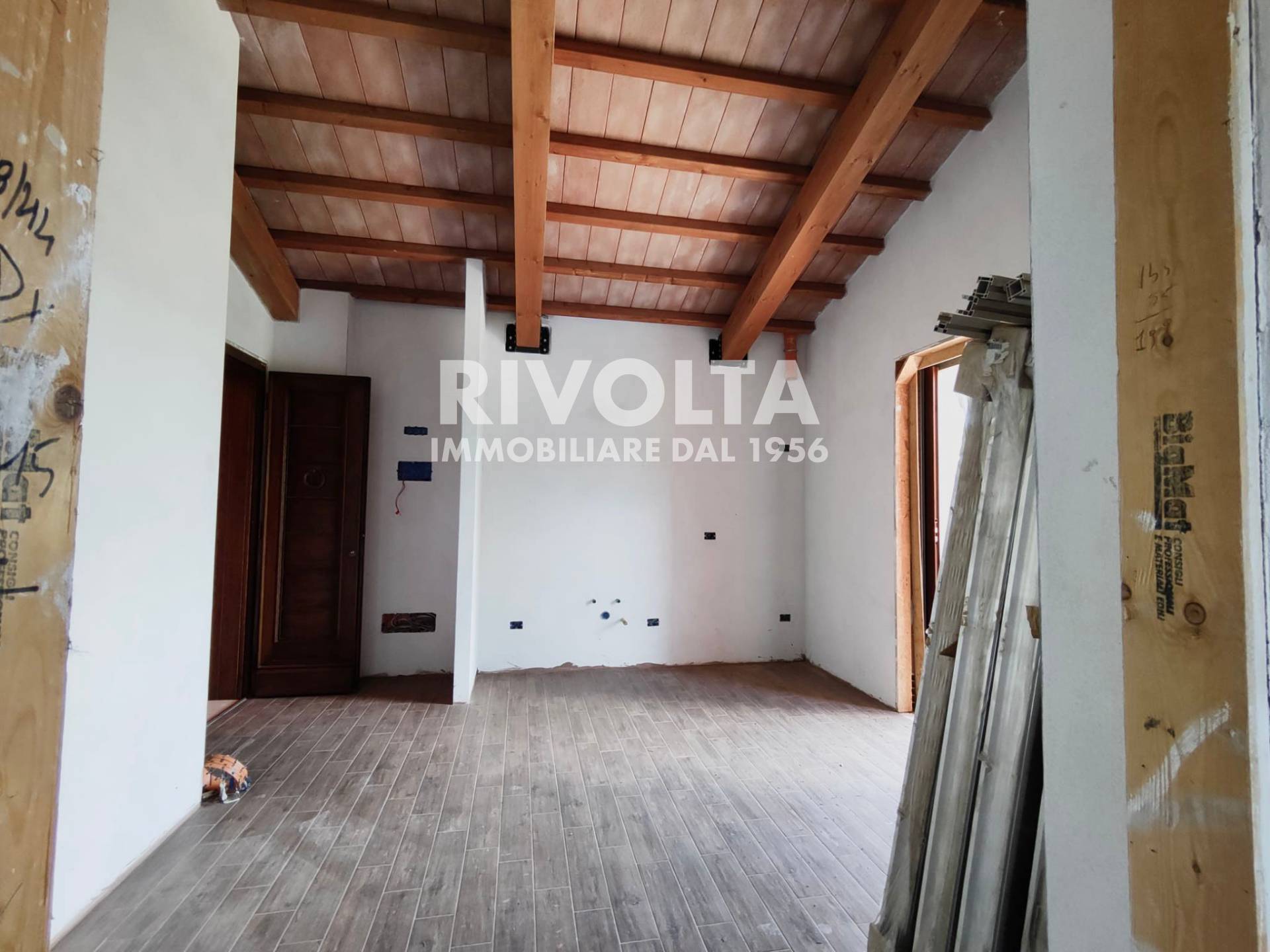 L'appartamento posto al primo piano caratterizzato da soffitti molto alti, travi a vista e due terrazze vivibili.