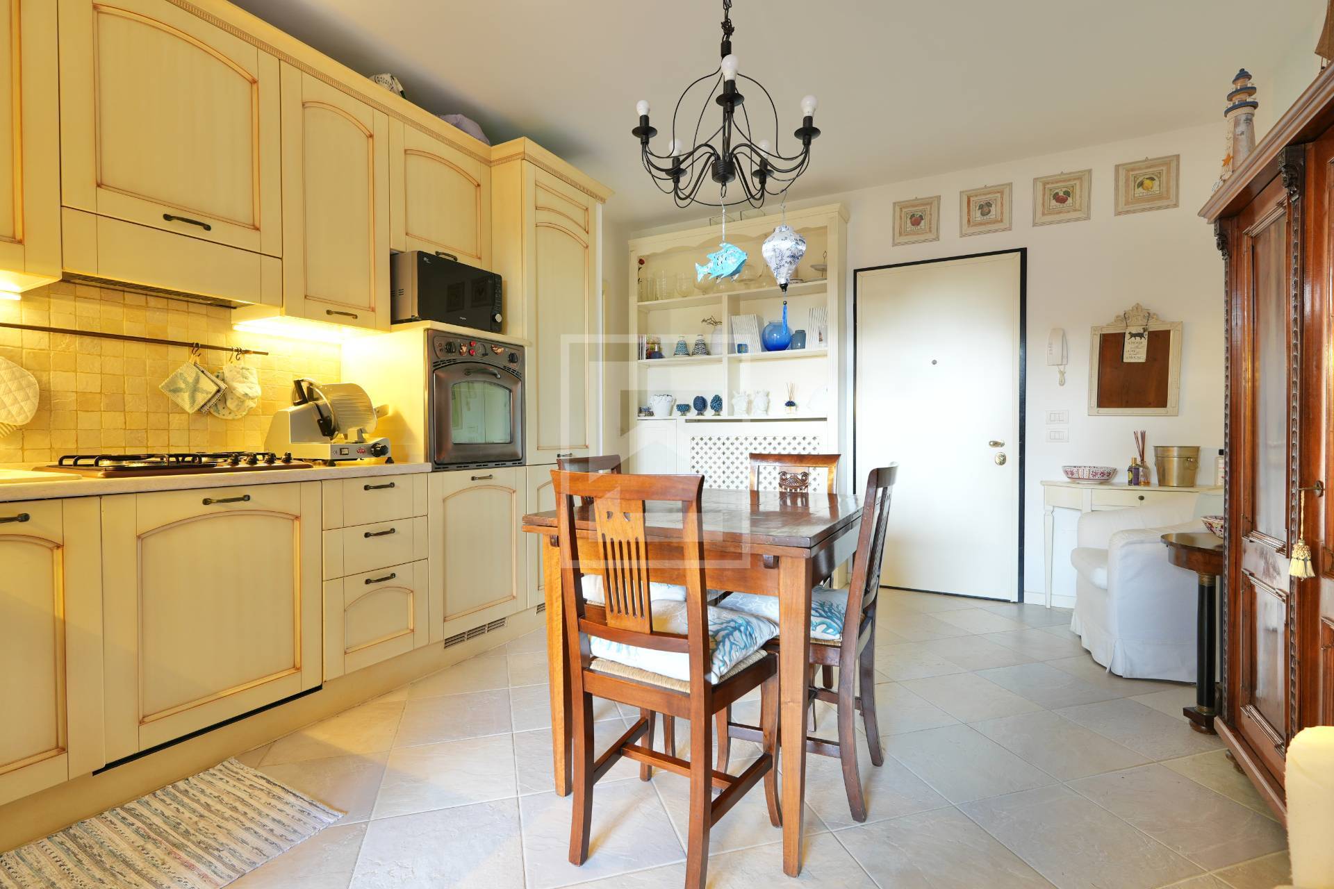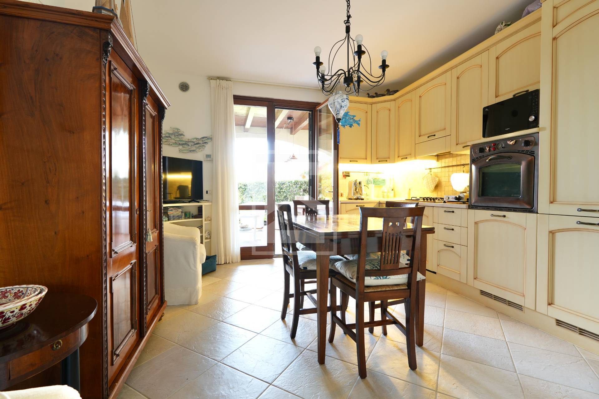 Lappartamento si trova al piano terra, entrando troviamo la zona giorno dotata di cucina a vista e accesso diretto al portico esterno.
