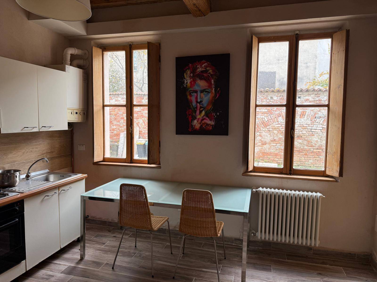 L'appartamento, molto originale si trova in buono stato di manutenzione, dispone di cucina abitabile con servizio e sala al piano terreno, due stanze da letto, secondo servizio ed introvabile e riservata terrazza con affaccio sul giardino interno al piano primo.