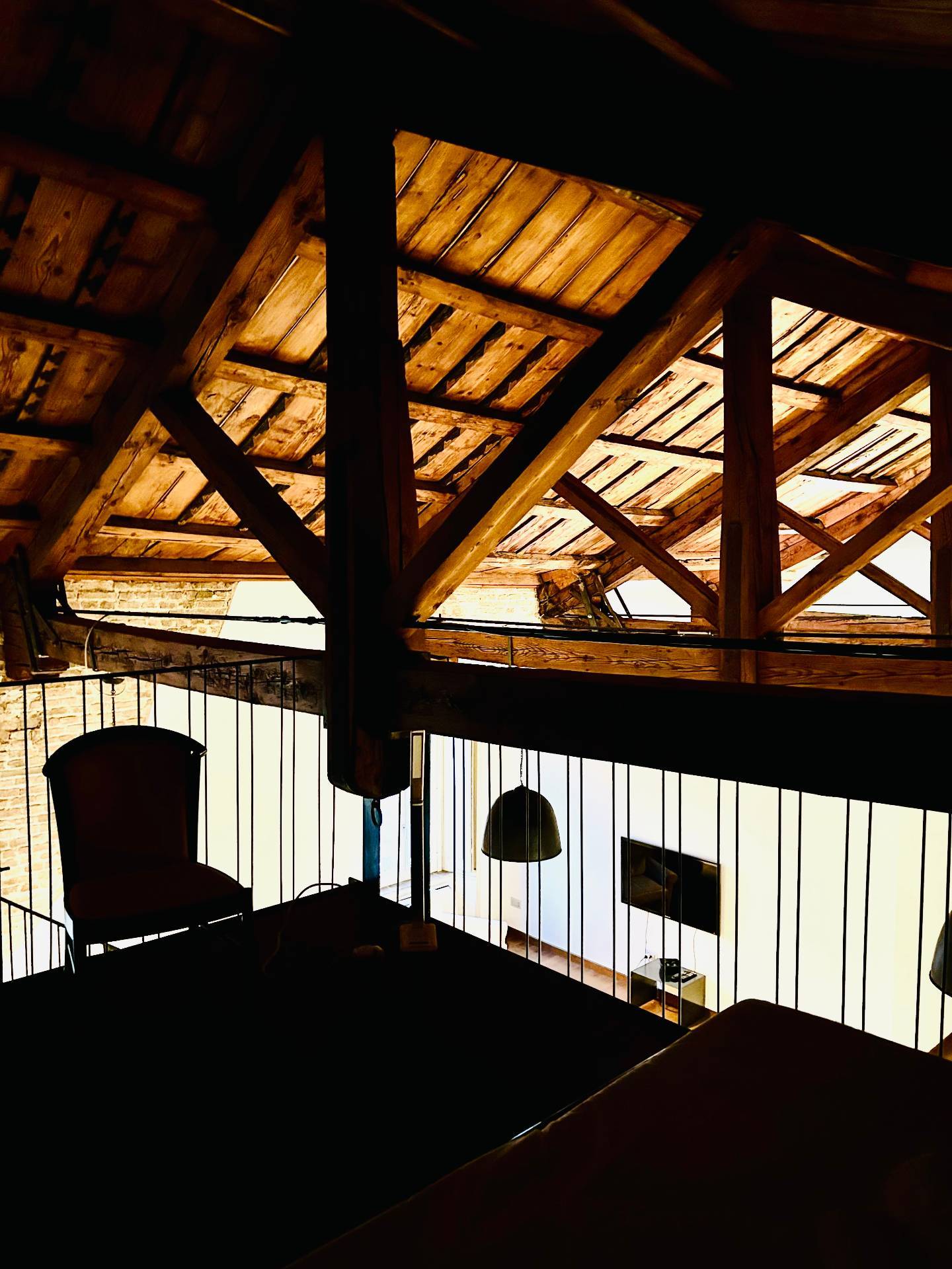 Il soppalco che ospita la seconda letto, interamente realizzato in ferro e legno di rovere senza nodi, accessibile da una scala dal gusto lineare e pulito che, tuttavia, si integra perfettamente con lo stile del Palazzo.