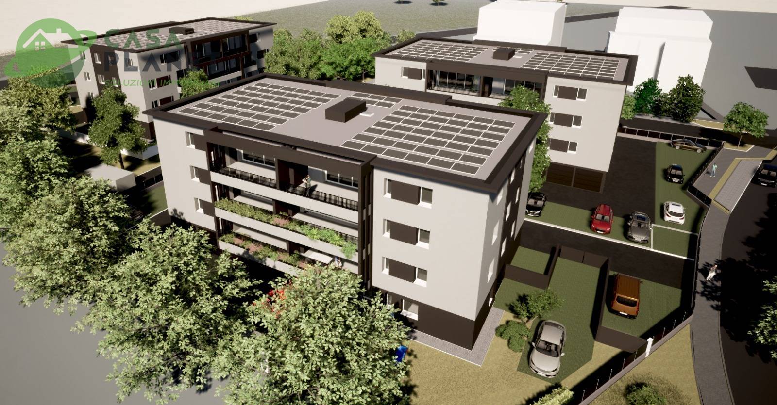 Riscaldamento a pavimento con pompa di calore, raffrescamento con predisposizione per gli split, allarme predisposto, fotovoltaico 3 kw per ogni appartamento, triplo vetrocamera, tapparelle elettriche, videocitofono, con ascensore.