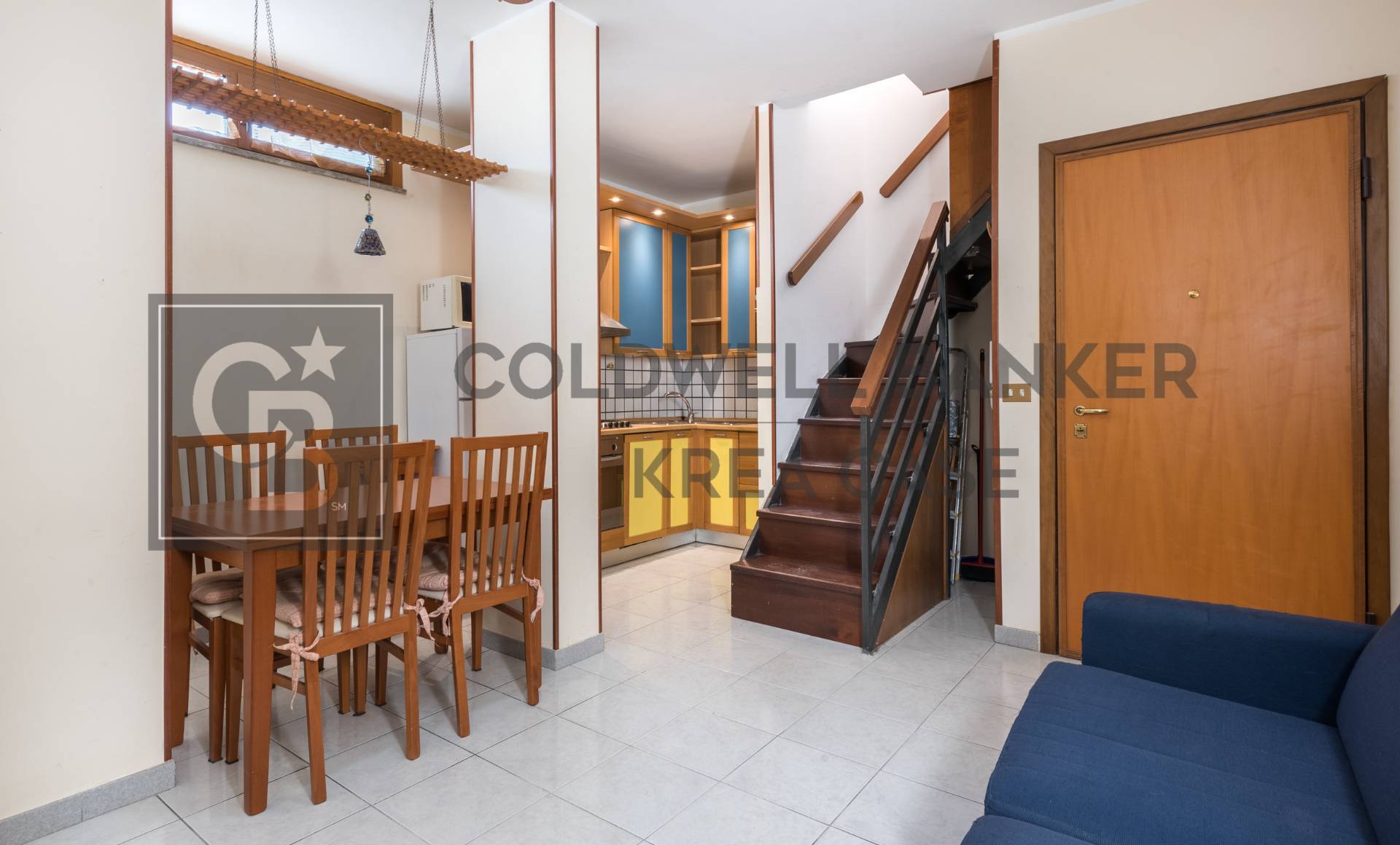 Gli spazi interni, raccolti ma ben distribuiti, presentano al secondo piano un soggiorno con cucina a vista, la scala interna collega la zona giorno al piano terzo dove si presenta la zone notte che si compone di due camere tra cui la matrimoniale, un servizio ed un terrazzino.