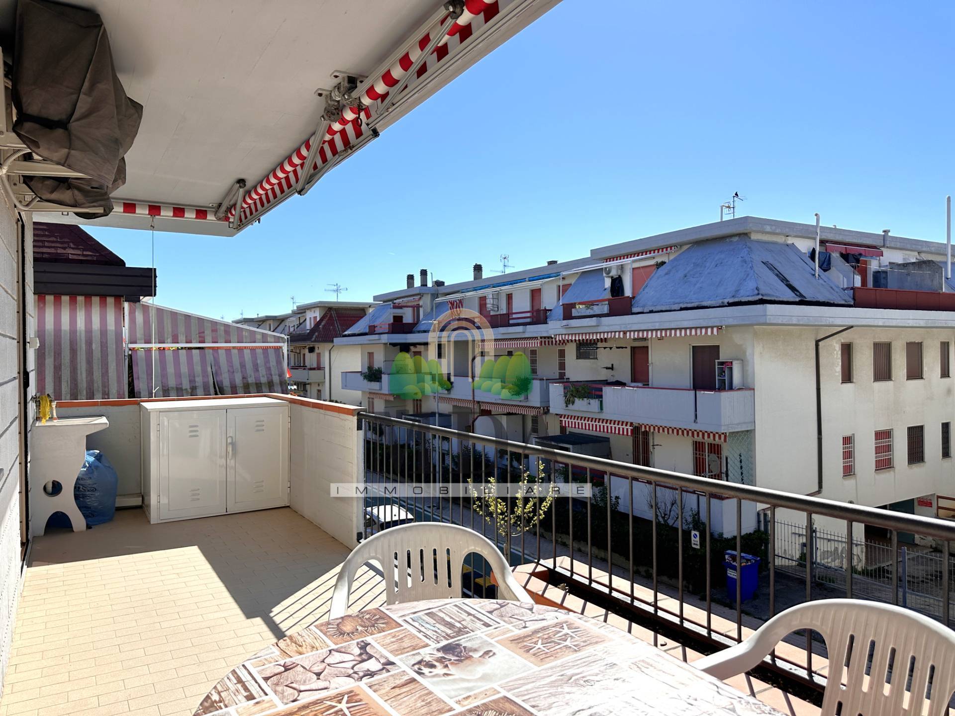 Dalla zona giorno e dalla camera matrimoniale si accede ad un ampio terrazzo di 17 mq. circa, dotato di tende da sole. L'immobile dotato di: condizionatore nella zona giorno e nella zona notte, tapparelle elettriche, zanzariera in tutti gli infissi, tende da sole. Il bagno stato completamente ristrutturato quattro anni fa. L'appartamento gode di un'ottima esposizione: sud-est. Completa la propriet un garage di 21 mq. circa, posto al piano terra, con ingresso carrabile su via del Porto.