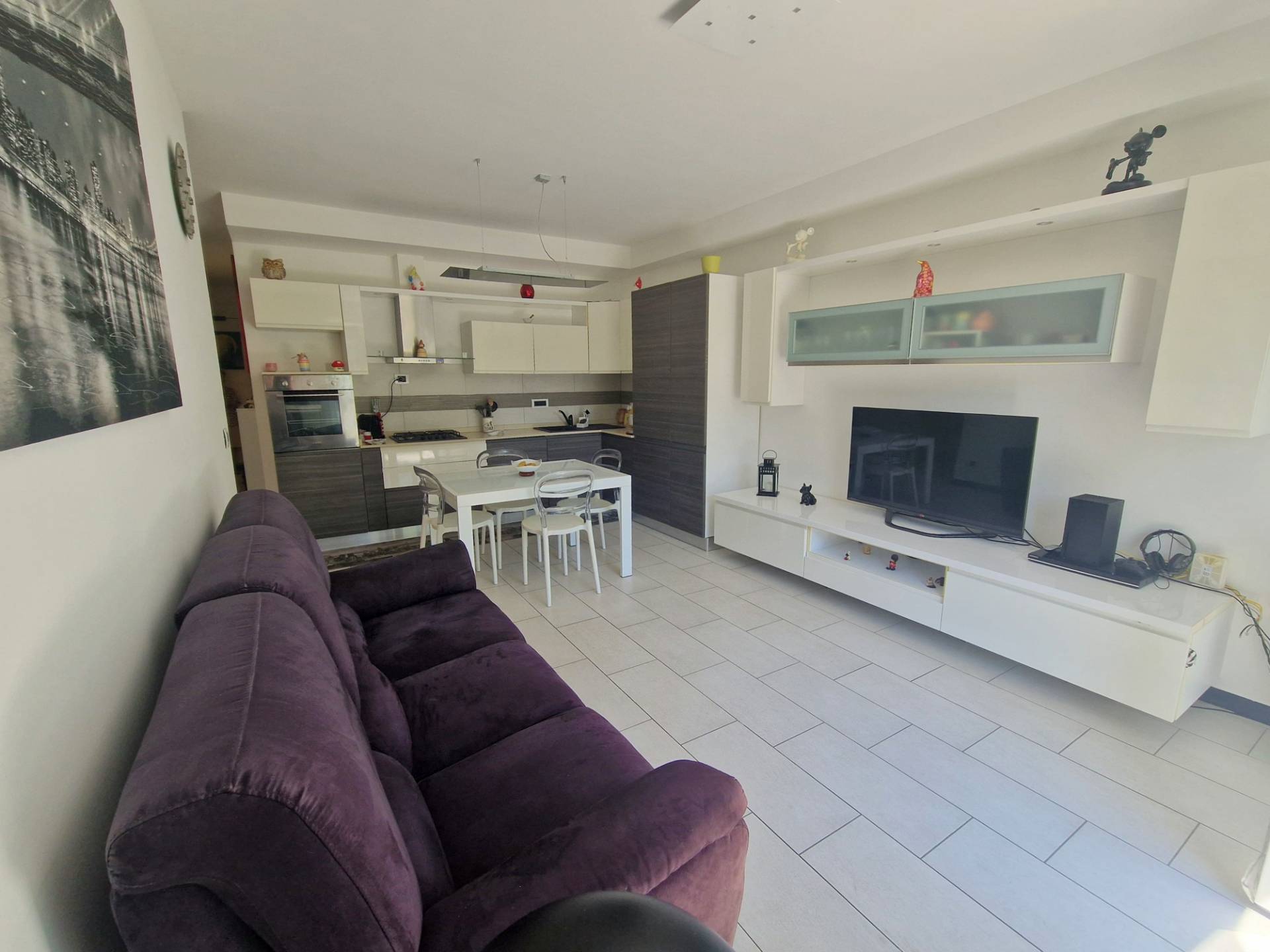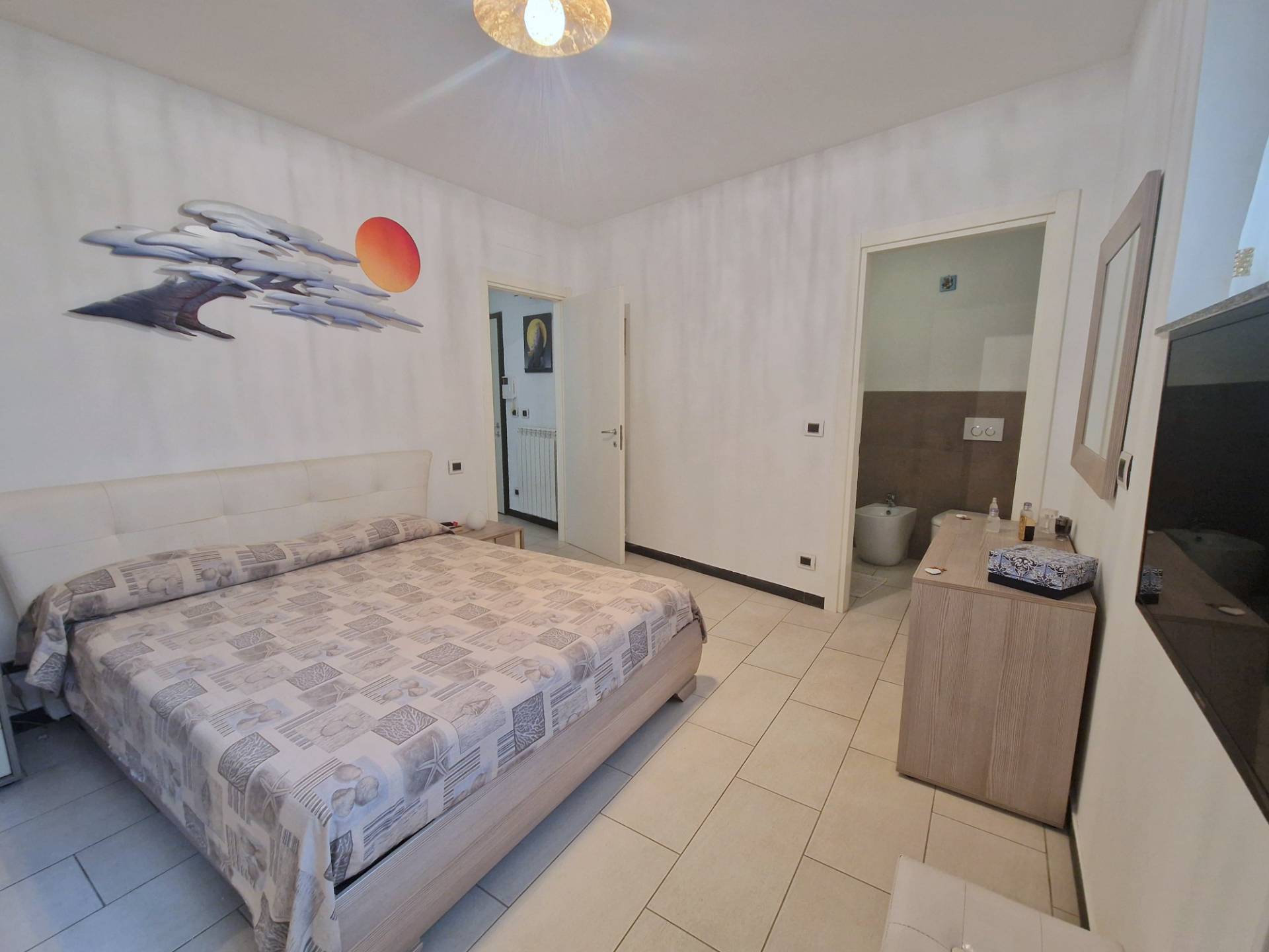 L'ingresso si apre su un ampio e luminoso soggiorno con angolo cottura a vista, camera matrimoniale con bagno dedicato, camera singola, secondo bagno.
