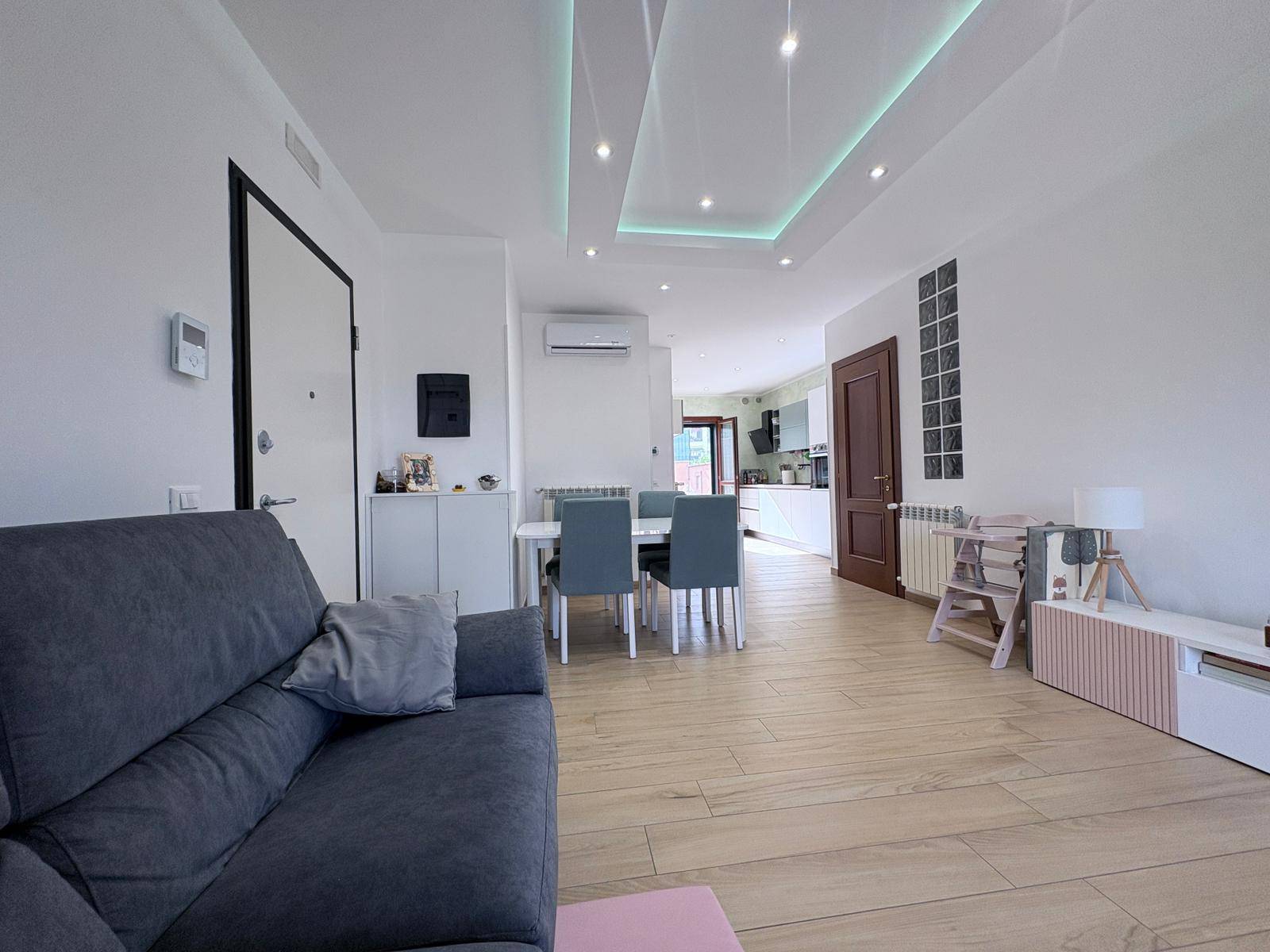 Climatizzazione efficiente, grazie a tre split gi installati (uno in soggiorno e due nelle camere), con predisposizione per un quarto impianto nella seconda cameretta.