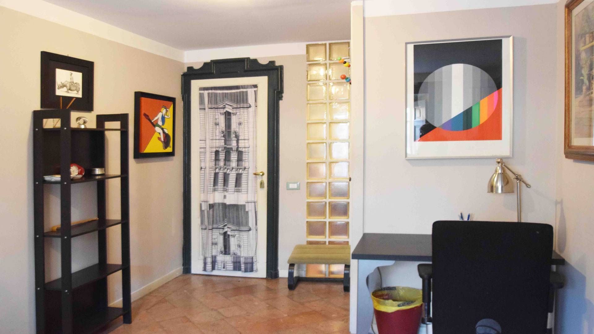 Una scalinata in parquet, affiancata da spaziosi ripostigli, pratici e funzionali, ed un corridoio reso quasi teatrale dalle opere dellartista milanese Piero Fornasetti, conducono al cuore di questa abitazione che, attualmente, si presenta con un living dotato di angolo cottura, appartato e discreto, sul quale affacciano le due camere matrimoniali, entrambe con un gradevole balcone, entrambe luminosissime e silenziose, entrambe con una romantica vista sui tetti di Milano.