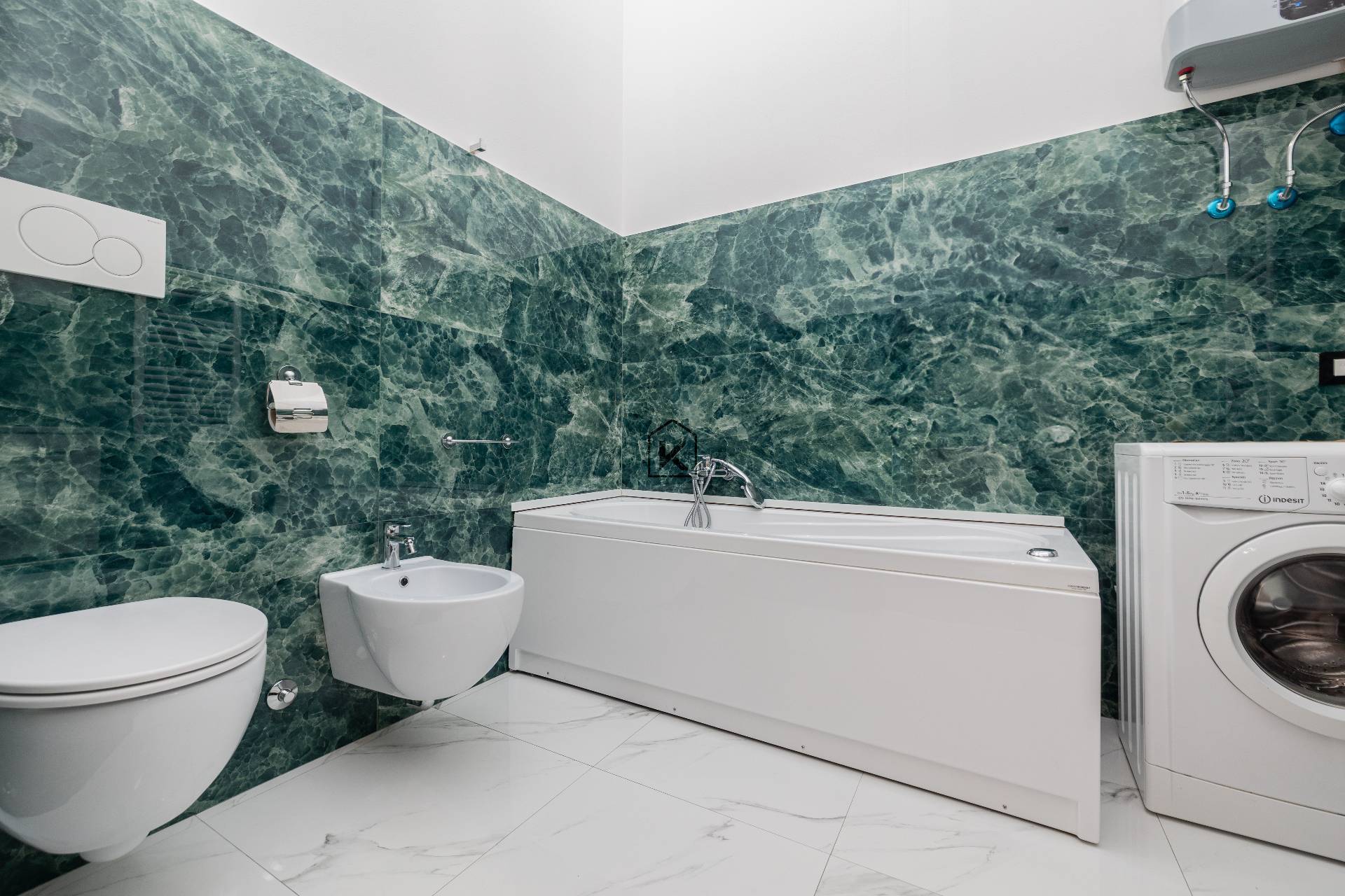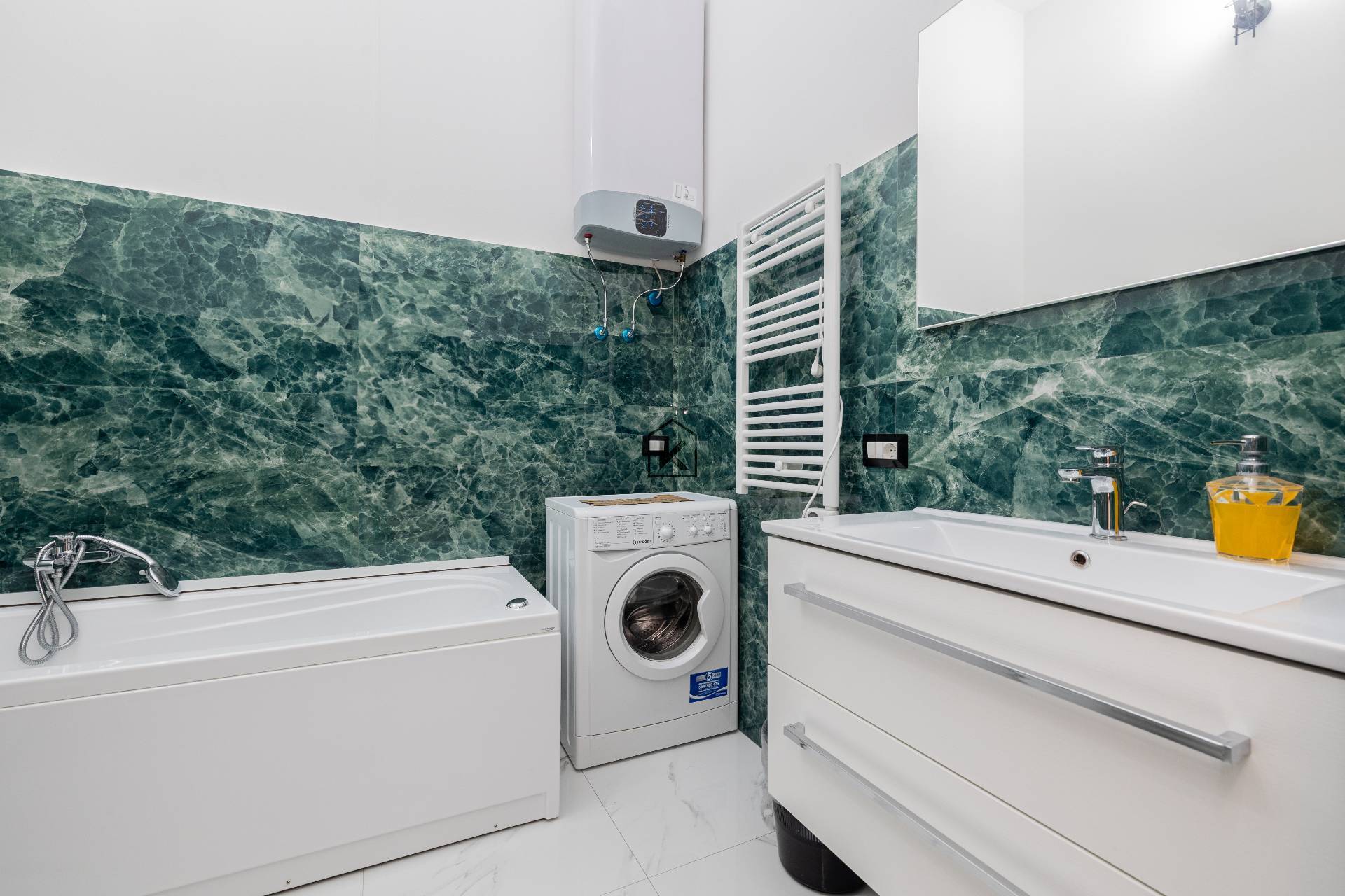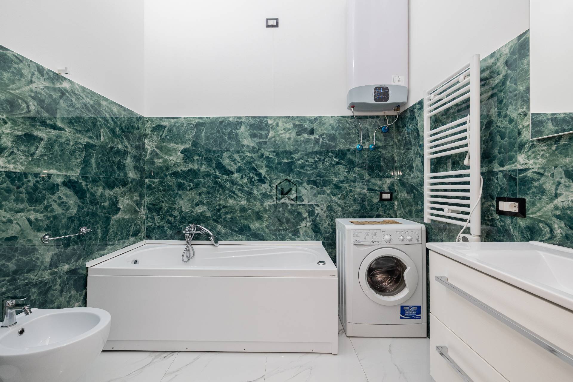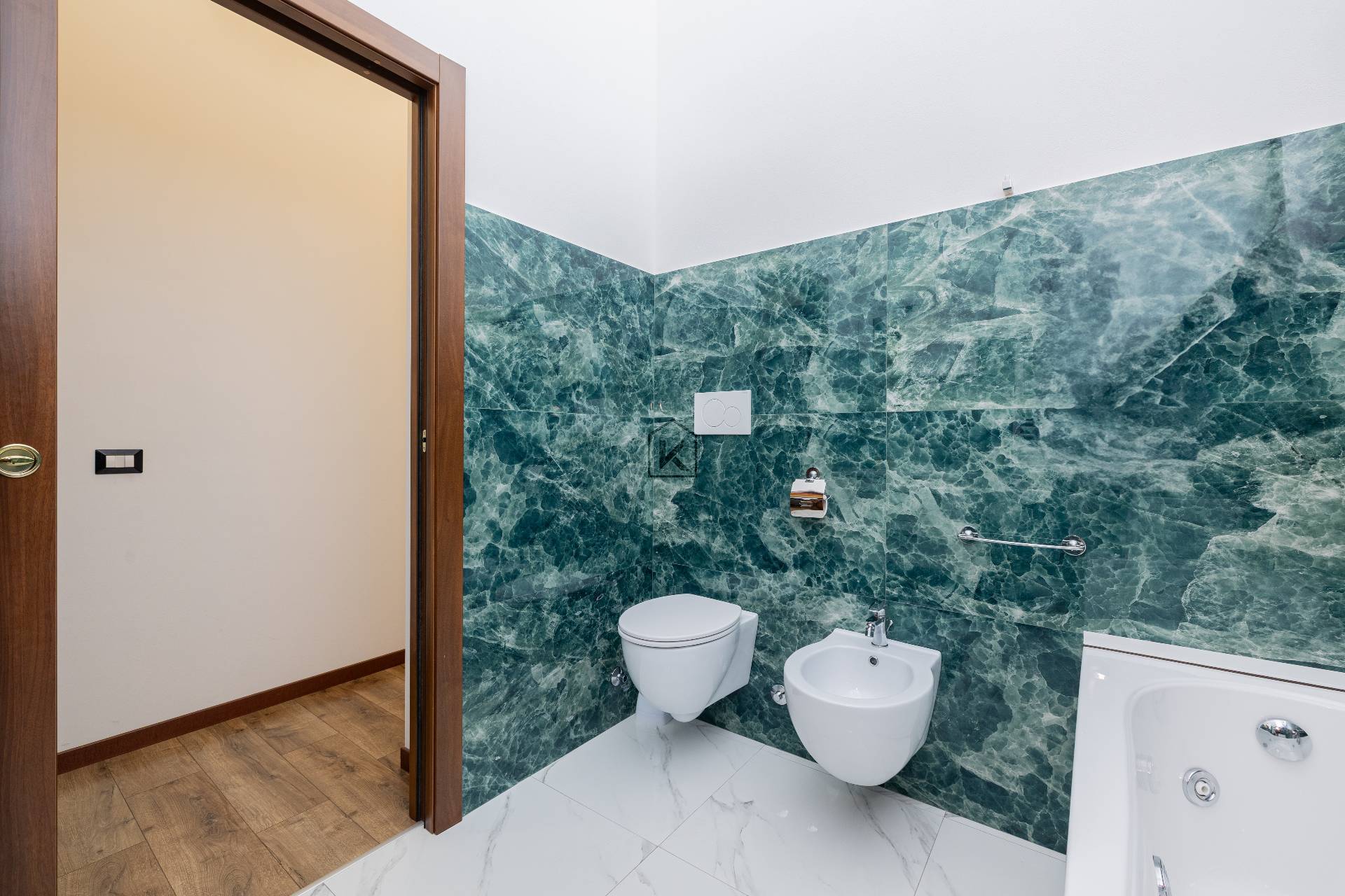 Il bagno, moderno e funzionale con sanitari sospesi, dotato di vasca e porta scorrevole a scomparsa per ottimizzare gli spazi e valorizzare lestetica contemporanea dellimmobile.