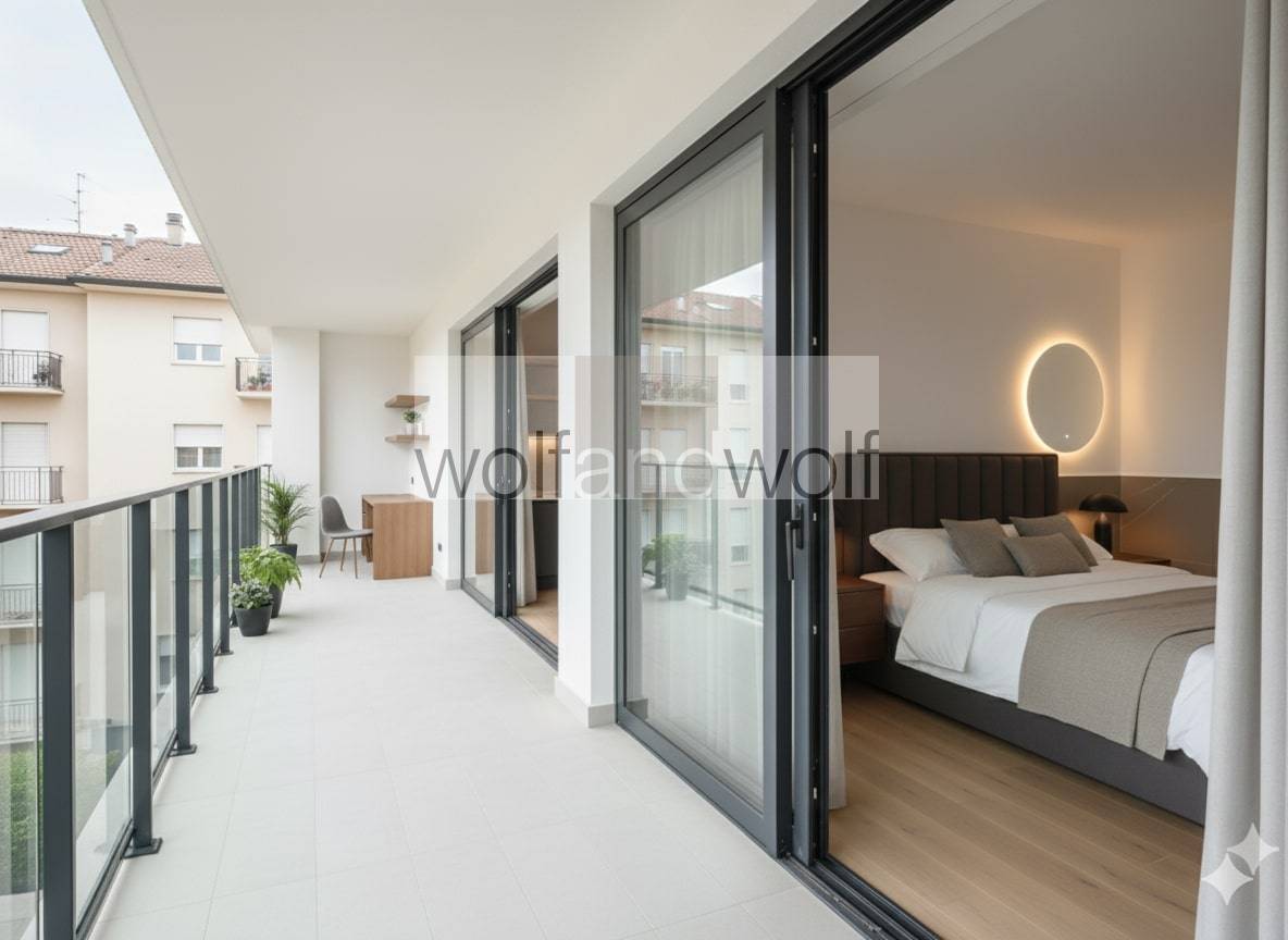 La disposizione interna comprende: -ingresso -luminoso soggiorno con cucina a vista, con balcone -due camere matrimoniali con accesso al balcone -due bagni rifiniti in grs porcellanato, entrambi con doccia Solaio Servizio portineria mezza giornata, spazio comune nel giardino condominiale per le biciclette Certificazione energetica in corso L'appartamento ristrutturato consegnato vuoto (escluso i bagni), una volta arredato pronto per essere abitato.