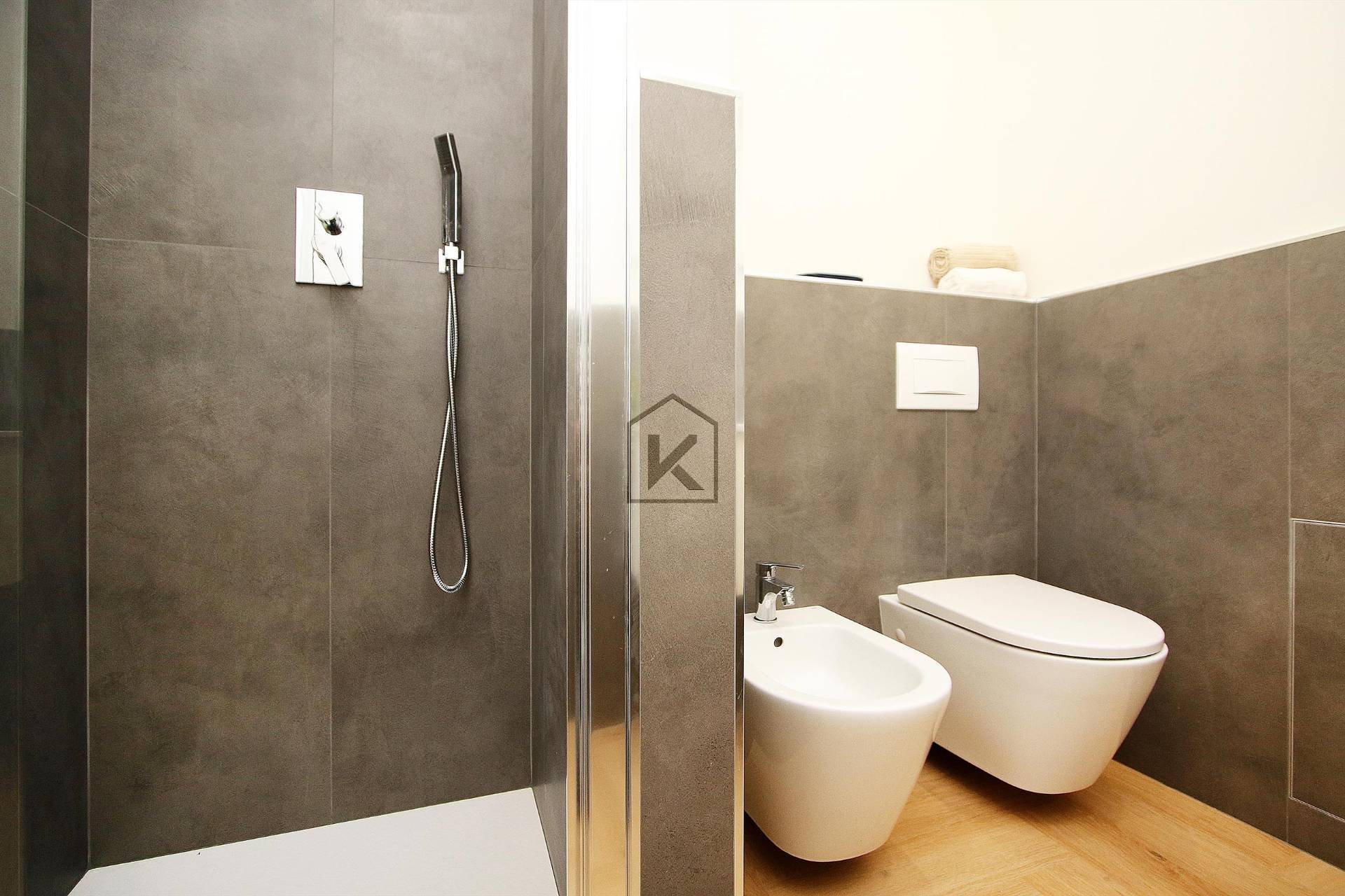 Le finiture sono ottima qualit: pavimentazione continua in SPC effetto rovere miele, servizi con pareti in gres porcellanato con profili cromati, infissi in PVC doppio vetro antisfondamento, porta blindata.