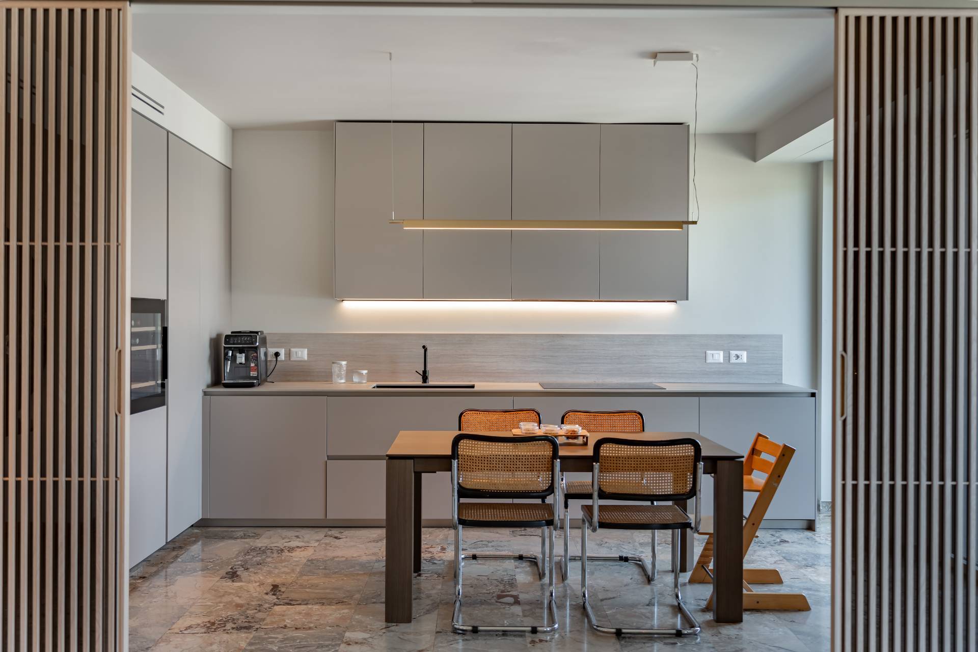 La ristrutturazione, realizzata da Tea Costruzione e Design, utilizza materiali di pregio provenienti da uno showroom storico.