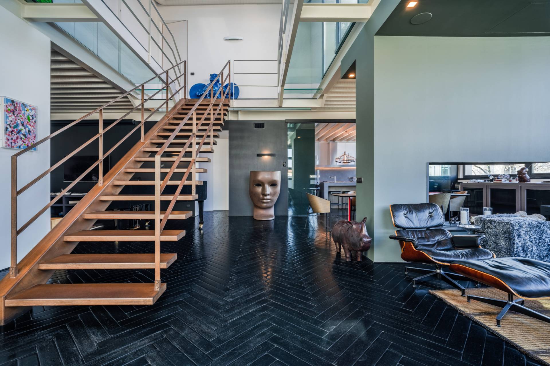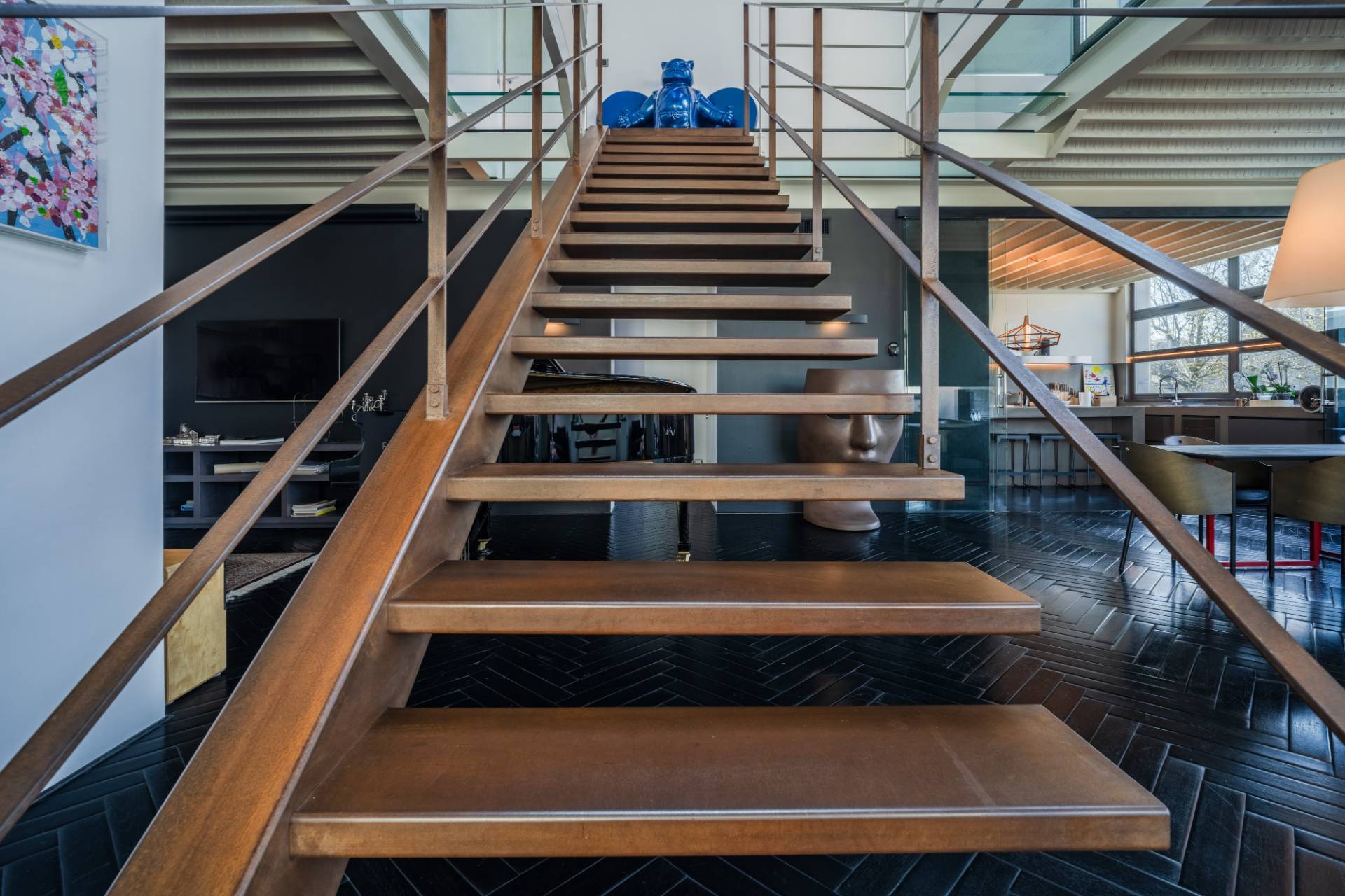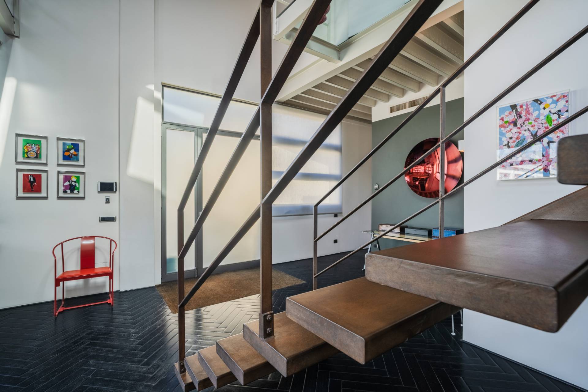 Al centro della scena, una scenografica scala in corten materiale che richiama la memoria industriale del complesso conduce al piano superiore con forte impatto estetico.