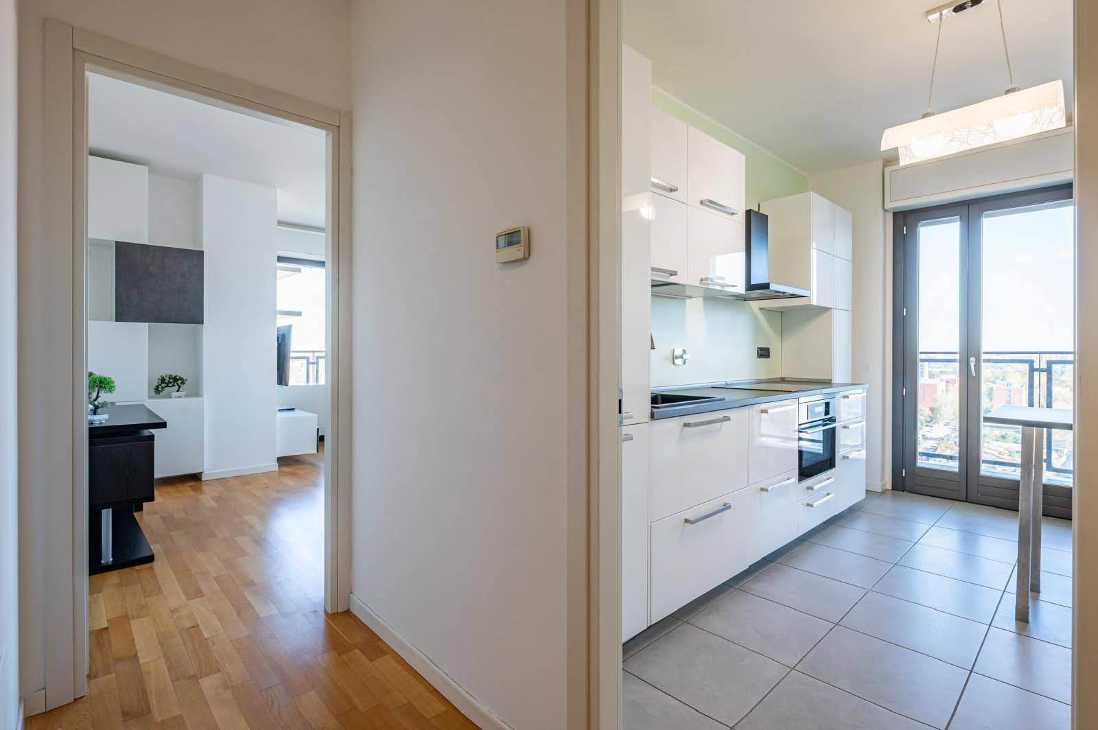 L'appartamento si sviluppa partendo da un disimpegno d'ingresso, proseguendo verso un'ariosa zona living, caratterizzata da ampie vetrate che consentono di godere di ottima luminosit, affiancata da un'elegante e spaziosa cucina abitabile, una camera da letto matrimoniale di comoda metratura ed infine un bagno finestrato.