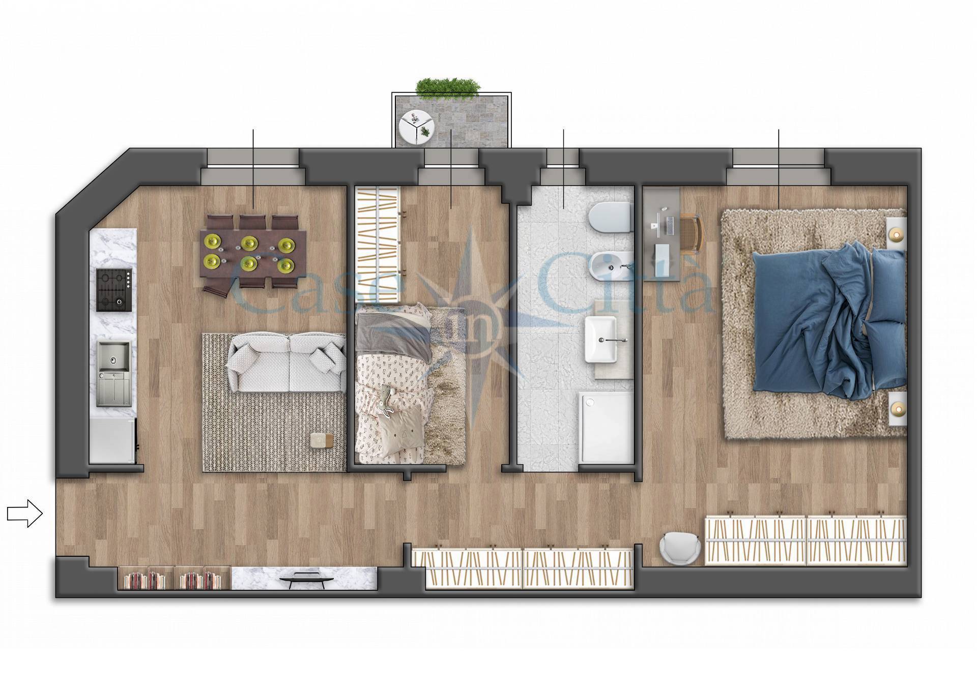Composto da ingresso, soggiorno con cucina a vista, camera da letto, cameretta/studio, bagno, balcone e solaio, perfetto per chi cerca un ambiente moderno e funzionale.