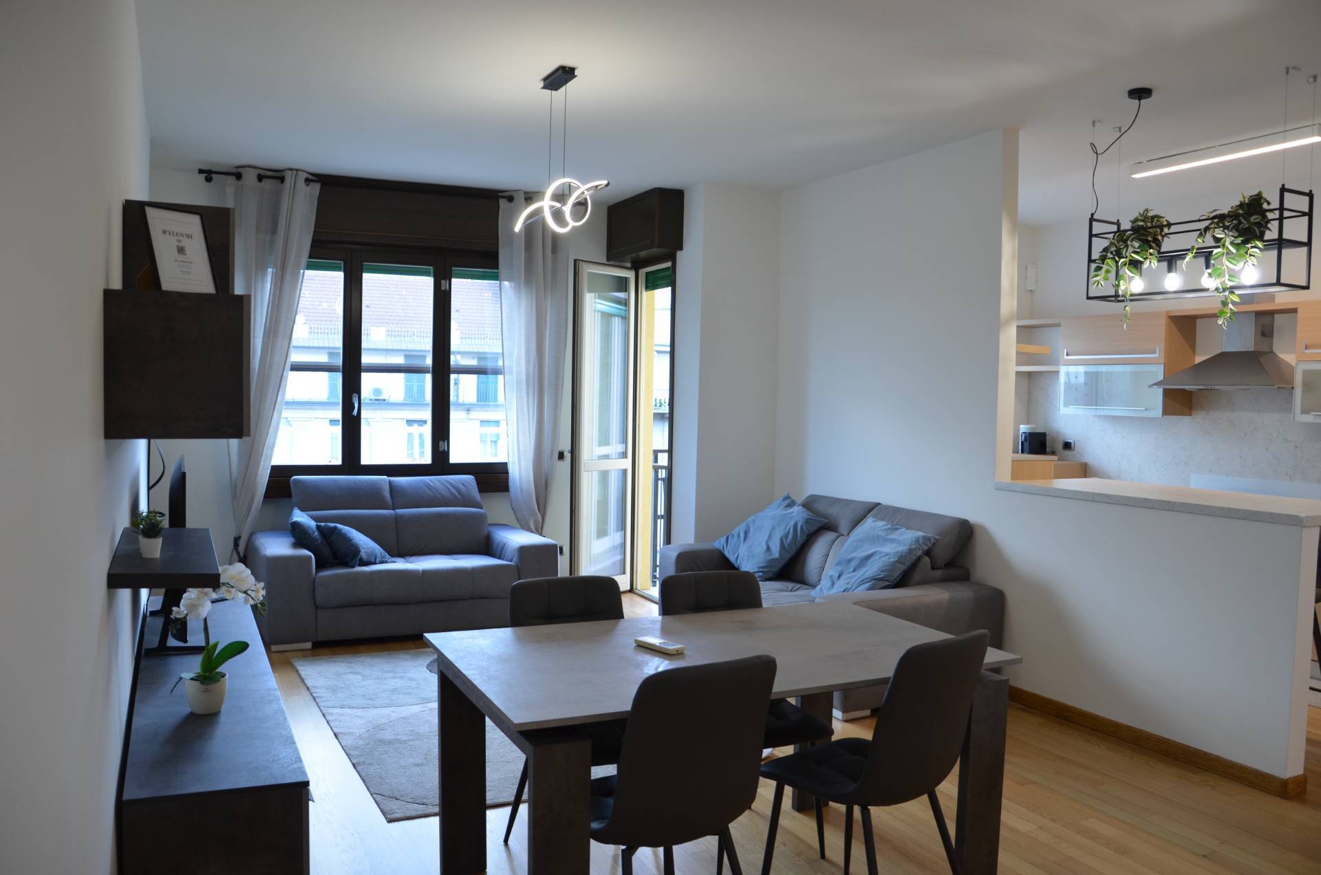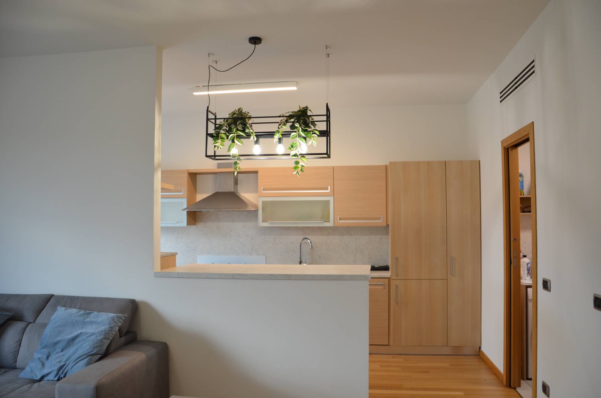 L'appartamento di circa 110 mq. composto da ingresso, cucina a vista, soggiorno, ripostiglio, due camere da letto, due bagni e due balconi, l'affaccio uno sul cortile interno e uno sulla via Leoncavallo.