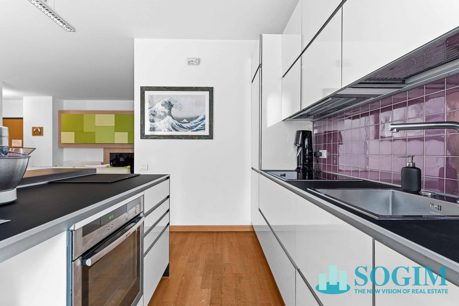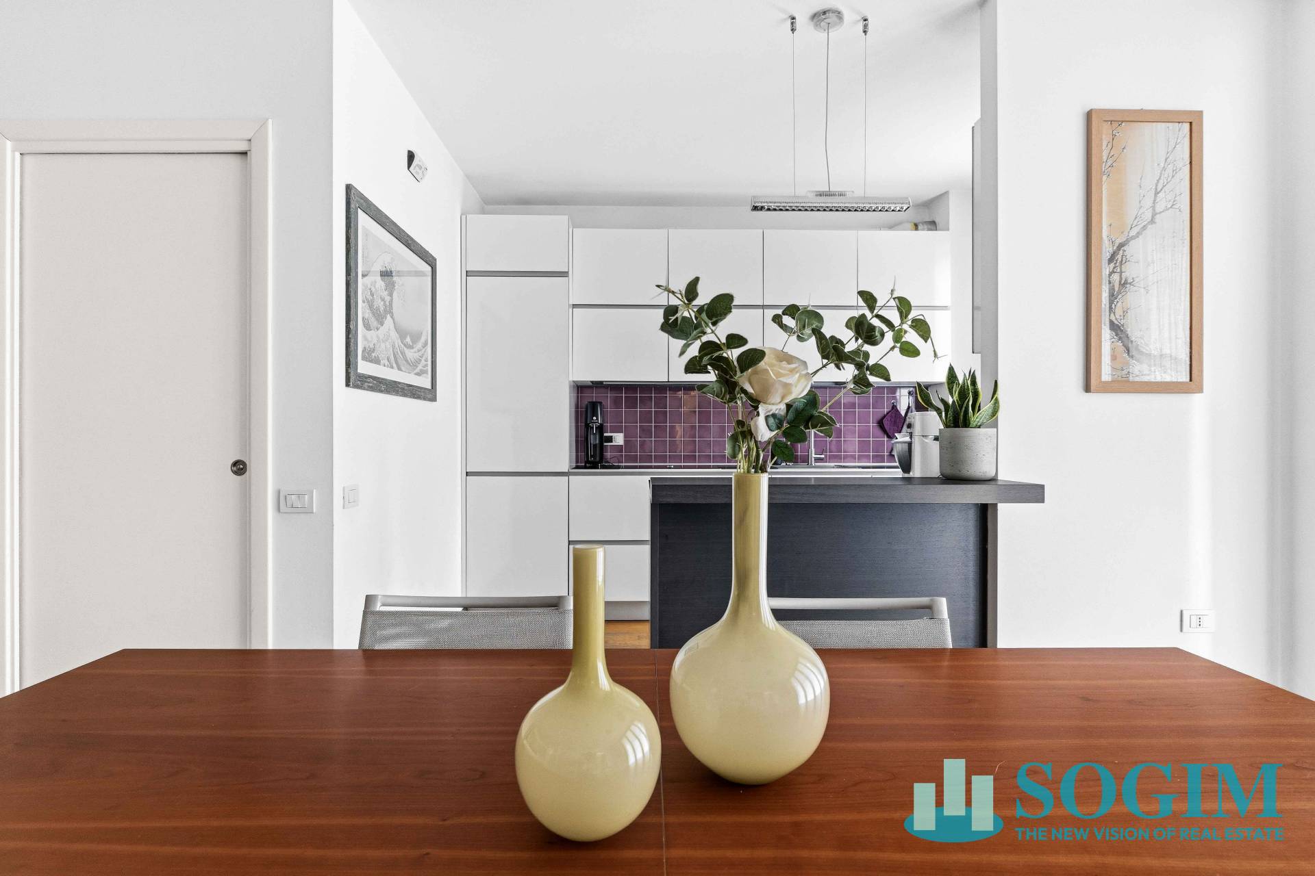 Lingresso conduce alla zona living con cucina a vista, pensata per offrire uno spazio conviviale moderno e funzionale.
