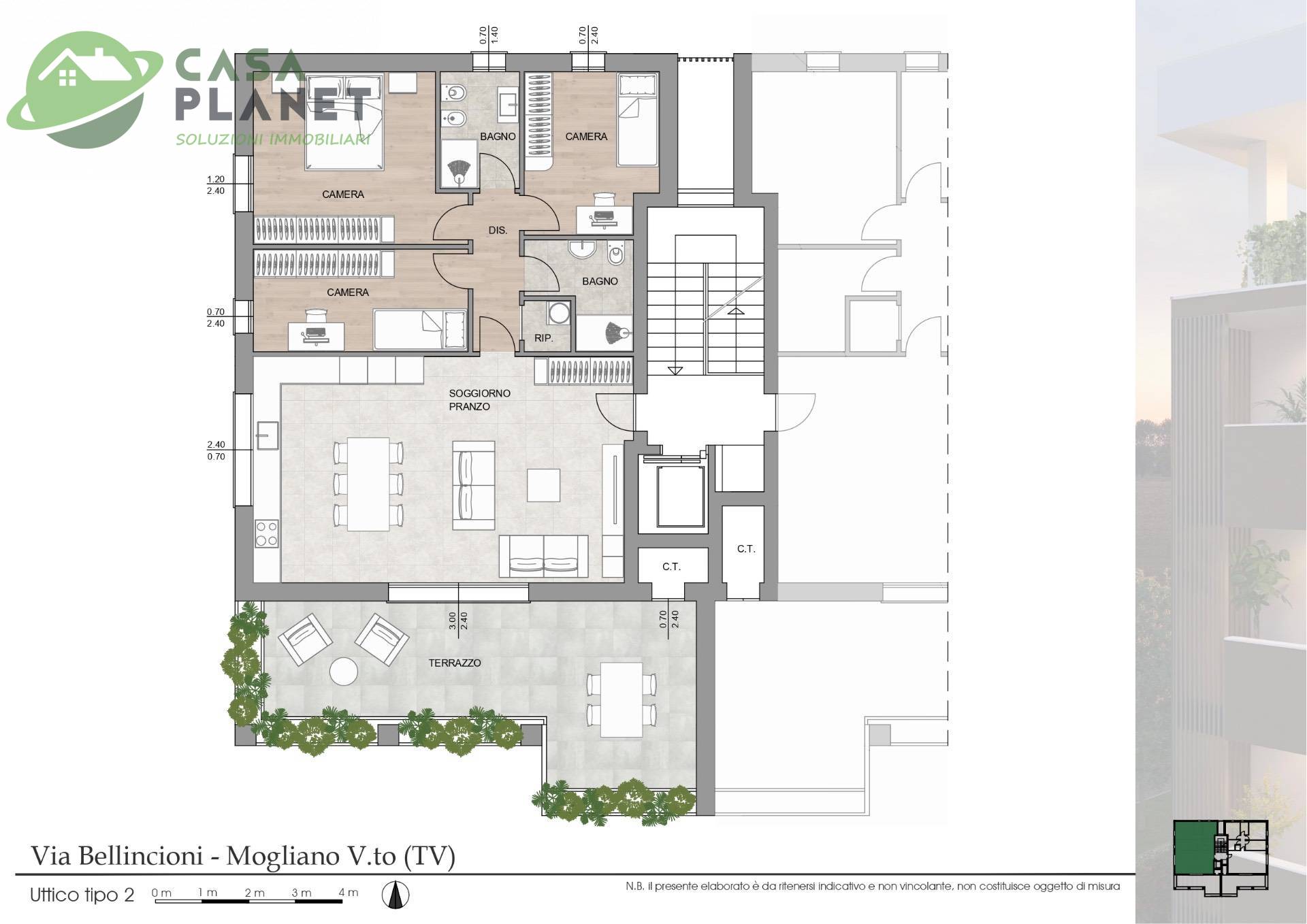 A Mogliano Veneto in zona ovest, in vendita attico in costruzione in consegna per fine 2026, al terzo e ultimo piano con ascensore, composto da ampio soggiorno con cucina a vista, 3 camere, due bagni e ampia terrazza abitabile.