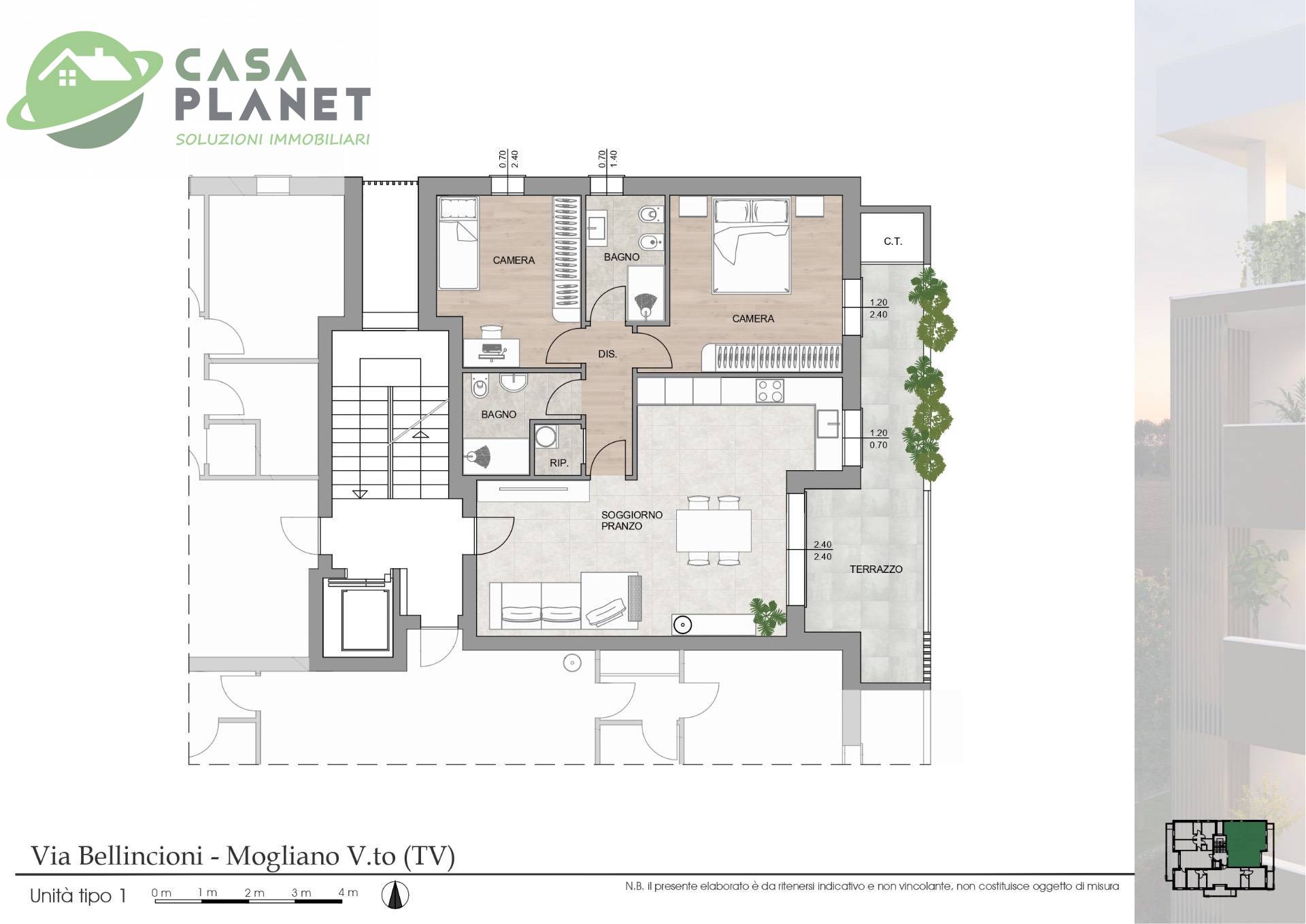 A Mogliano Veneto in zona ovest, in vendita appartamento in costruzione in consegna per fine 2026, al terzo piano composto da ampio soggiorno con cucina a vista, 2 camere e due bagni e ampia terrazza abitabile.