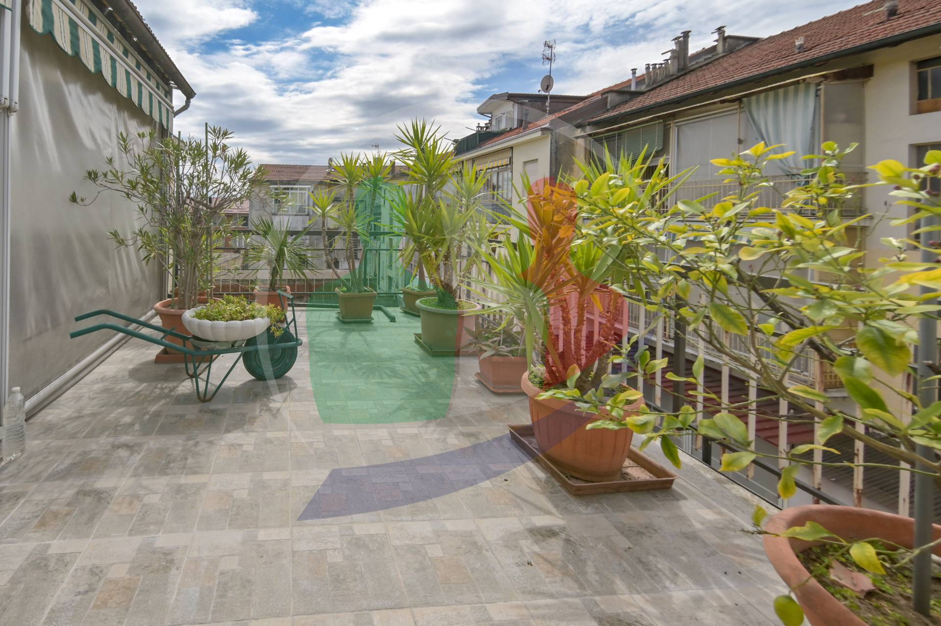 Il grande terrazzo di 30 mq, lato cortile, con accesso da una delle camere ha le tende da sole estive e invernali, dove organizzare feste e cene con la famiglia e gli amici, e per chi ama il giardinaggio vi lo spazio per abbellirlo di piante e fiori.