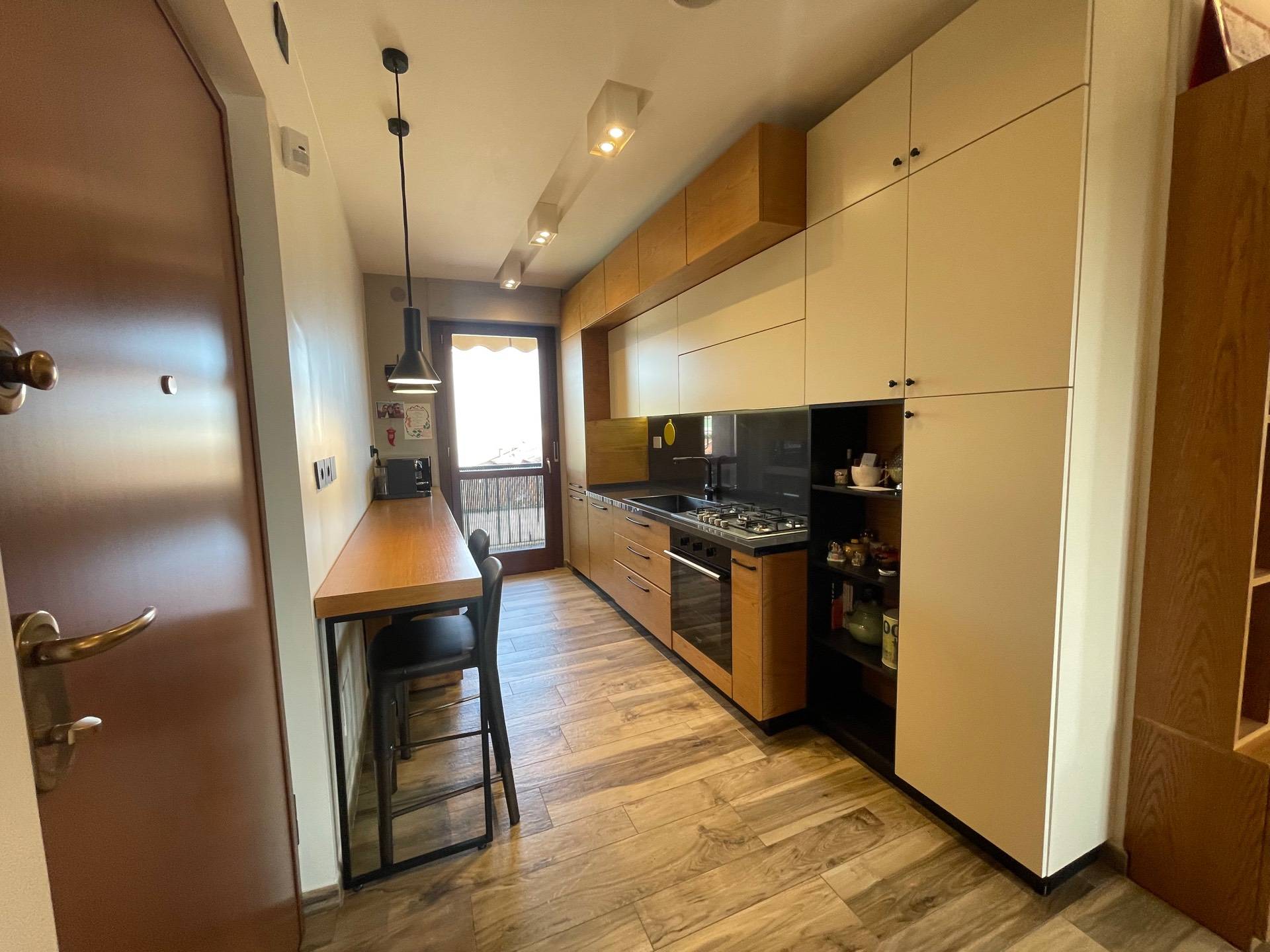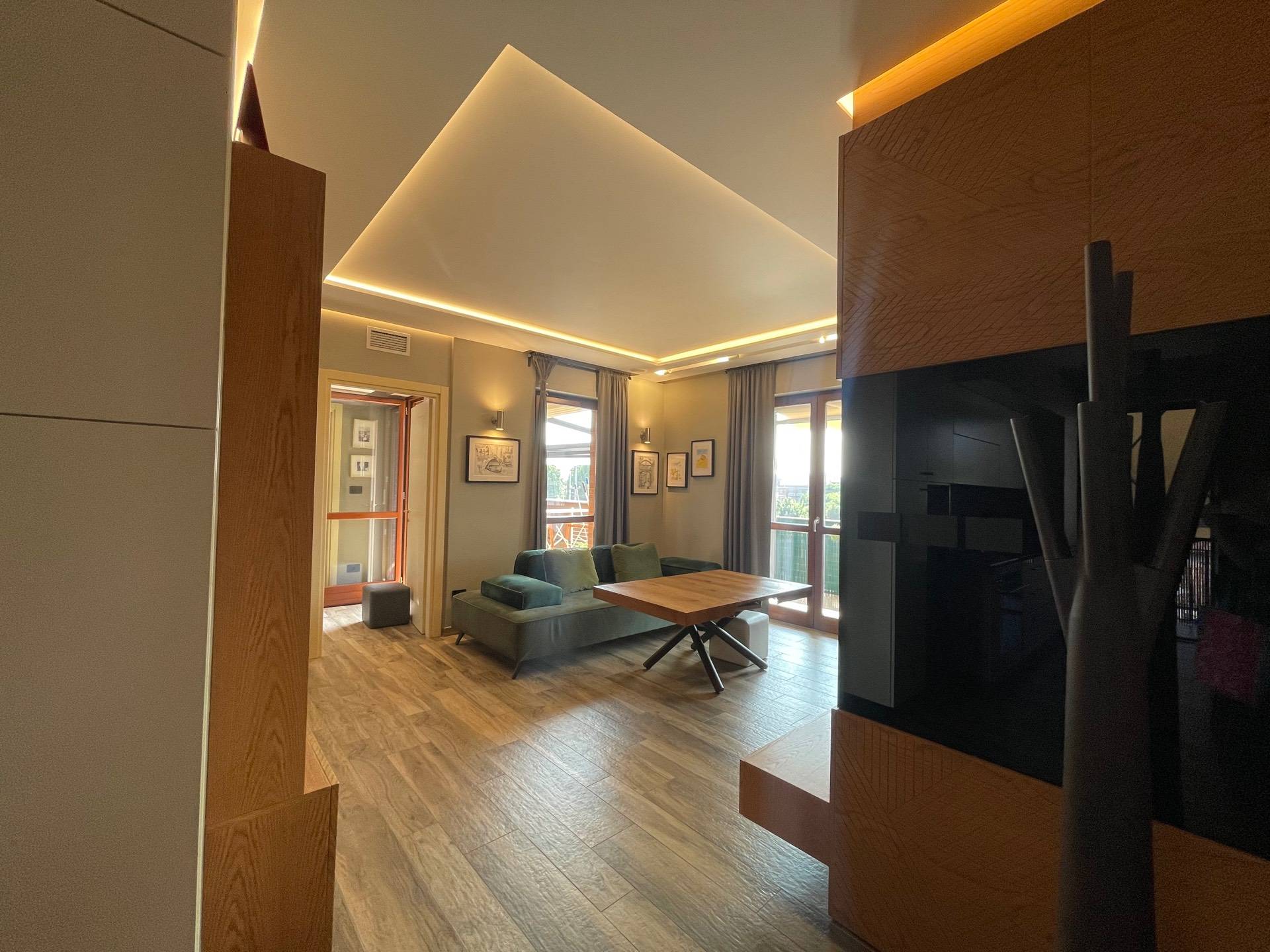 Si compone di ingresso sul salotto dal quale si accede ad un comodissimo terrazzo con vista sulle Alpi dotato di pergola bioclimatica che ne consente l'uso in tutte le stagioni dell'anno, cucina a vista ma riservata con accesso sul balcone dal quale si ha invece la vista sulla collina moncalierese e sul Castello, disimpegno, camera matrimoniale, seconda camera, bagno e lavanderia.