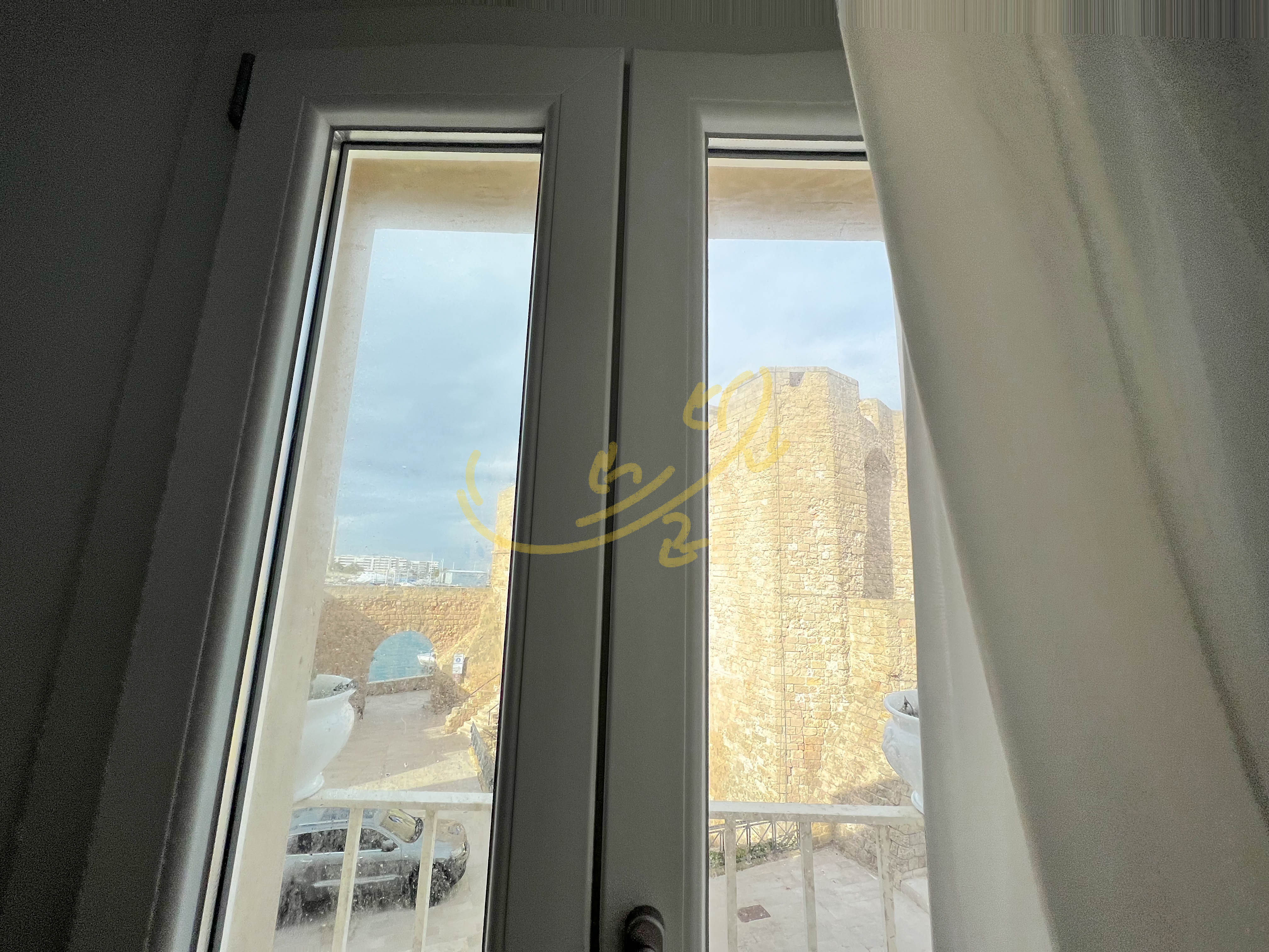 L'appartamento di mq 70 diviso in, soggiorno con volte alte a botte, esposizione su due lati: una grande vetrata con meravigliosa vista mare e una portafinestra con affaccio sul castello.