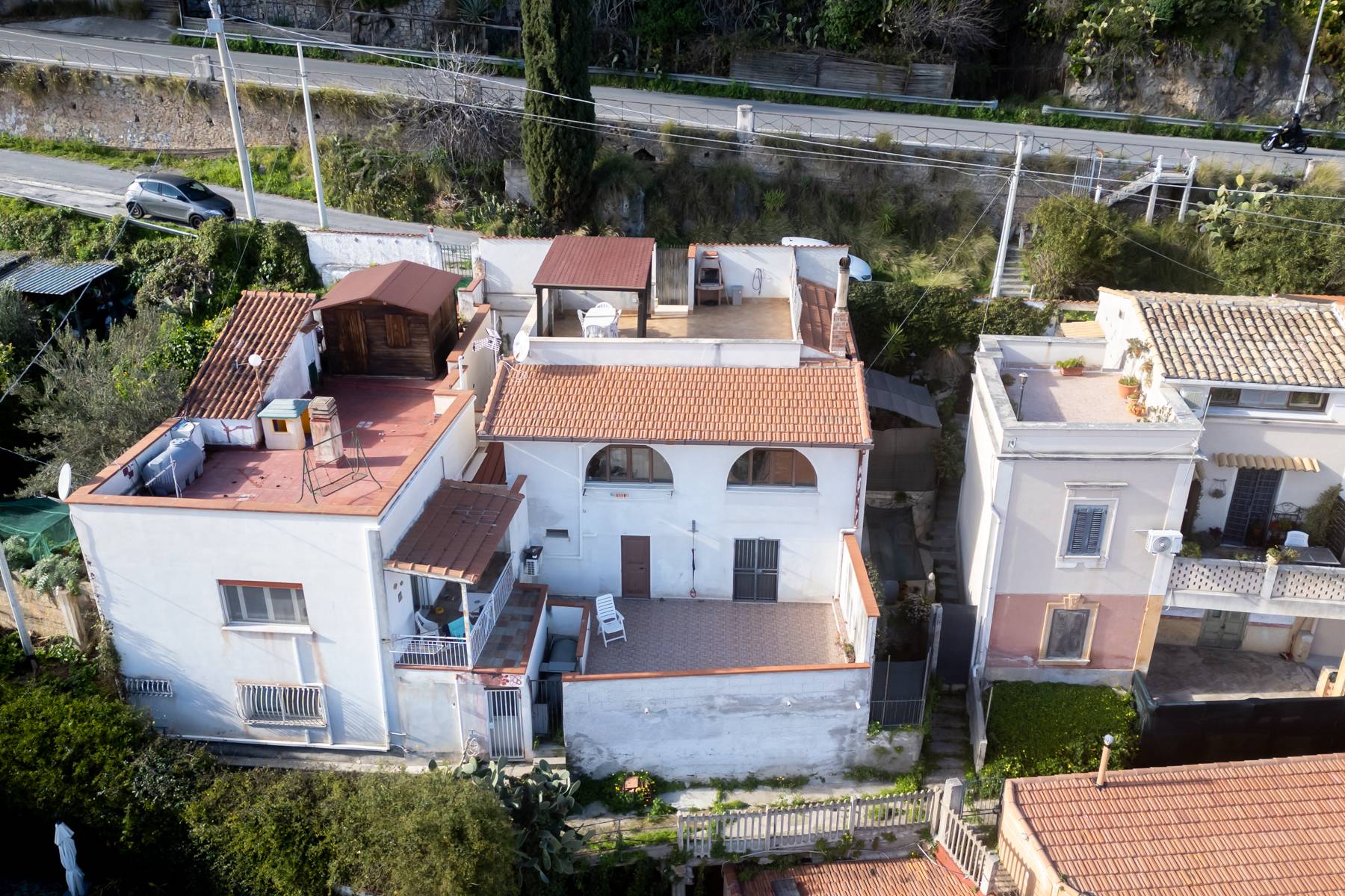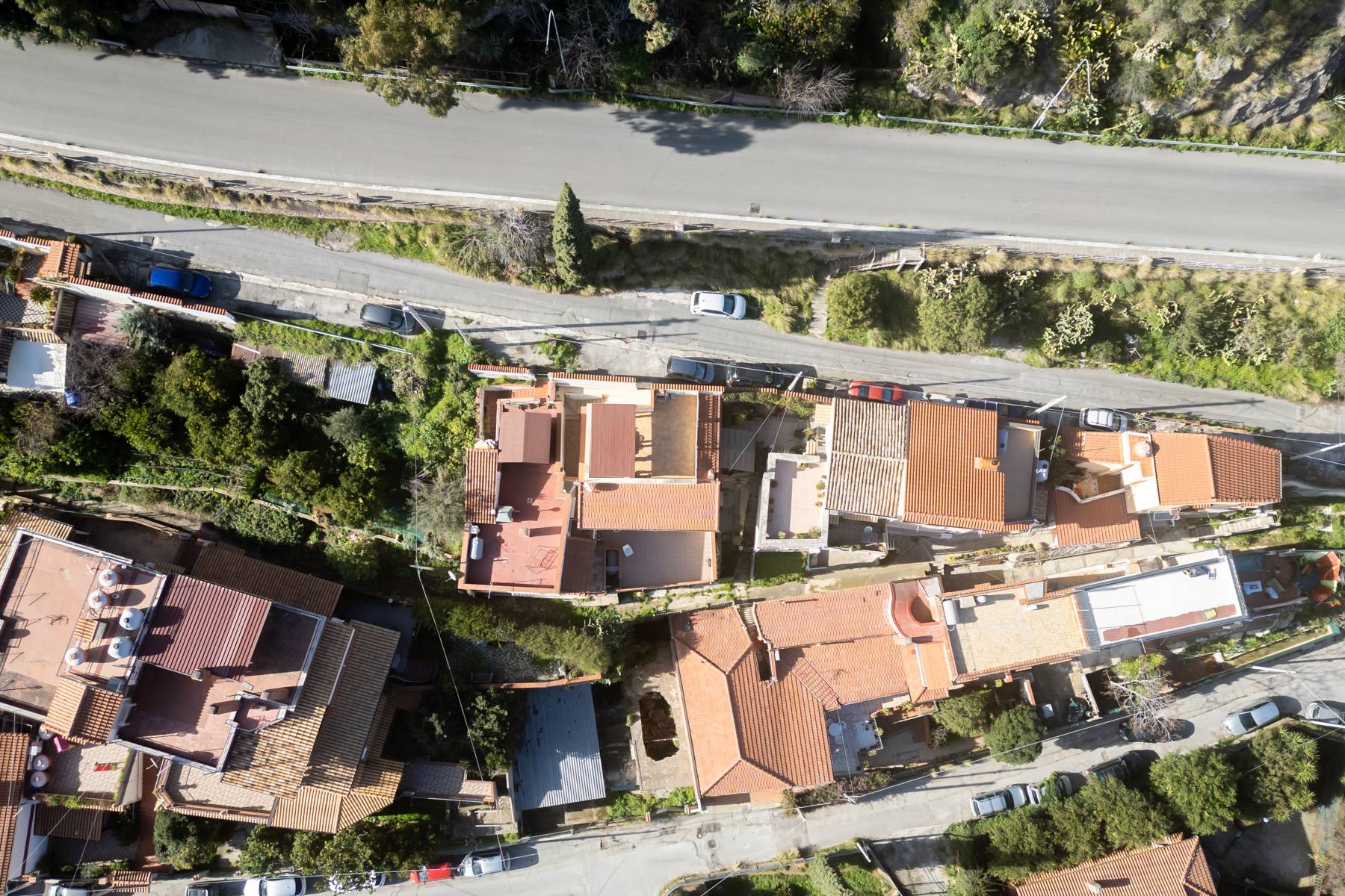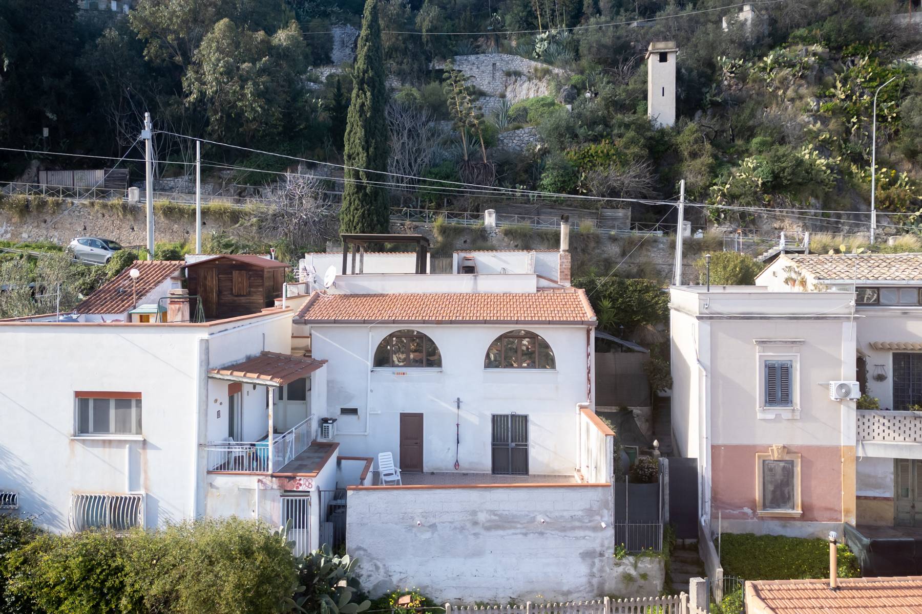 Terrazzo panoramico che guarda la citt fino al mare. Scala esterna in muratura che scende al primo livello con ingresso su disimpegno, soggiorno con camino a legna e un cucinino indipendente, camera da letto e wc oltre ripostiglio.