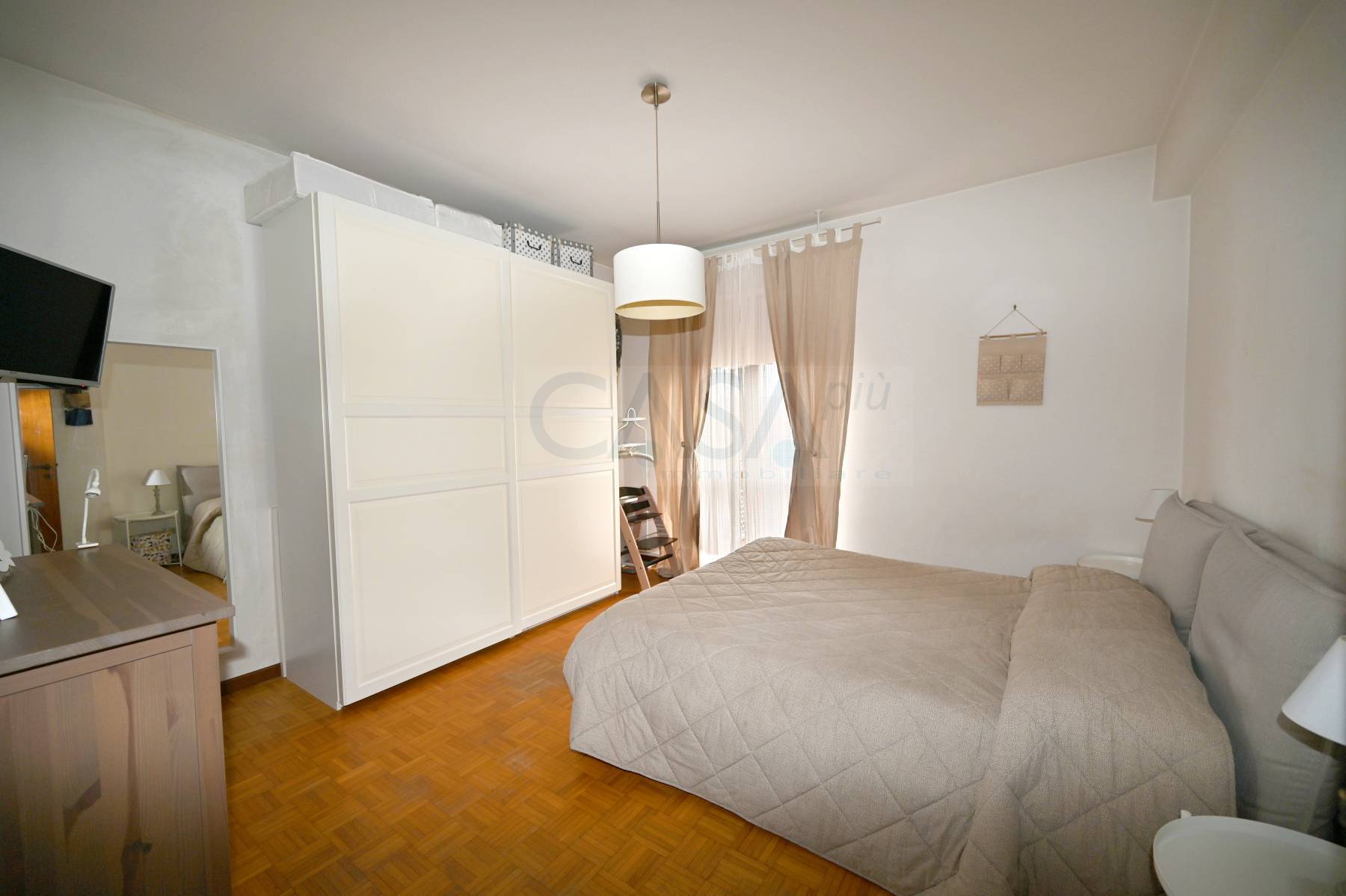 La superficie totale di circa 190 mq risulta cos distribuita: ampio soggiorno con balcone abitabile, cucina abitabile, una spaziosa camera matrimoniale, una camera doppia, bagno con doccia e finestra e ripostiglio, dove possibile realizzare il secondo bagno, tutte le stanze hanno il balcone; dal soggiorno una scala a chiocciola porta al piano superiore, leggermente mansardato, dove troviamo: ingresso su ampio soggiorno con camino, cucina abitabile con ripostiglio, due camere matrimoniali con leggere spiovenze e un bagno con doccia e finestra.