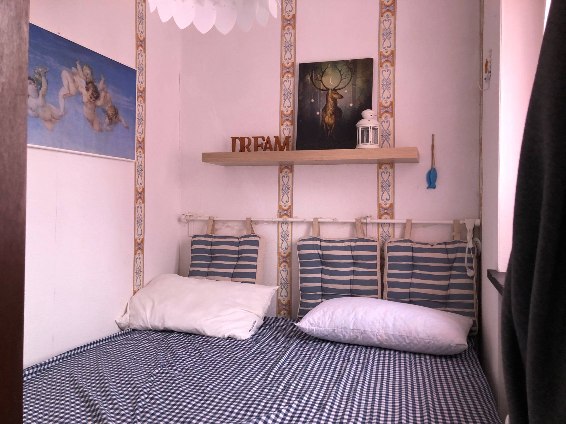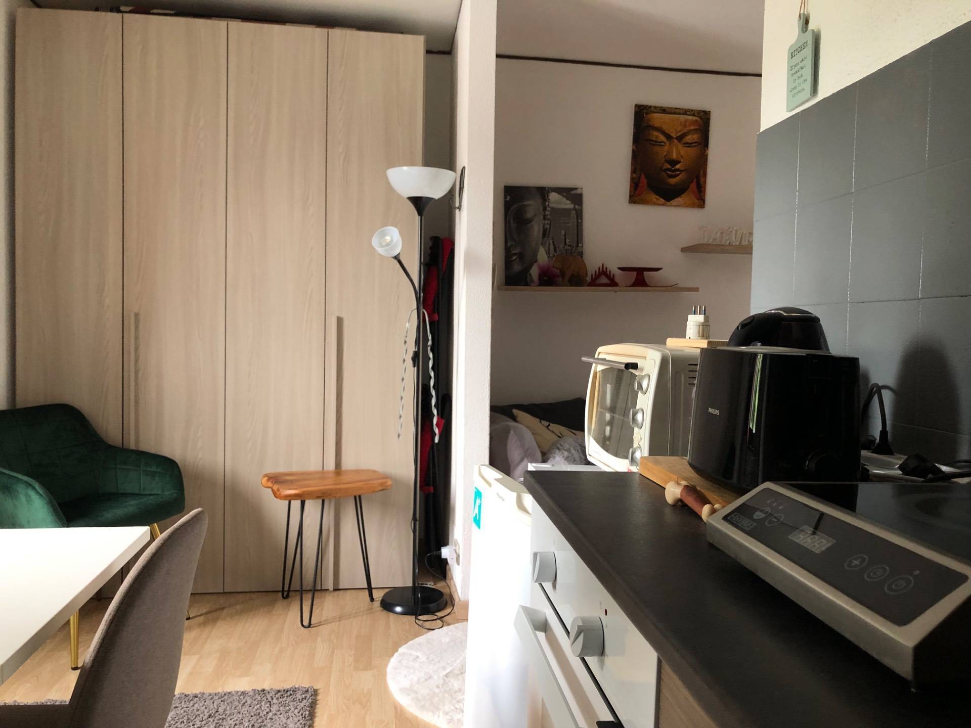 L'ingresso nella zona giorno con angolo cottura, cameretta e bagno.