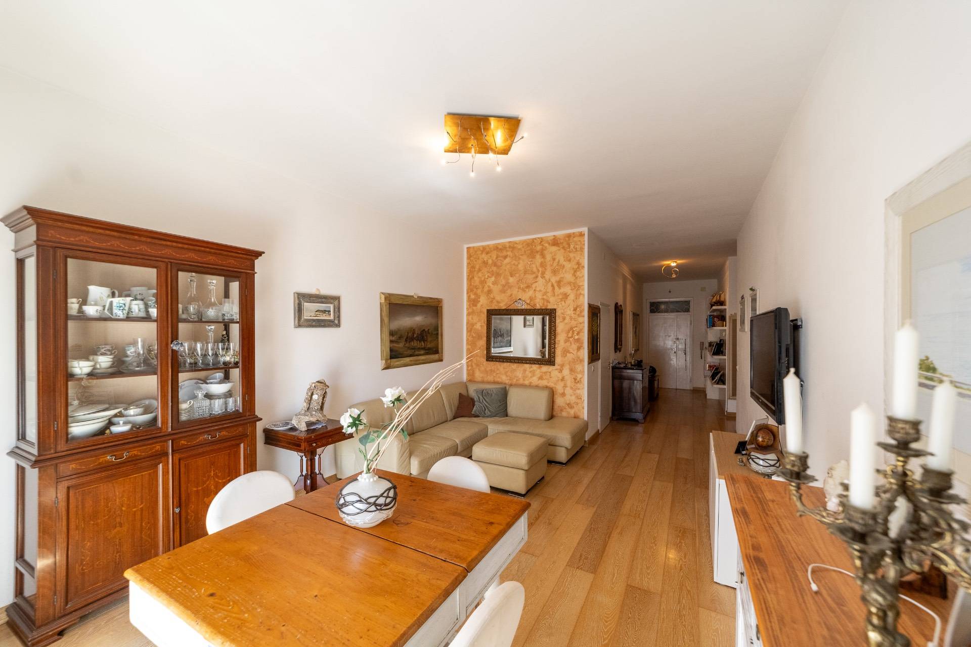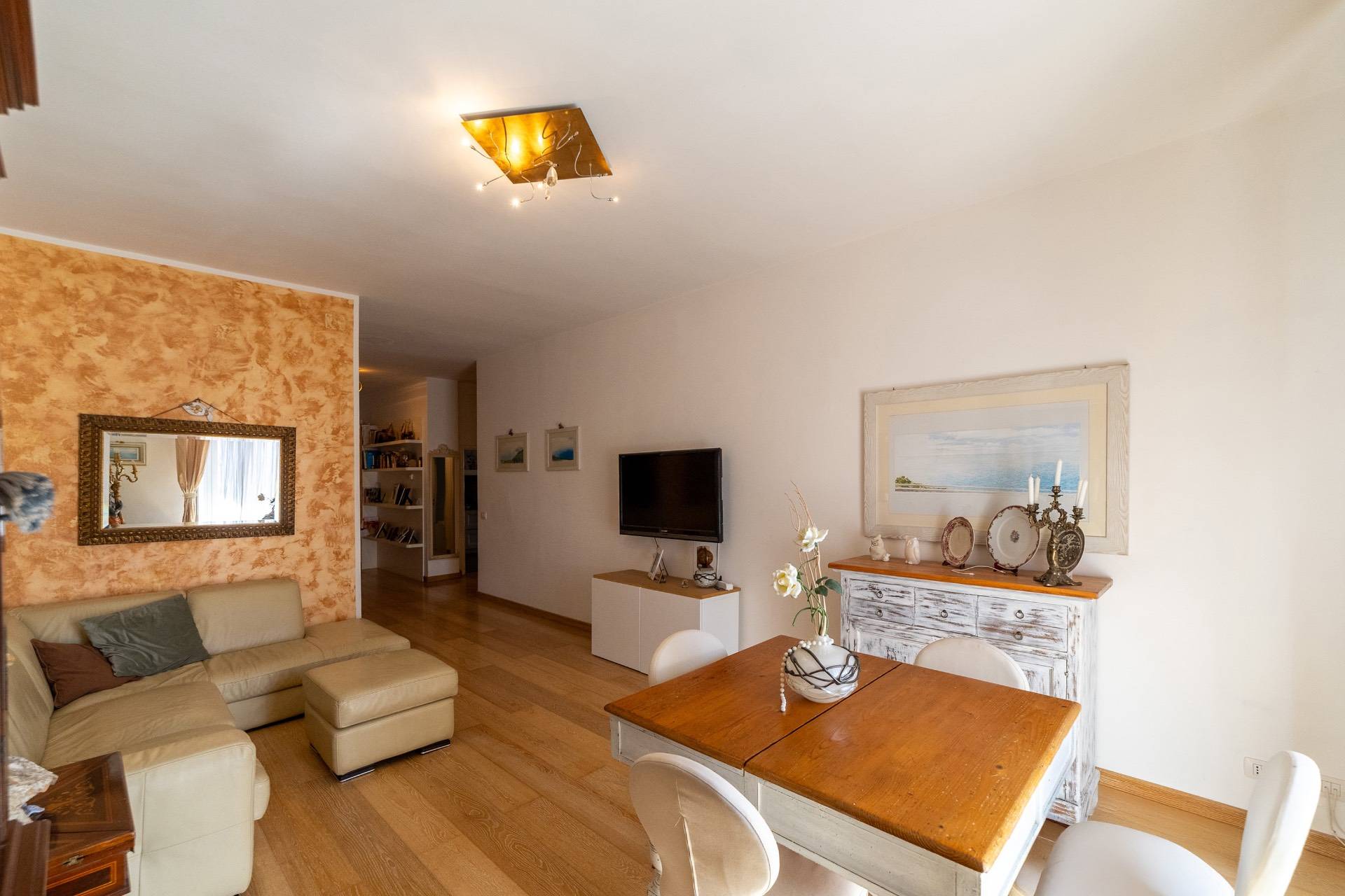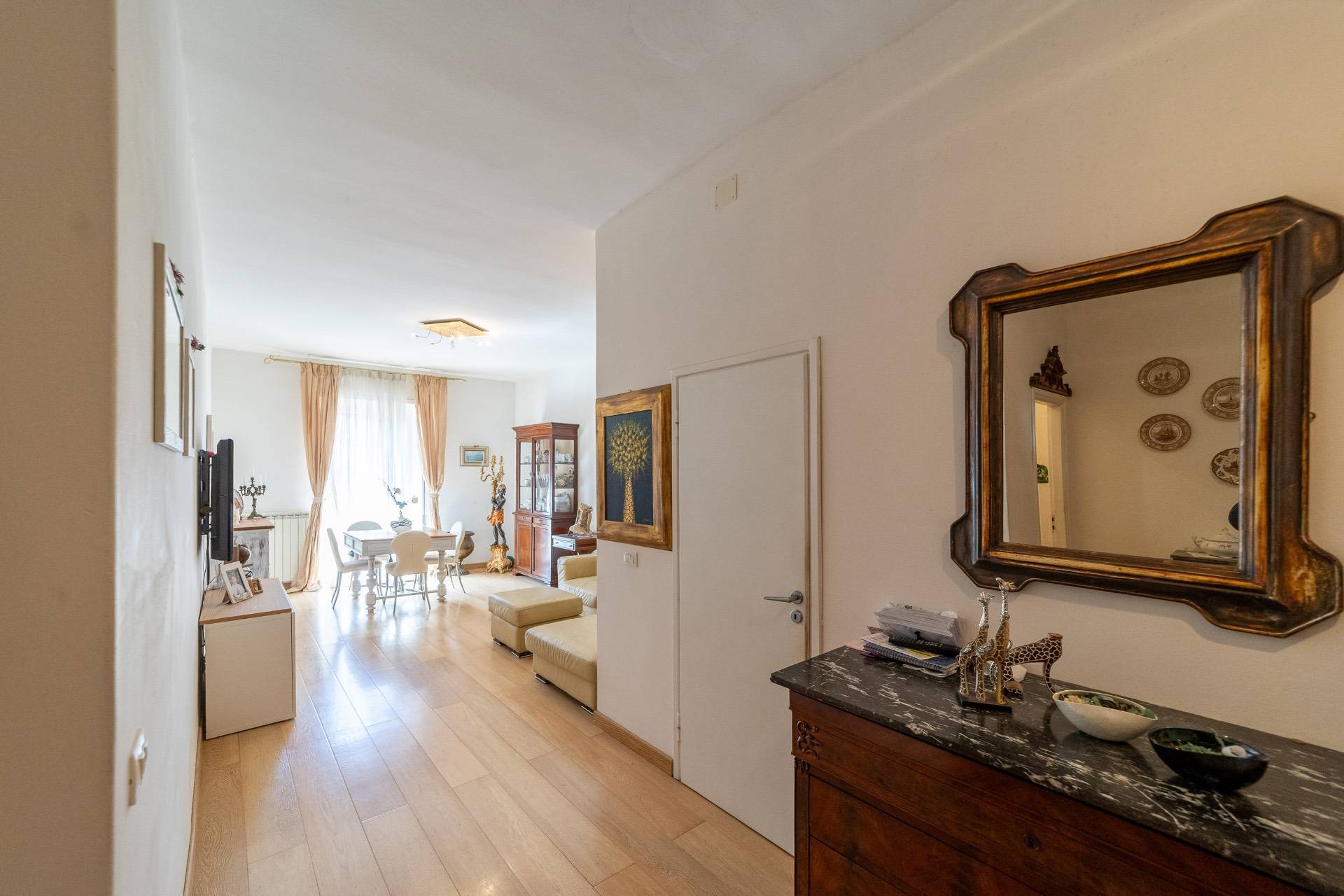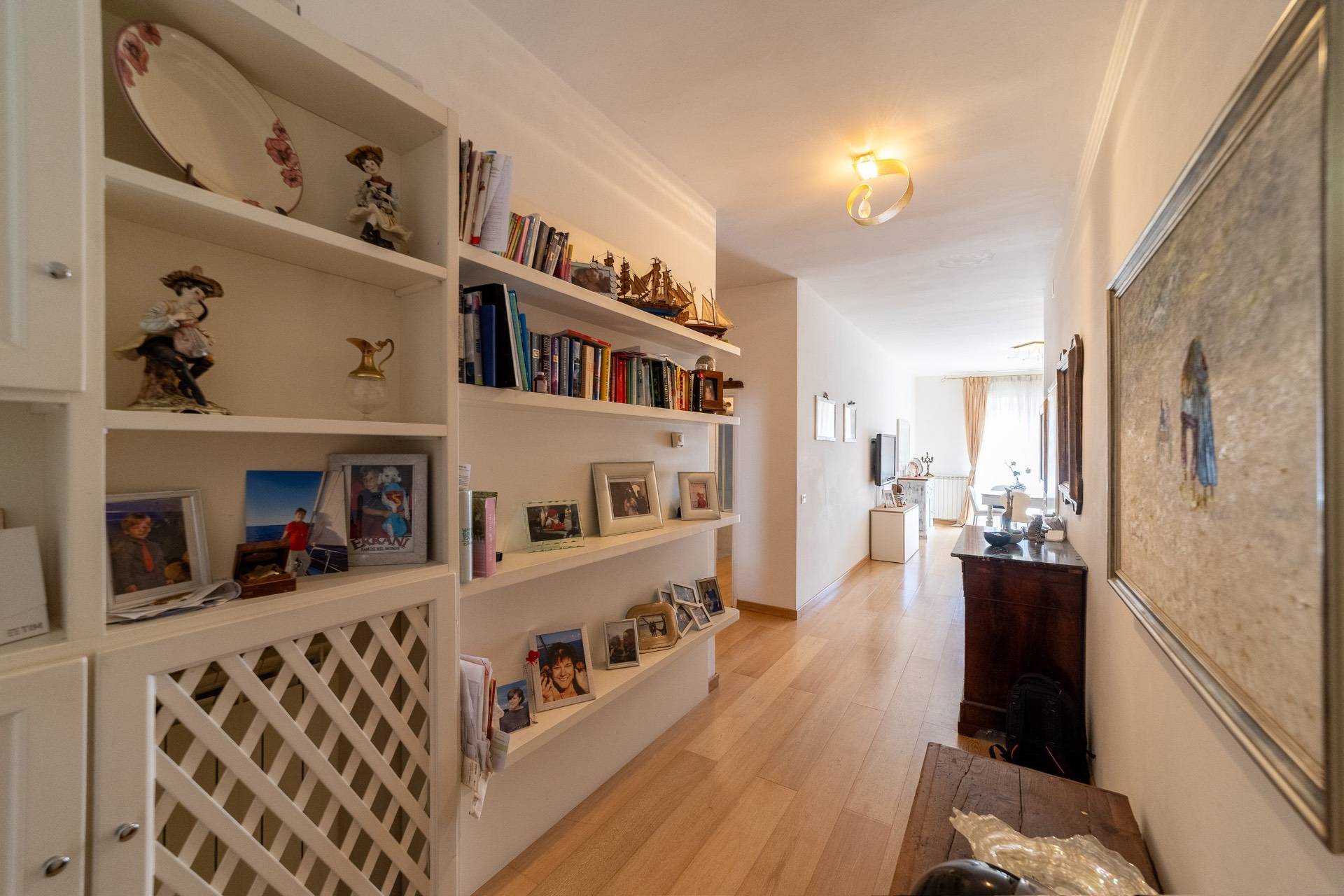 Entrando ci accoglie un pratico disimpegno che si sviluppa sul soggiorno con balcone abitabile, un piccolo studio, una grande e rifinitissima cucina, anch'essa con balcone.